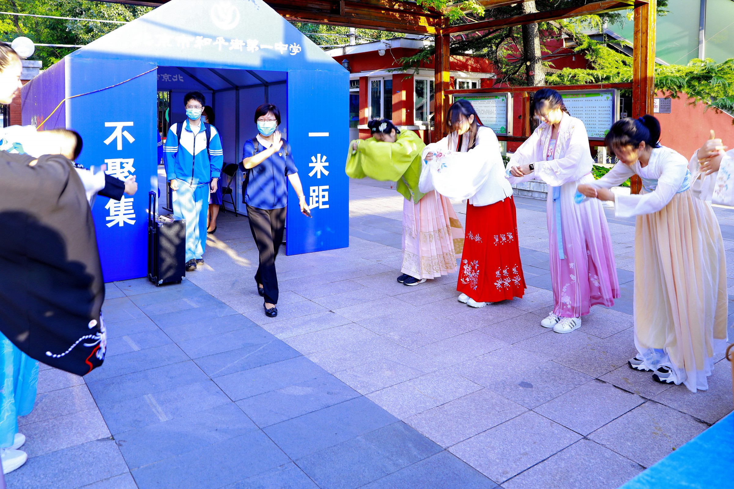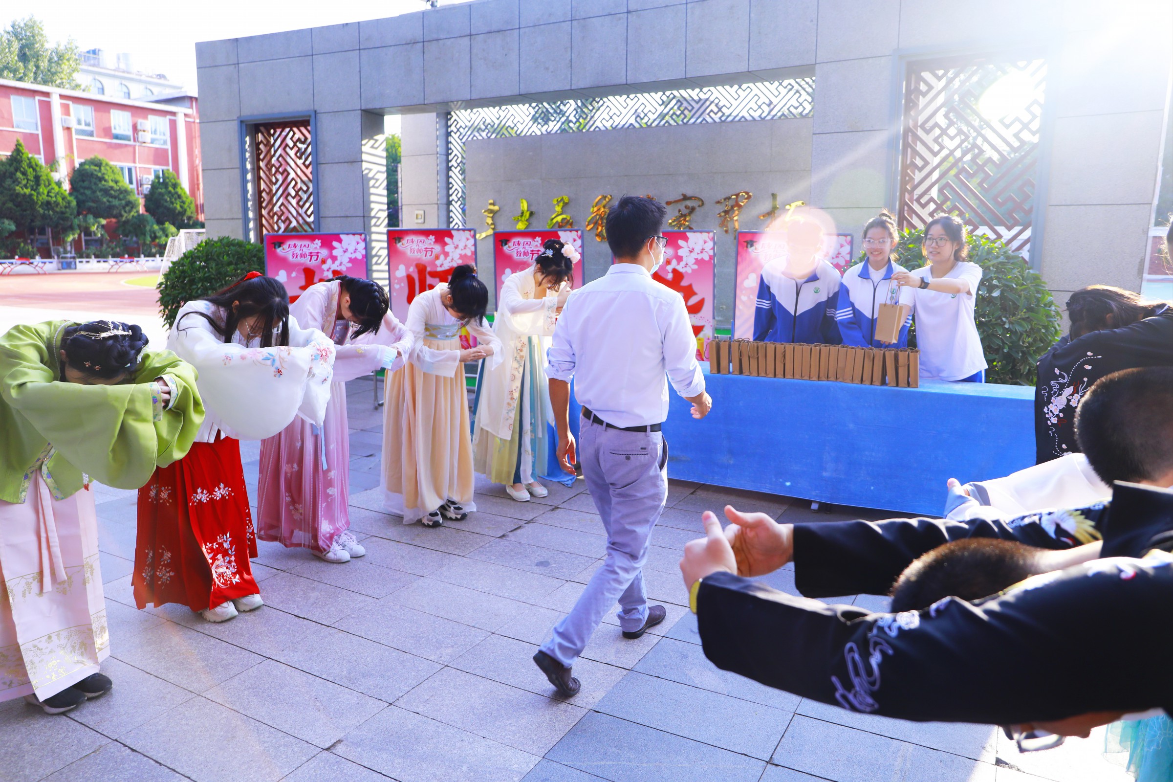 9月9日,学生会成员早早的到校就位,为入校的老师们送上学校准备的小礼物,以及学生们自己写好的教师节感恩卡片,伴随身着汉服学生的声声祝福与拱手行礼,表达学生对老师最真诚的感谢和祝福,展现了泱泱华夏,礼仪之邦的精髓。在上午课间操时间,学校举办了小型的庆祝活动,同学们为老师们献上了歌曲表演及汉服展演,在弘扬中国传统文化的同时,也表达了学生对老师们多年教导与陪伴之情的感谢。