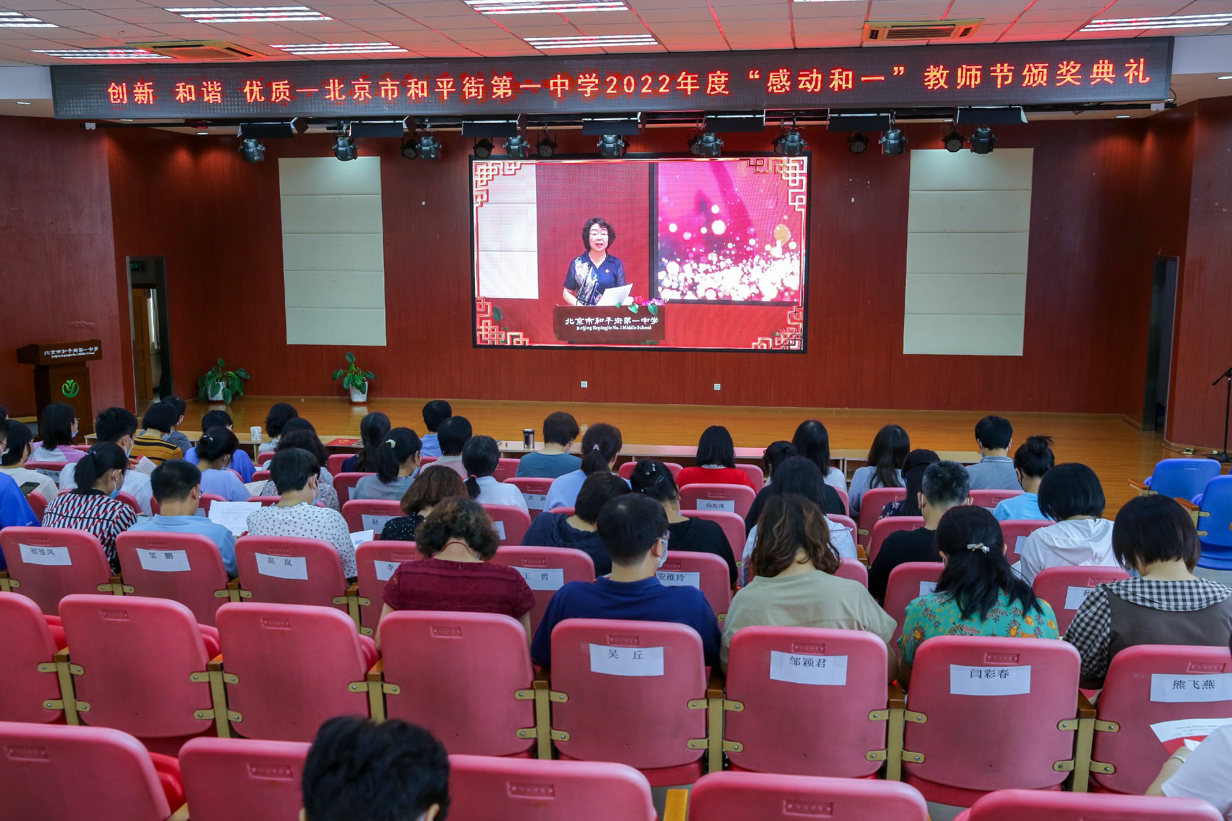 2022年9月13日下午,和平街一中隆重举行2022年度“感动和一”教师节颁奖典礼。六校区教职工分别来到校区指定会场,共同庆祝教师节这个重要的节日。根据疫情防控要求,本次活动改为录播和校区现场颁奖的方式进行。