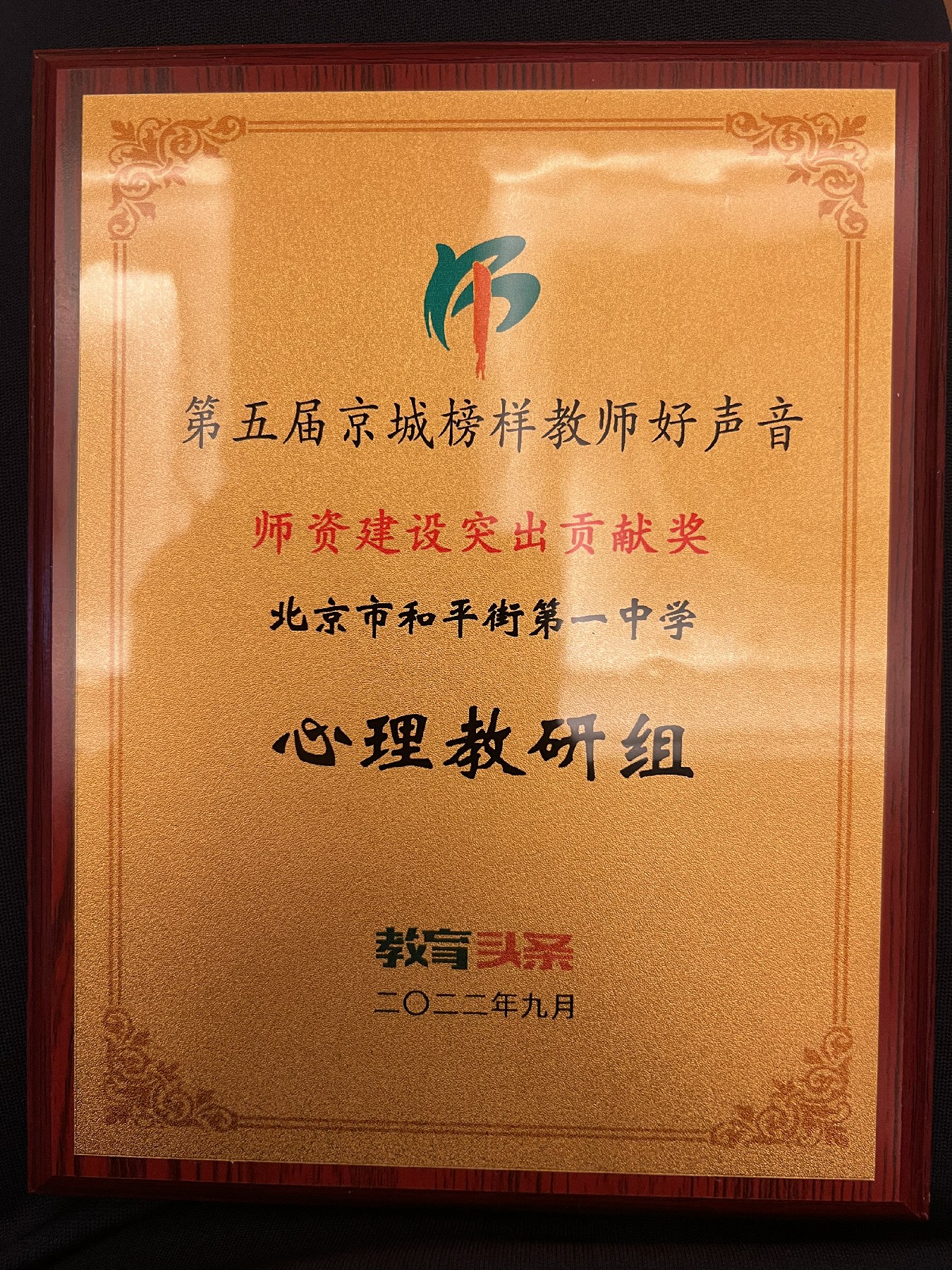 2022年9月17日,由《教育头条》主办的大型公益活动“第五届京城榜样好声音”颁奖典礼在京举行。出席颁奖典礼的嘉宾有:中国教育科学院研究员李继星、《教育头条》总编辑郑超以及京城百余名中小学教师。和平街一中心理教研组在众多候选团队中脱颖而出,被评为第五届京城榜样好声音师资建设突出贡献奖。