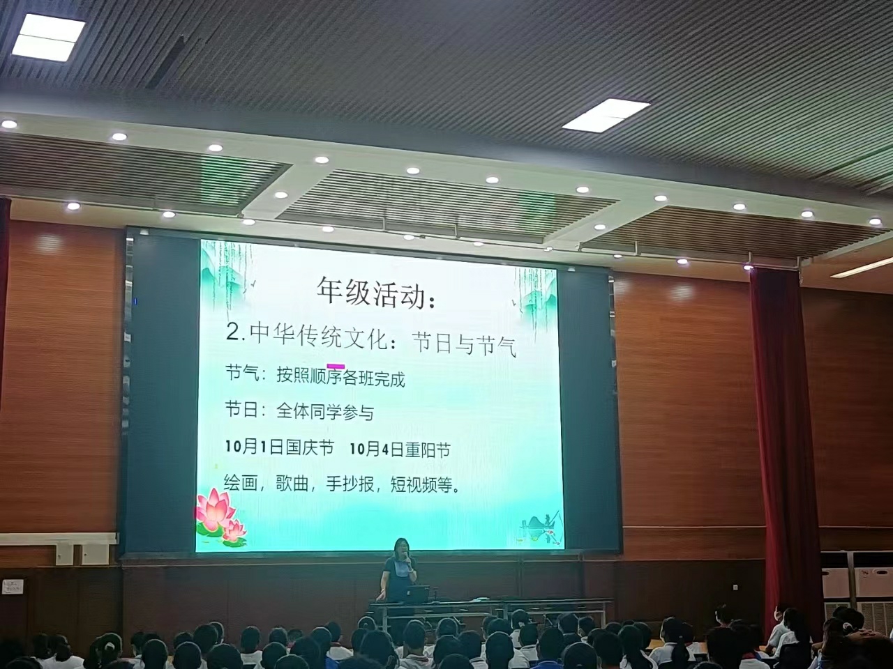 最后,陈老师解读了9月份至10月中旬年级将要开展的各项活动和评比,鼓励大家积极参加。陈老师总结强调自律、礼貌、学习习惯与日常纪律的重要性。因为自律,所以优秀,没有谁的幸运是凭空而来的,没有哪一份成绩不需要付出努力。希望同学们,从现在做起,用最少的悔恨面对过去,用最少的浪费面对现在,用最多的梦想面对未来。