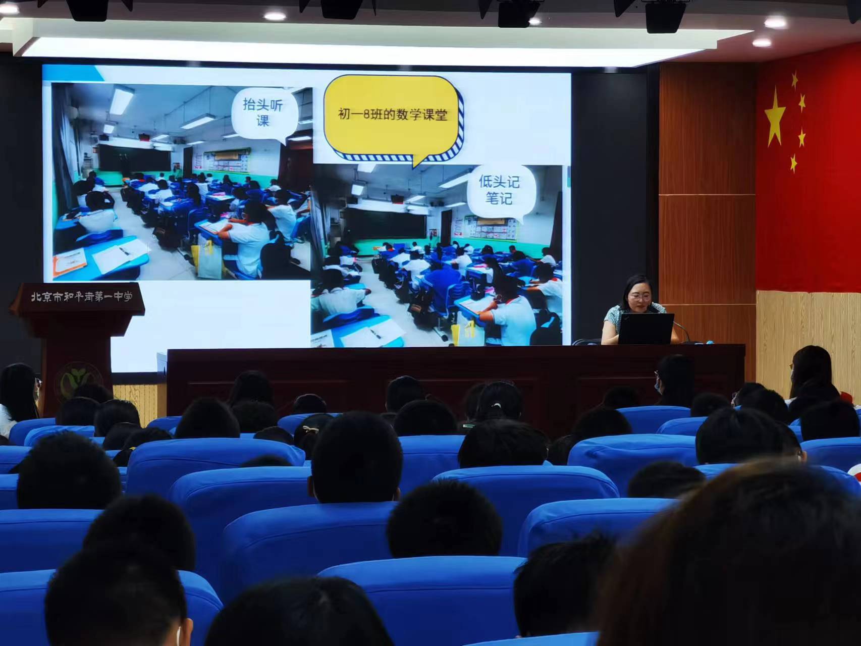 夏老师引用《论语》中“见贤思齐焉,见不贤而内自省也。”“三人行,必有我师,择其善者而从之,其不善者而改之。”这两句话点明会议主题。从早晨入校、课前准备、课堂要求、课间要求、课堂练习与课后作业及班级常规管理六个方面,向初一全体学生展示了榜样照片,照片中的学生自律认真,勤奋踏实,理解规则,服从老师的管理与指导,夏老师代表年级组呼吁全体同学向榜样看齐。