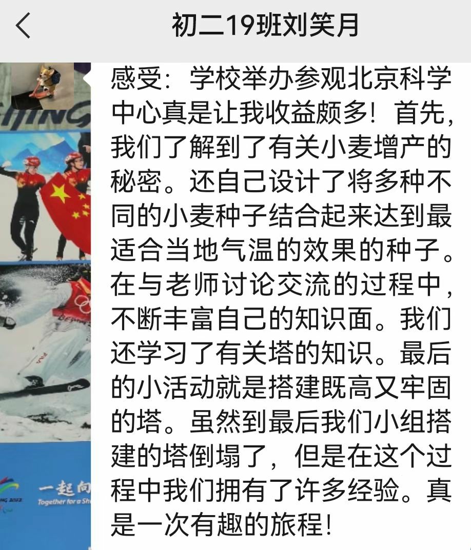 9月25日,初二年级师生来到北京科学中心,开展现场实践。科普教室中,“豆腐上的建筑”让孩子们借助豆腐和牙签体会建筑承重,由橡皮泥和牙签搭建的“牙签塔”正在经受“飓风”(书籍扇风)的考验;场馆里,“极地探险”单元解密雪龙号、“遗传与变异”区域辨析小麦与水稻的种子、“了不起的地铁”环节孩子们感受摩擦力与地铁的速度……丰富的科学实践活动牢牢吸引了孩子们的目光,在动手实践中感受科学的魅力。