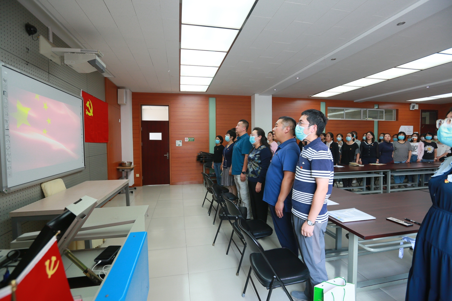 伴随着庄严的国歌声,党员发展会拉开了帷幕。首先,高睿和杨雪茹两位同志分别宣读入党志愿书,向大家汇报自己对中国共产党的认识,通过自己的学习和工作经历说明自己的个人能力,以及入党的动机和决心。随后,高睿同志的入党介绍人李秀兰和王雪、杨雪茹同志的入党介绍人王雅芝和张留英同志依次具体介绍对两位同志的思想觉悟、工作表现等方面的考察情况,表明同意接受高睿和杨雪茹两名同志为中共预备党员的意见;组织委员张东辉主任报告对两位同志的审查情况,明确两位同志符合入党条件。接下来,全体党员在充分讨论的基础上,进行无记名投票。党员同志们表示高睿同志工作有方法,具备主动学习意识、创新意识和大局意识;杨雪茹同志工作中能虚心向他人学习、具备付出精神,对待学生耐心有亲和力。听完党员同志们的讨论,入党积极分子纷纷表示自己要在今后的工作中虚心学习,时刻用党员的标准严格要求自己,争取早日加入党组织。
