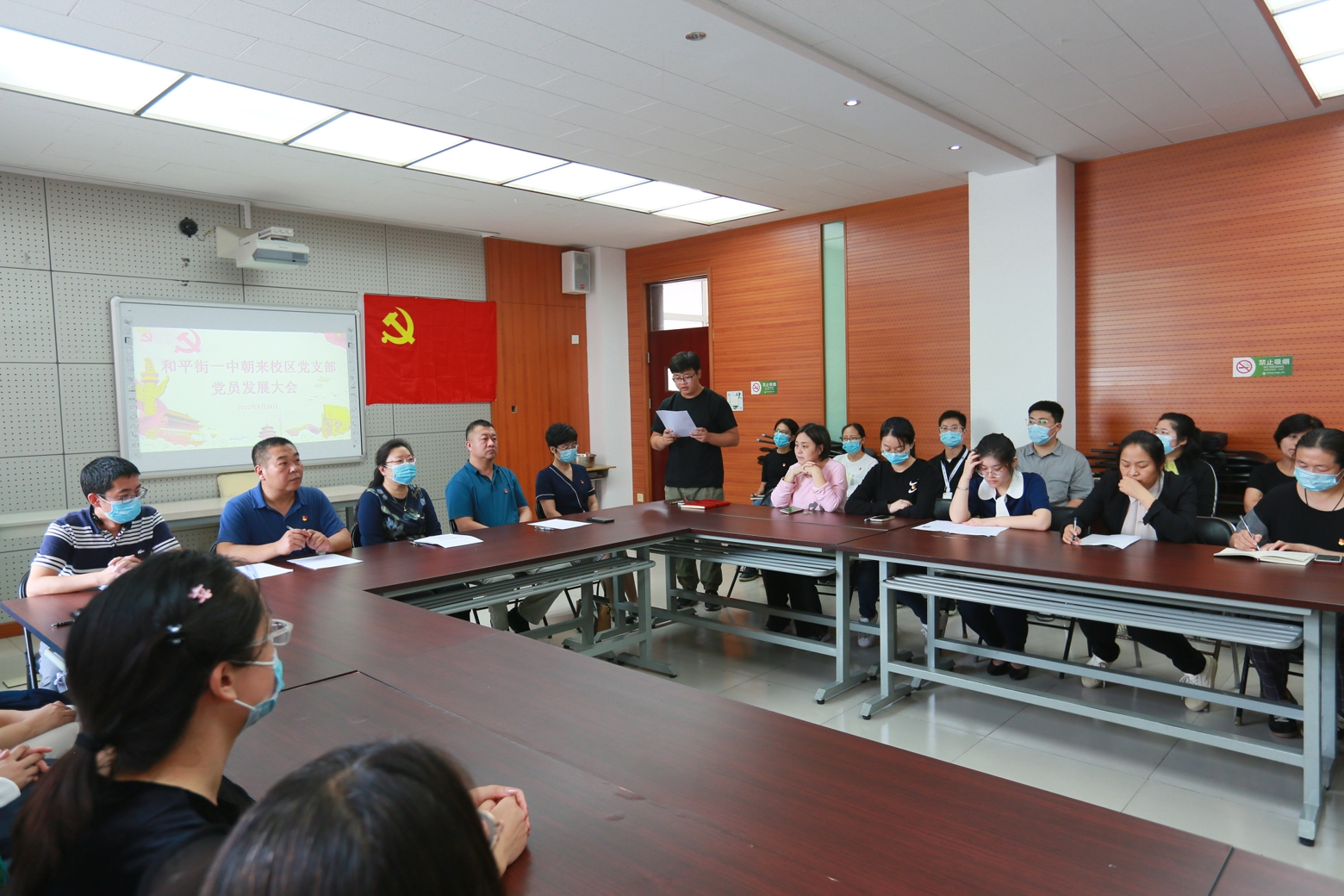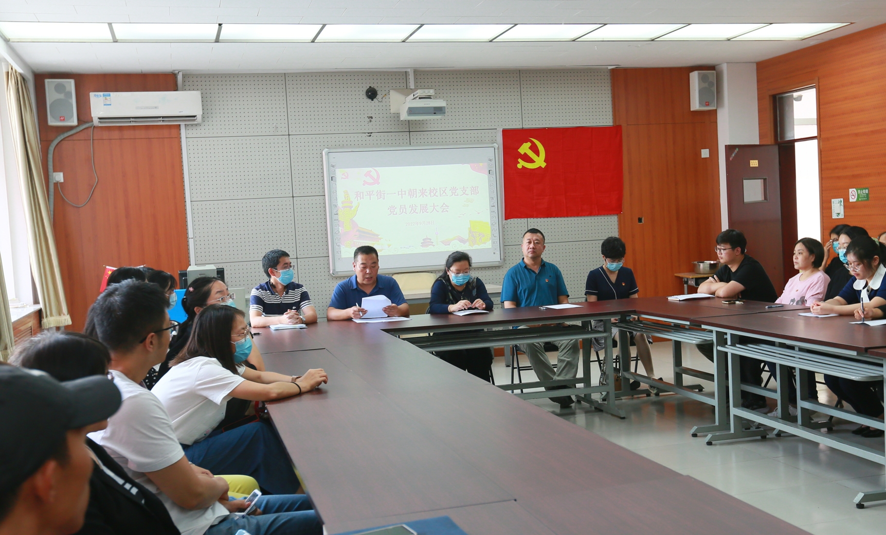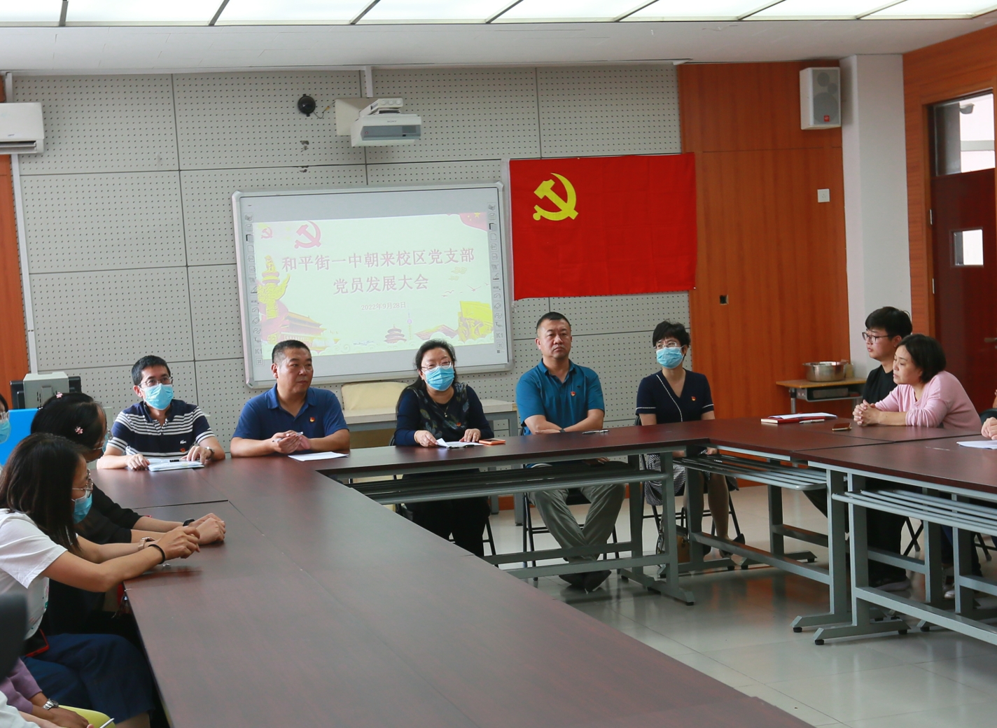 2022年9月28日,北京市和平街第一中学党总支朝来校区党支部召开高睿和杨雪茹两位同志的党员发展会。会议由朝来校区党支部组织委员张东辉主任主持,校区全体党员和入党积极分子参加会议,党总支办公室主任崔静、奥运村校区党员李翠格和石权同志列席本次会议。