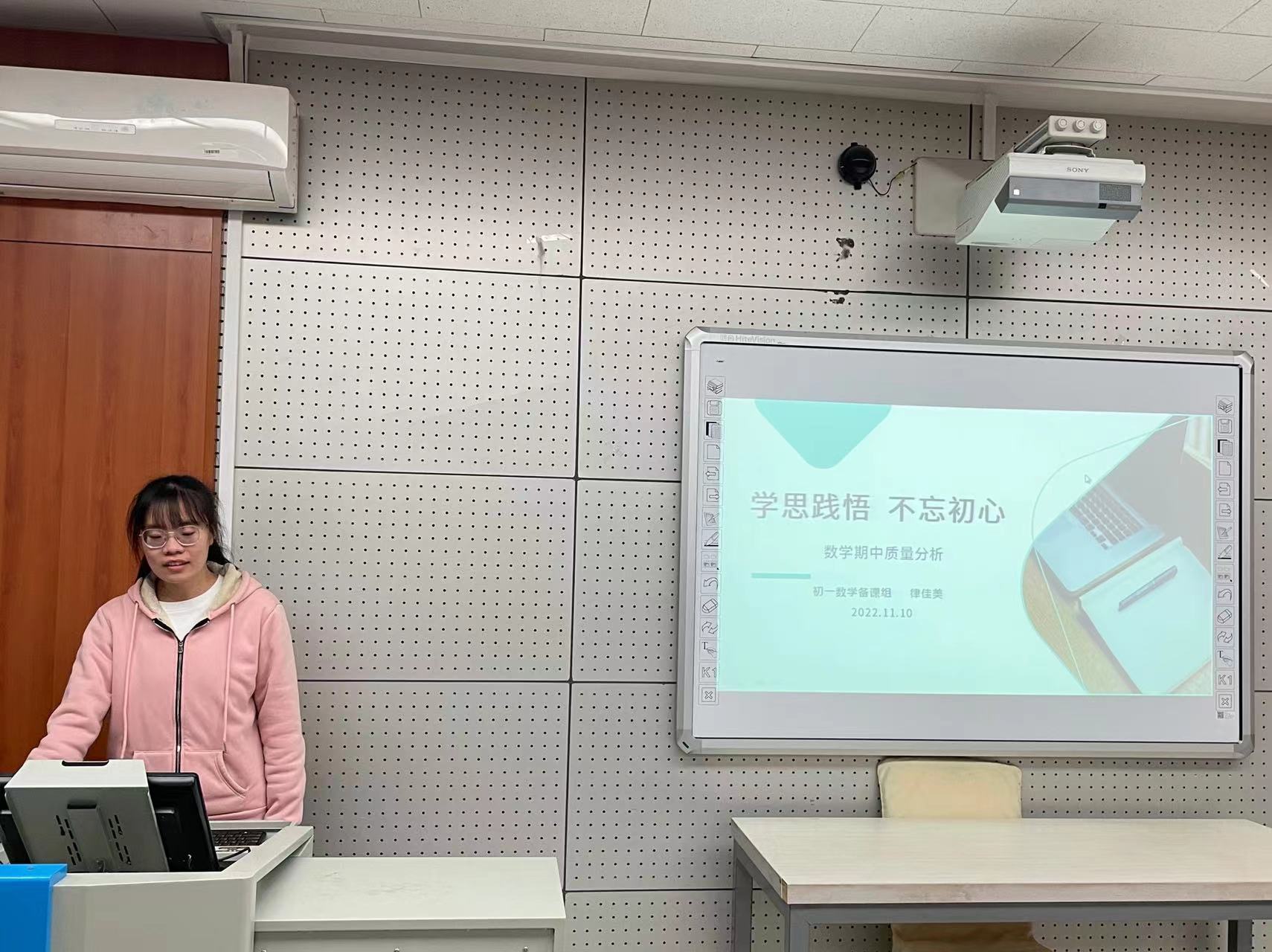 首先,陈莹老师结合期中调研考试的各项成绩数据,全方面多角度地对初一年级各个班级、不同学科的总体成绩进行了细致分析,客观指出本年级教学与学习中的优势及不足。之后对期中前的年级工作进行总结,列举不同班级的特点,肯定年级活动的优秀成果,并提出要继续坚持年级节气、节日活动的开展。最后陈老师对期中以后的工作方向做出指引,特别提出期中以后教师的工作重心由班级建设转向学法指导,设置分层作业,让学生成为集体的带头人。