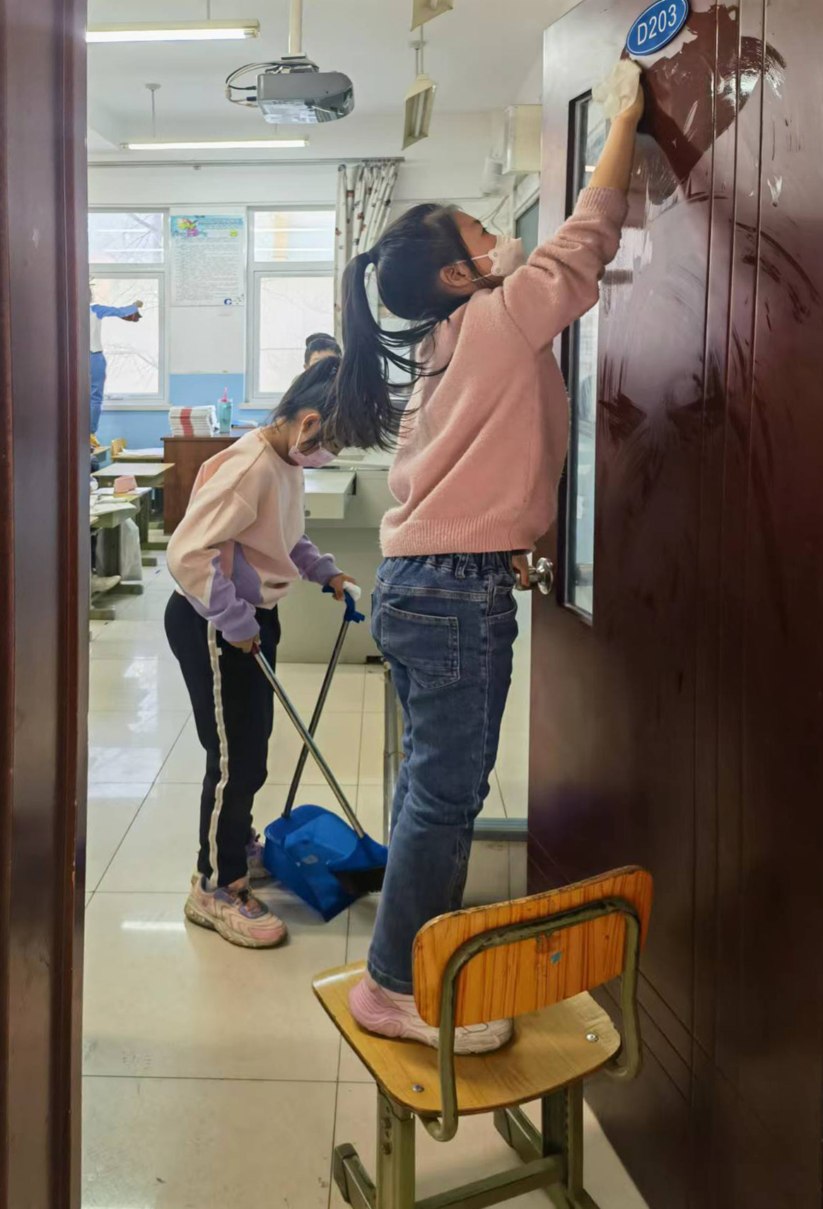 校区在强化课堂教学的同时,十分注重培养学生劳动意识和养成基本劳动的习惯。为了让劳动教育回归自然,激发学生爱班级、爱学校的情感,校区将每周五定为“快乐劳动日”,从班级、楼道保洁区以及环境文化布置等方面组织学生参与各种活动。在劳动实践过程中,同学们拿起扫帚、拖把、抹布等劳动工具,对教室、墙角、窗台等场所进行了认真清理打扫。同学们分工明确,各司其职,积极热情地参与其中,不放过任何一个卫生死角。