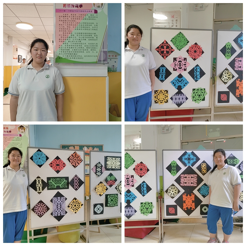 来自初二20班的赵丹同学,是个乐于助人,心灵手巧的女孩,被班级同学公认为“剪纸达人”。她的作品有着丰富的想象力,能够用简单的素材创作出丰富的图案。剪纸使赵丹同学变得开朗豁达,充满自信。