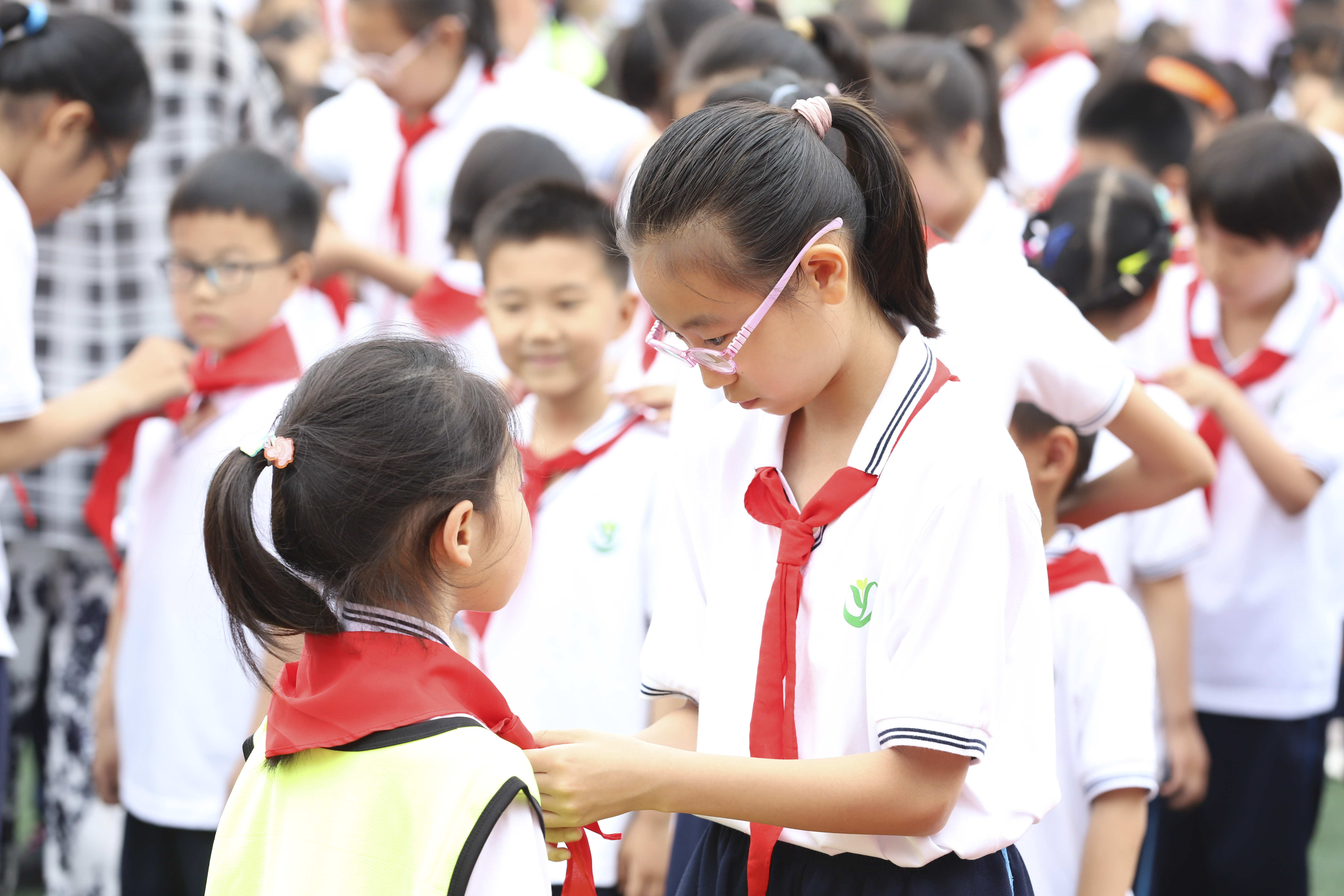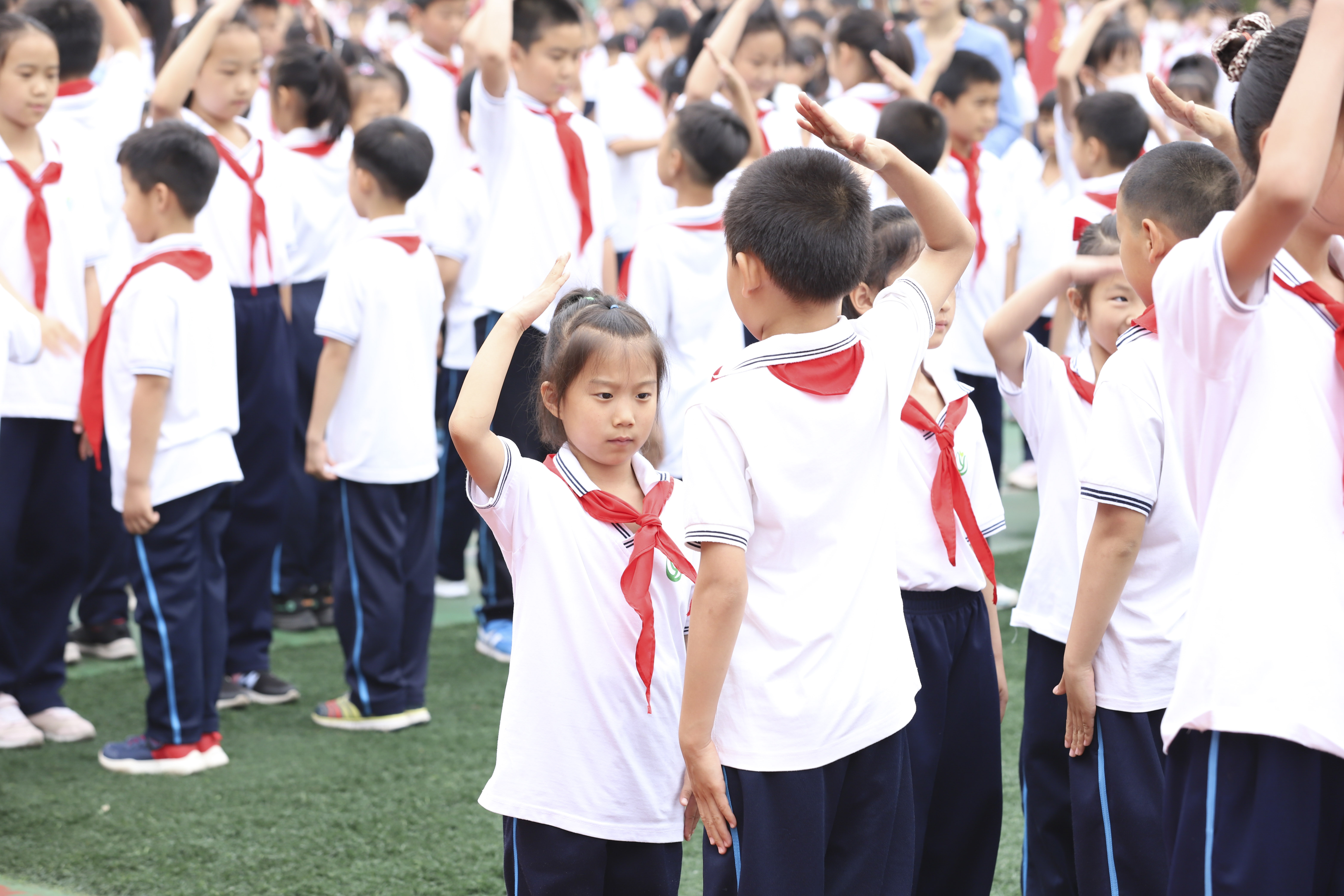 上午,伴着雄壮有力的出旗曲,旗手和护旗手迈着整齐的步伐进入会场。接着,全体少先队员齐声高唱队歌,嘹亮的歌声在校园内回荡。大队辅导员王焱本老师庄重地宣读152名新队员的名单,四年级的队员们郑重地为新队员系上鲜艳的红领巾。
