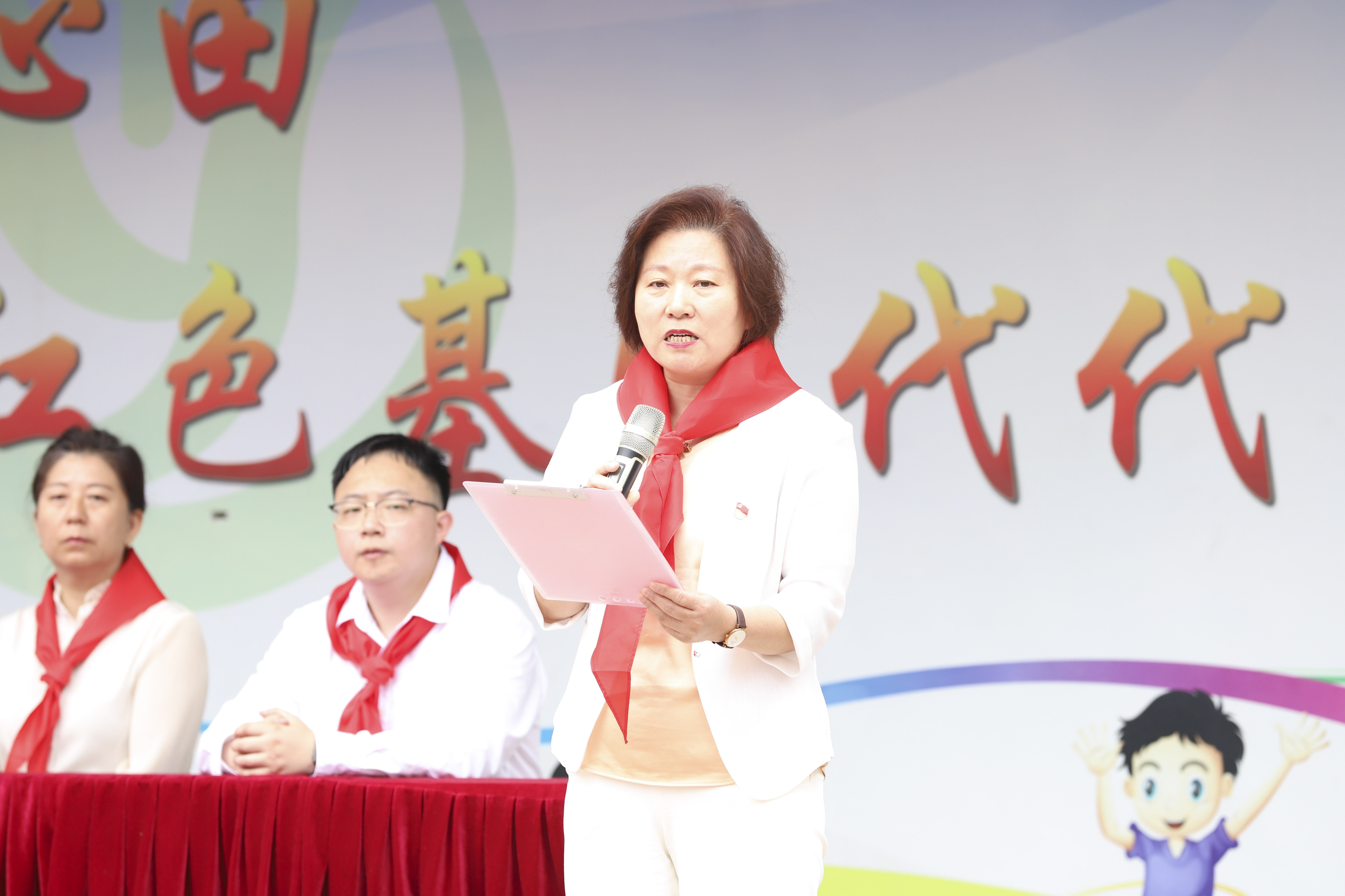 最后,清友园校区党总支书记、少工委书记殷桂萍讲话。她祝新队员们在队旗下茁壮成长,并勉励全体少先队员努力把自己锻炼成为合格的社会主义事业建设者和接班人。
