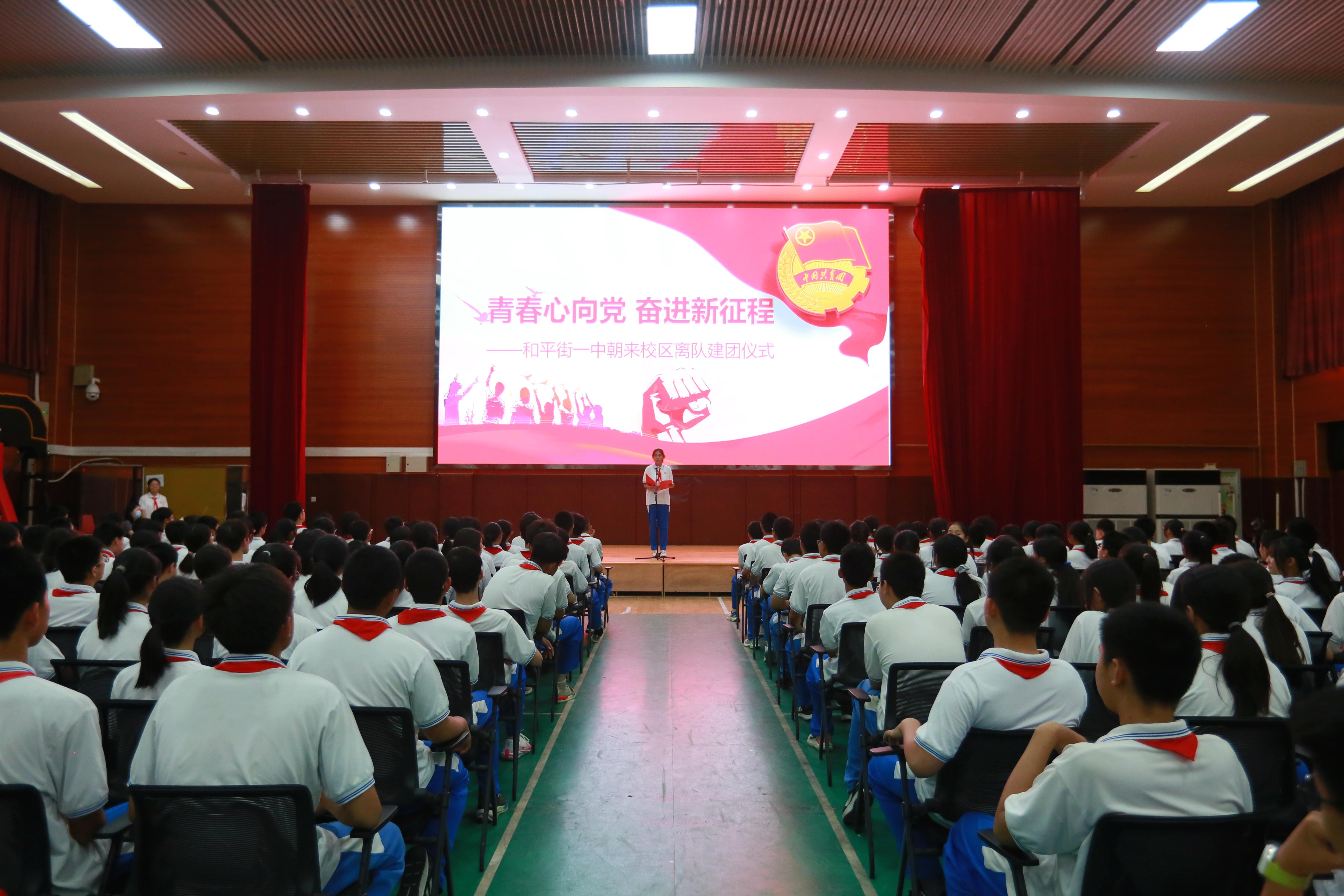 为积极引导青年学生厚植爱国主义情怀,团结带领广大团员青年坚定理想信念,帮助学生“迈好青春第一步”,扛起属于自己的时代责任。2023年5月26日下午,和平街一中朝来校区开展离队建团仪式暨地生中考倒计时30天誓师活动。朝来校区教学副校长邓立,学生发展处主任张东辉、韩晓佳,教务处主任邵邱乾,初二年级组长刘怡然及全体初二师生参加本次活动。