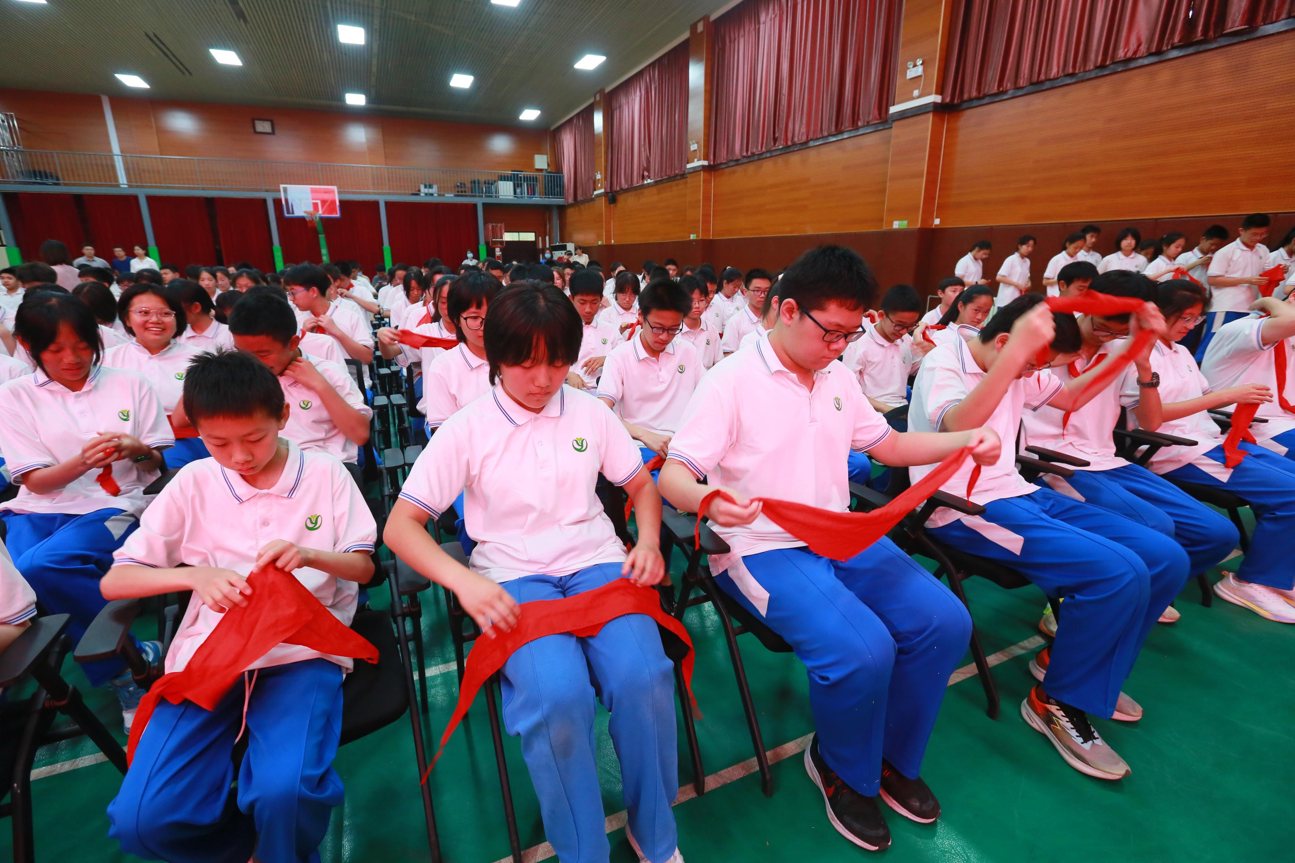 在庄严的国歌声中,离队建团仪式拉开帷幕。在初二(12)班李梓芊的引领下,全体少先队队员最后一次面向飘扬的队旗,唱响那首熟悉的《中国少年先锋队队歌》。初二(13)班马啸程带领同学们重温入队呼号,同学们怀着崇敬的心情,向队旗献上最后一礼,将自己心爱的红领巾认真叠好并珍藏起来。