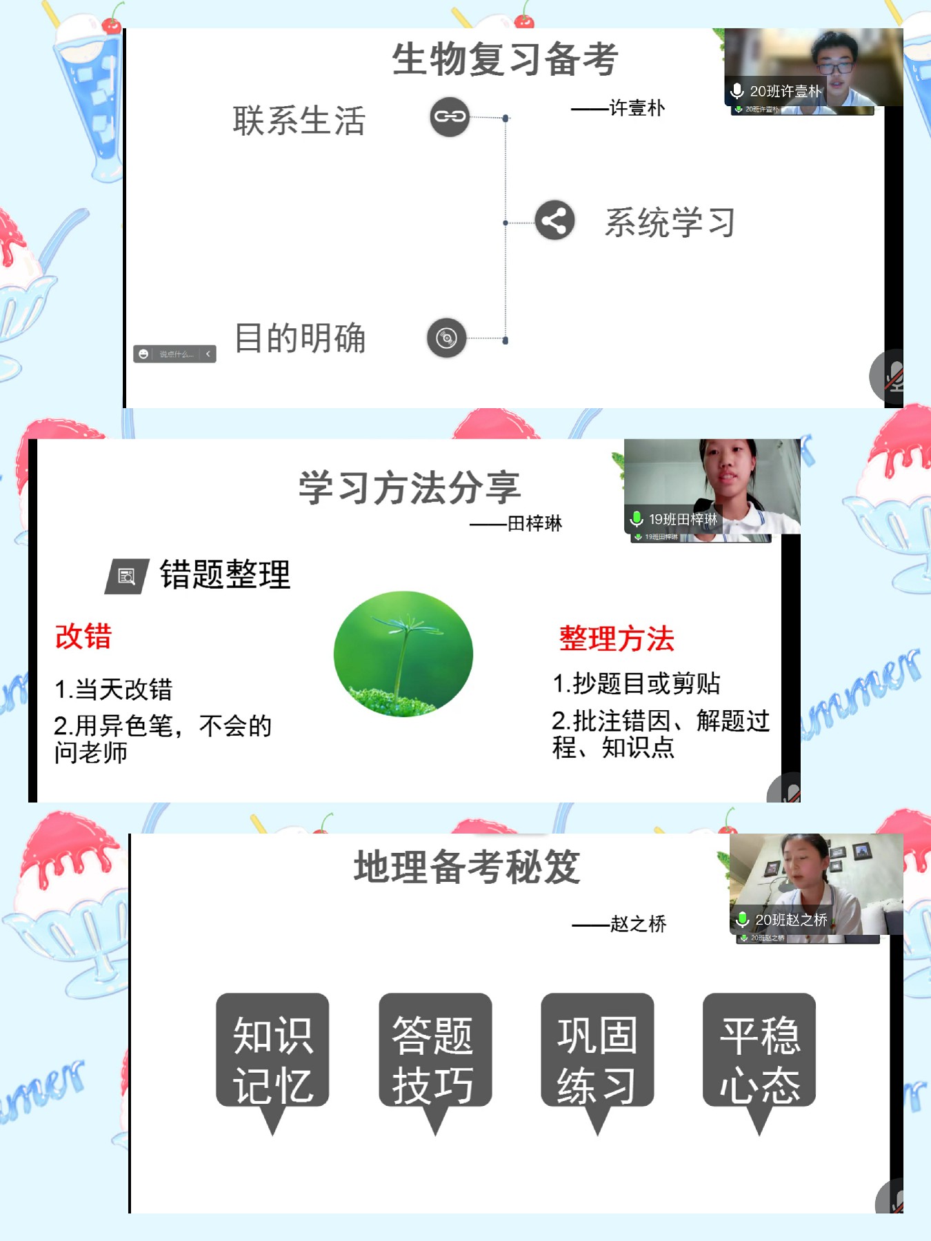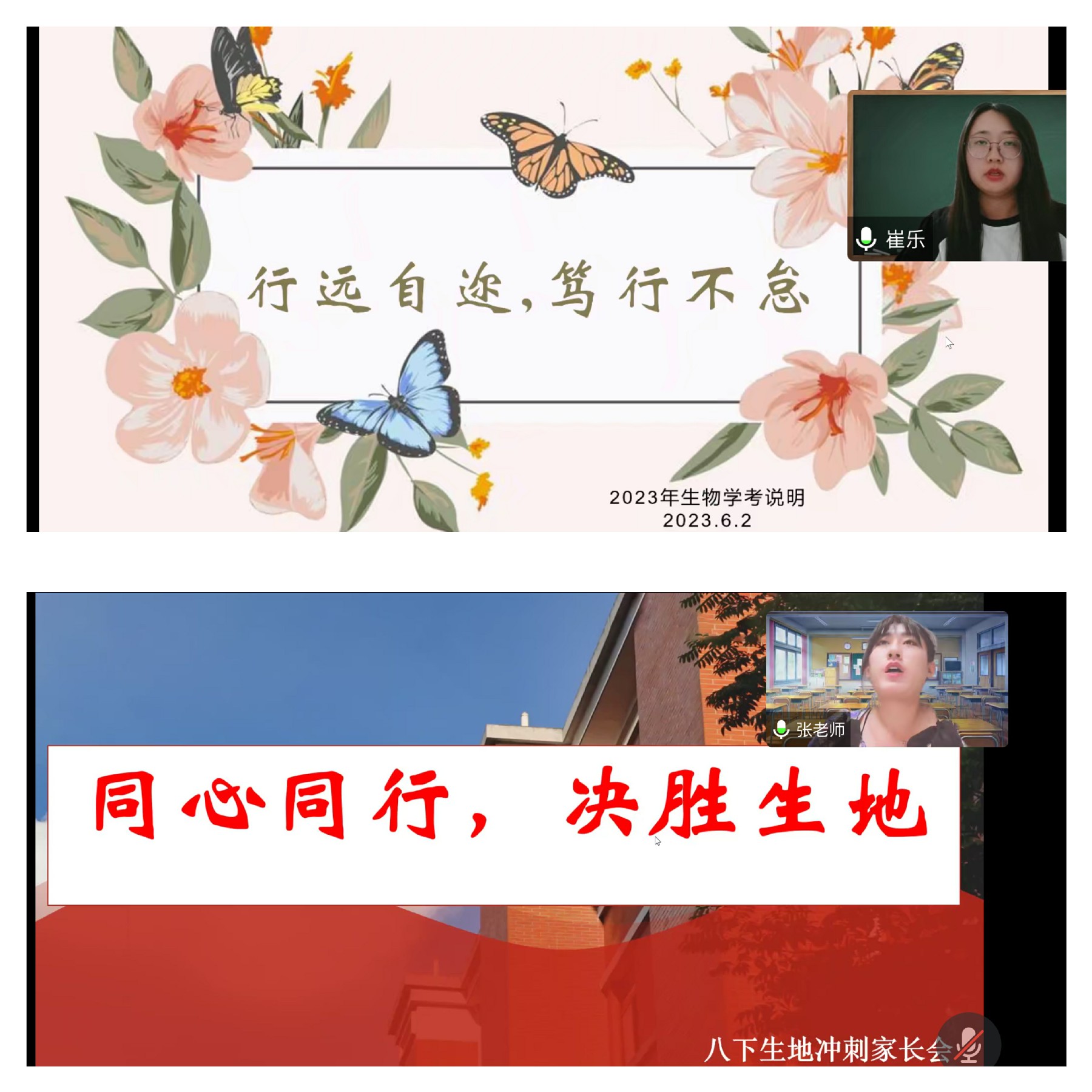 生物崔乐老师、地理张国庆老师围绕下一阶段学习计划进行交流,并给予学生们切实可行的方法。学生代表许壹朴、田梓琳、赵之桥三位同学分享了自己的备考经验。各班班主任就班级近期情况及下一阶段重点工作提出了建议和希望。