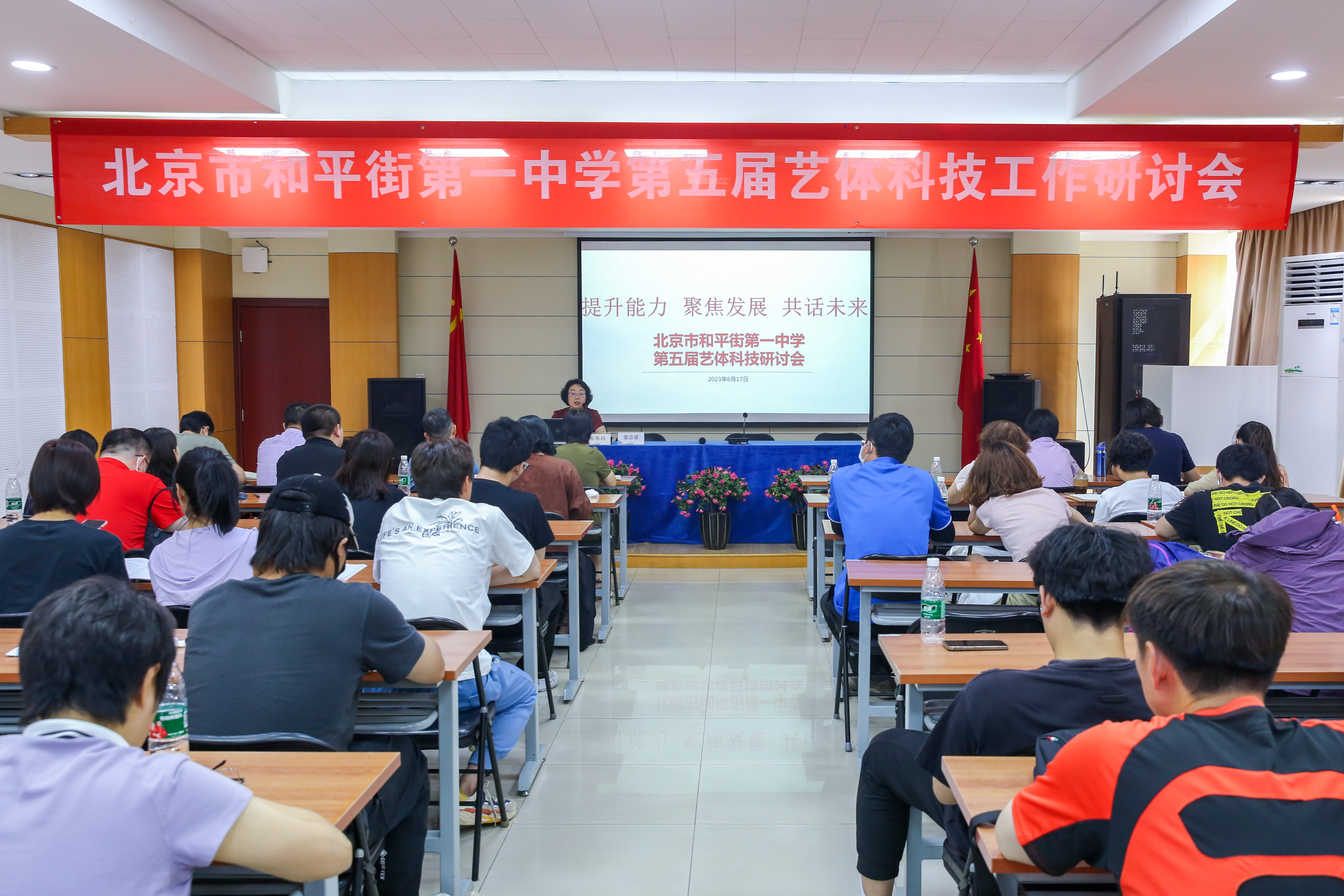 为了深入探讨“十四五”规划期间学校艺体科技工作、精品社团的发展方向以及十二年一体化艺体科技培养及创新工作,2023年6月17日上午,北京市和平街第一中学在莲葩园校区召开“提升能力 聚焦发展 共话未来”第五届艺体科技工作研讨会。来自集团六个校区的学校干部及艺体科技教师近一百余人参加了此次研讨会。