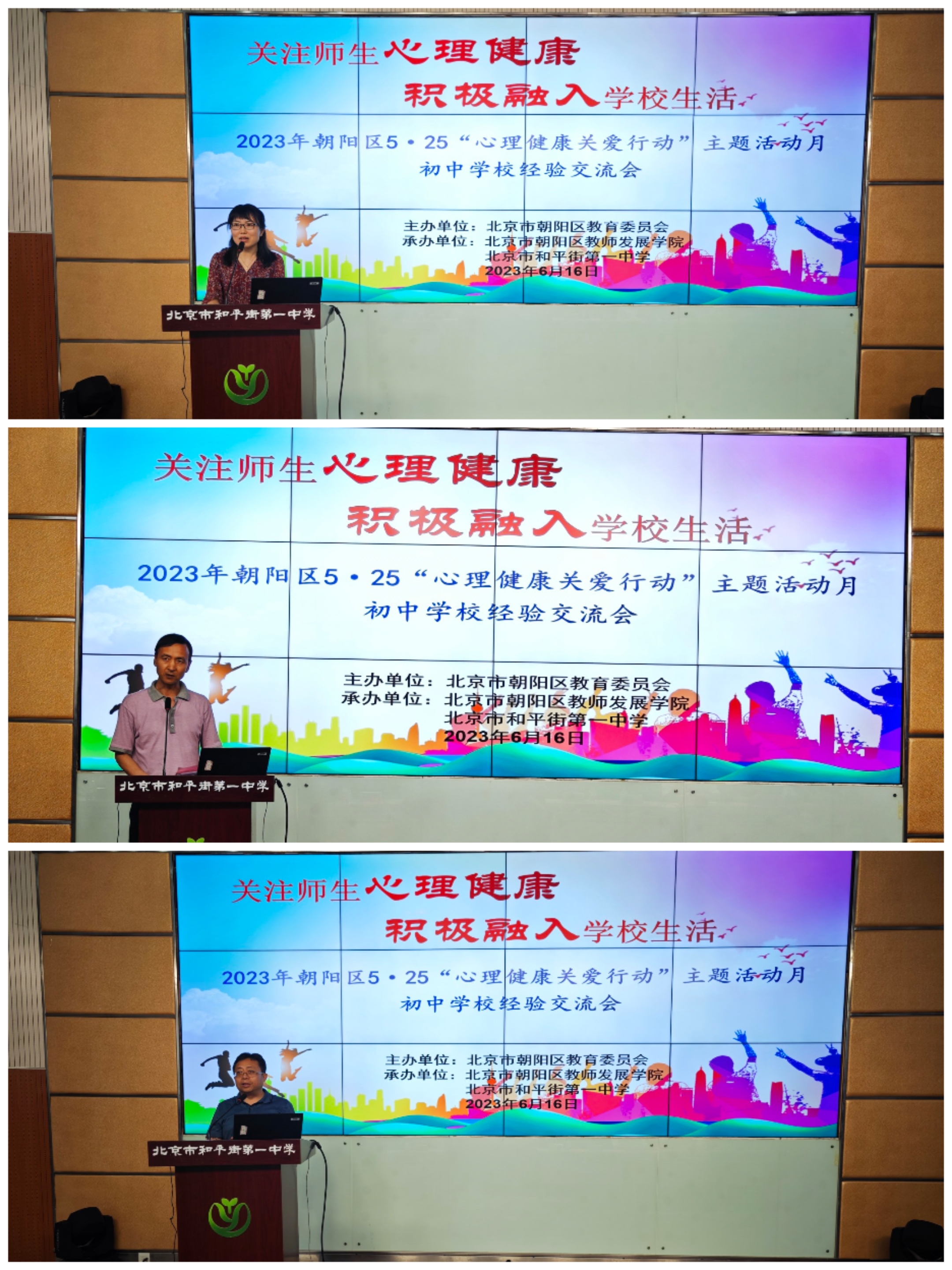 为更好总结各中小学心理健康教育宣传月工作,交流活动亮点,2023年6月16日下午,朝阳区教委德育科组织全区中学德育干部,专、兼职心理健康教师齐聚北京市和平街第一中学朝来校区,开展了学校经验交流会。