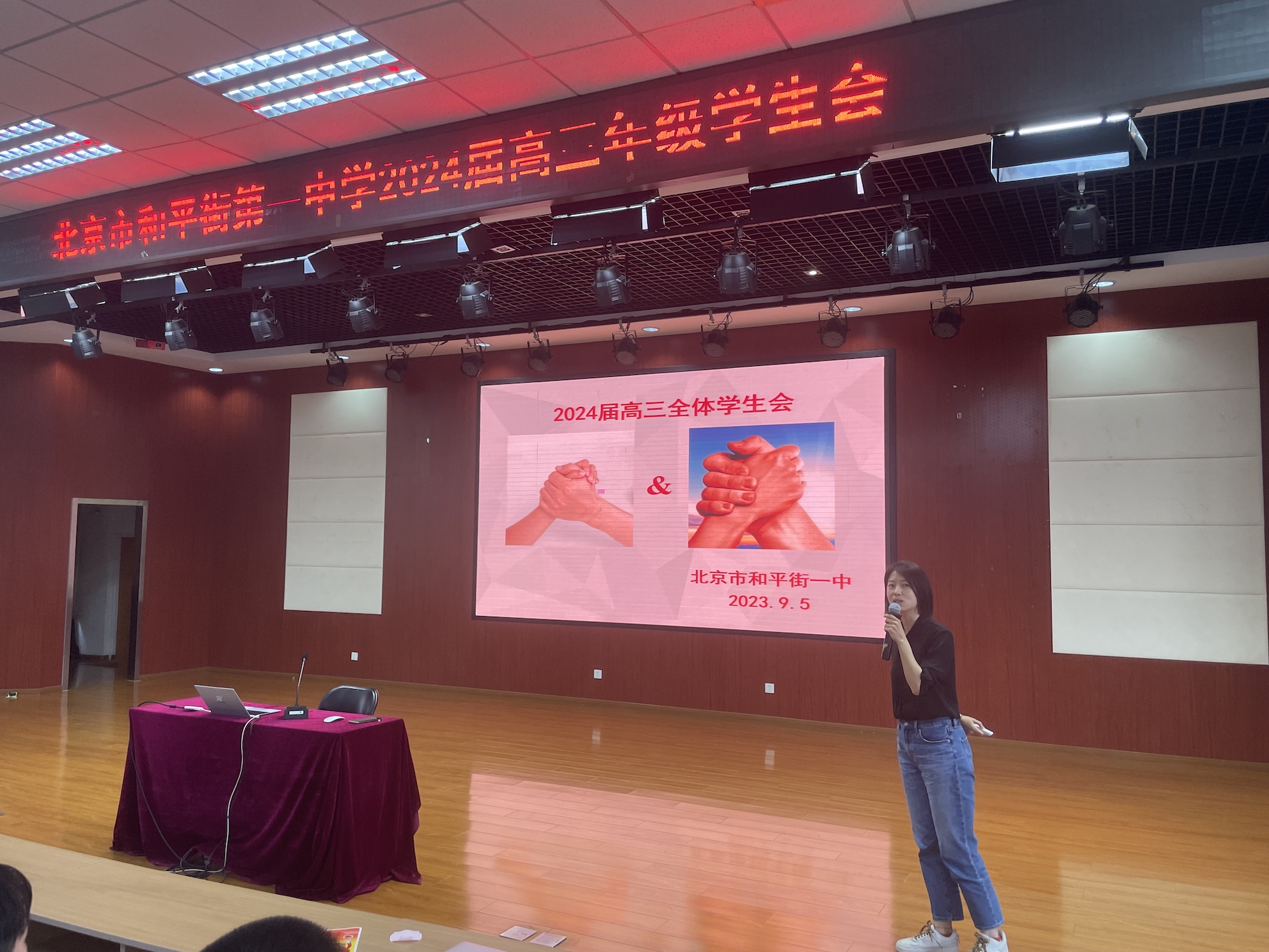 号角一声风雷动,三军发轫启征程。为更好地统筹安排高三新学期各项工作,精心谋划开局新篇,激发学生斗志,迎战高三,2023年9月5日,和平街一中莲葩园校区在五层阶梯教室召开2024届高三年级学生大会。教务处主任刘堃、年级组长程瑞芬、各班班主任及全体高三学生参加了大会。