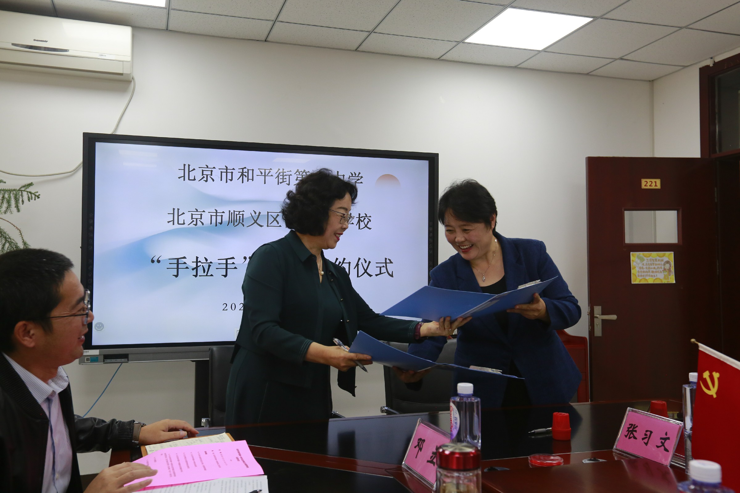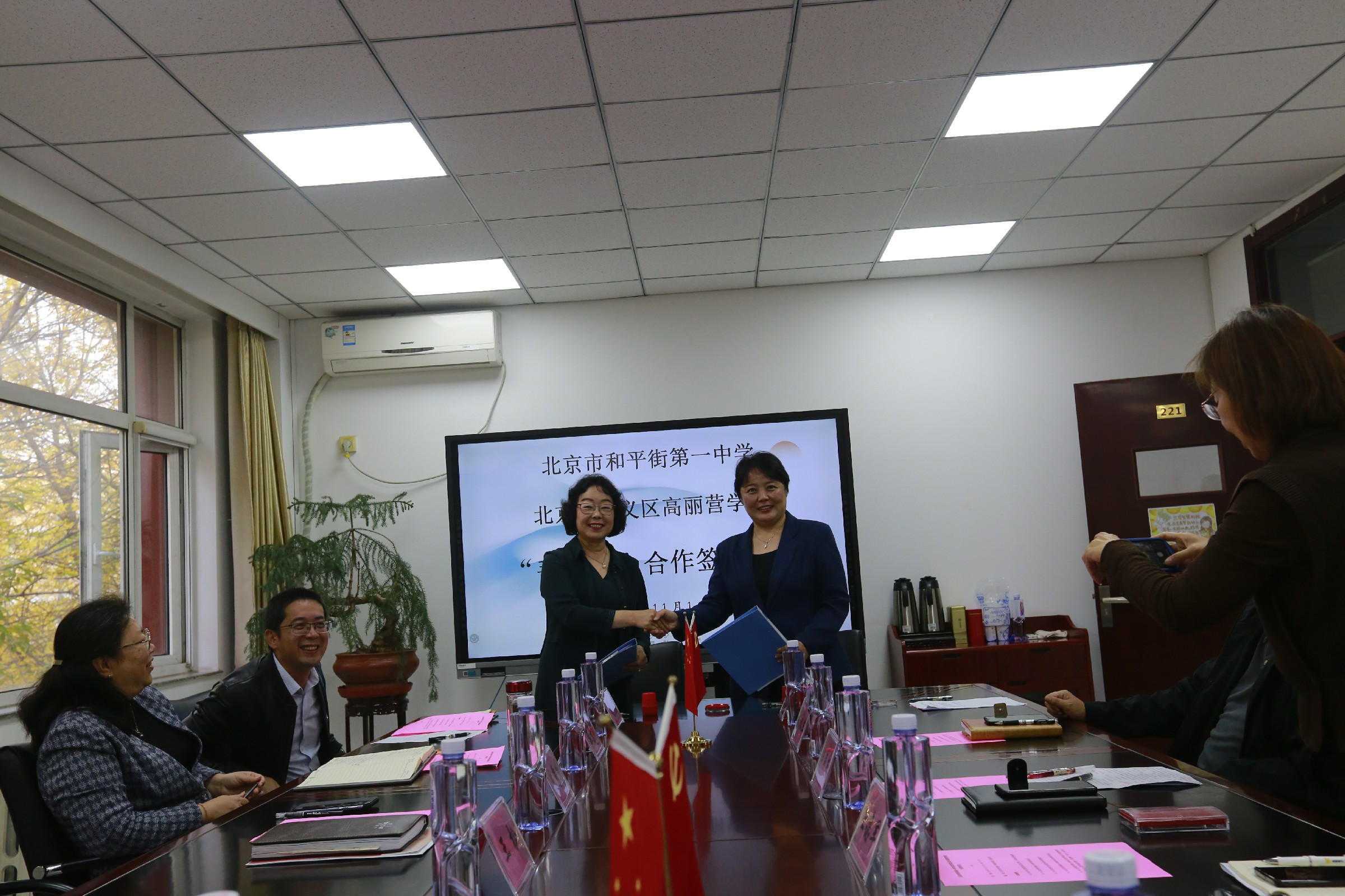 签约仪式上,北京市和平街第一中学校长陈秀珍致辞,欢迎来宾们的到访,介绍学校的发展历程、办学思想、文化特色、办学成果等情况,表达了深度交流、共同提升的意愿。高丽营学校校长吴燕东致辞,感谢和平街一中的热情接待,介绍了该校的基本情况、发展现状及办学成绩,并表达了相互学习,共同发展的意愿。北京市和平街第一中学副校长邓立对双方手拉手合作协议进行了解读,合作期间,双方学校将在学校管理、师资建设、教学研究、资源共享、德育管理、学生交流等方面进行合作交流。随后,陈秀珍校长、吴燕东校长各自代表学校在《北京市和平街第一中学与北京市顺义区高丽营学校手拉手合作协议书》上签字,标志着两校正式建立了手拉手友好合作关系。签约仪式结束后,来宾们在校领导的带领下参观了校园。
