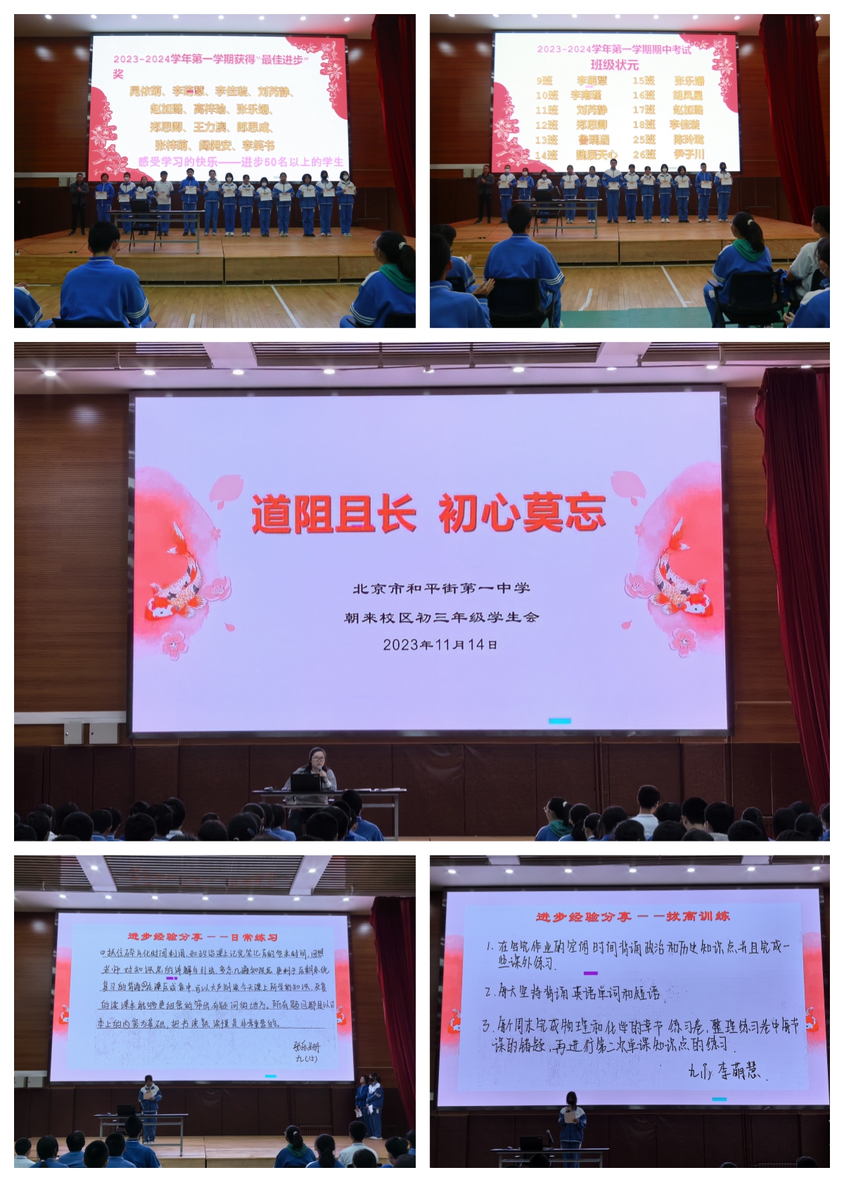 会议伊始,年级组长刘怡然老师对初三年级丰富多彩的课外活动进行了回顾和总结。随后,对上半学期取得优异成绩和显著进步的同学进行了表彰,并请优秀学生代表到台上进行了学习经验分享。同学们毫无保留的分享为接下来同学们的期末备考和养成良好的学习习惯提供了方法借鉴。最后,刘老师强调了初三这一学年的重要性;提醒同学们学习之路虽充满艰辛且漫长,但一定要坚守初心,保持对知识的热爱和对未来的期待;并鼓励大家能够以更加饱满的热情投入到接下来的学习和生活中。