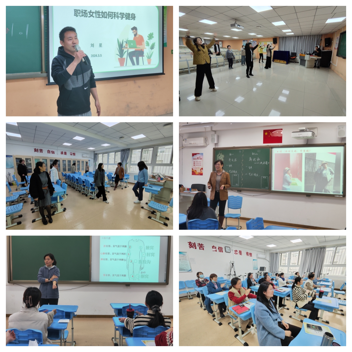 202435日下午,女教职工们积极参加由刘星老师,马琳娜老师,高宁艳老师分别讲授的知识小讲座:《职场女性如何科学健身》、《如何把自己拍漂亮》和《养生小妙招》。现场气氛活跃,欢声笑语不断。此次活动的开展,使女教职工们缓解了工作压力,愉悦了心情,增长了知识。全体女教职工们必将以更加饱满的精神和更加昂扬的状态投入到工作中去。