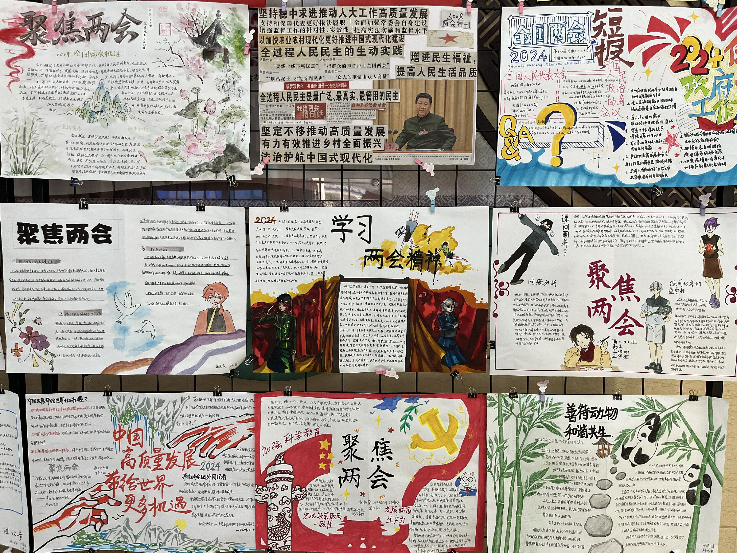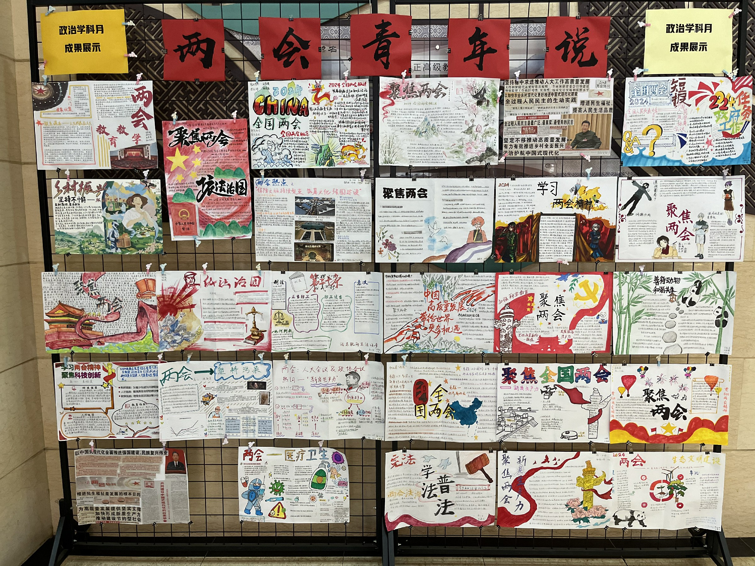 2024年3月,和平街高中校区政治教研组紧抓两会契机,充分发挥思政课程在立德树人中的核心作用,携手高一、高二年级组,共同策划并举办了以“两会青年说”为主题的学科月活动,旨在激发学生的爱国情怀,坚定其对中国特色社会主义的信仰,引导他们将课堂所学与现实生活相结合,深刻领悟全过程人民民主的真谛。两会召开期间,政治教研组的老师们组织学生在课堂上开展时政述评,学生们各抒己见,就两会的热点议题展开热烈讨论。两会闭幕后,学生们纷纷拿起画笔,用一幅幅内容精彩、构思精巧的作品表达他们对两会的感悟和理解。此次活动不仅拓展了学生视野,提升了其政治参与意识,还为他们提供了展示自我的平台,促进了学生全面发展。