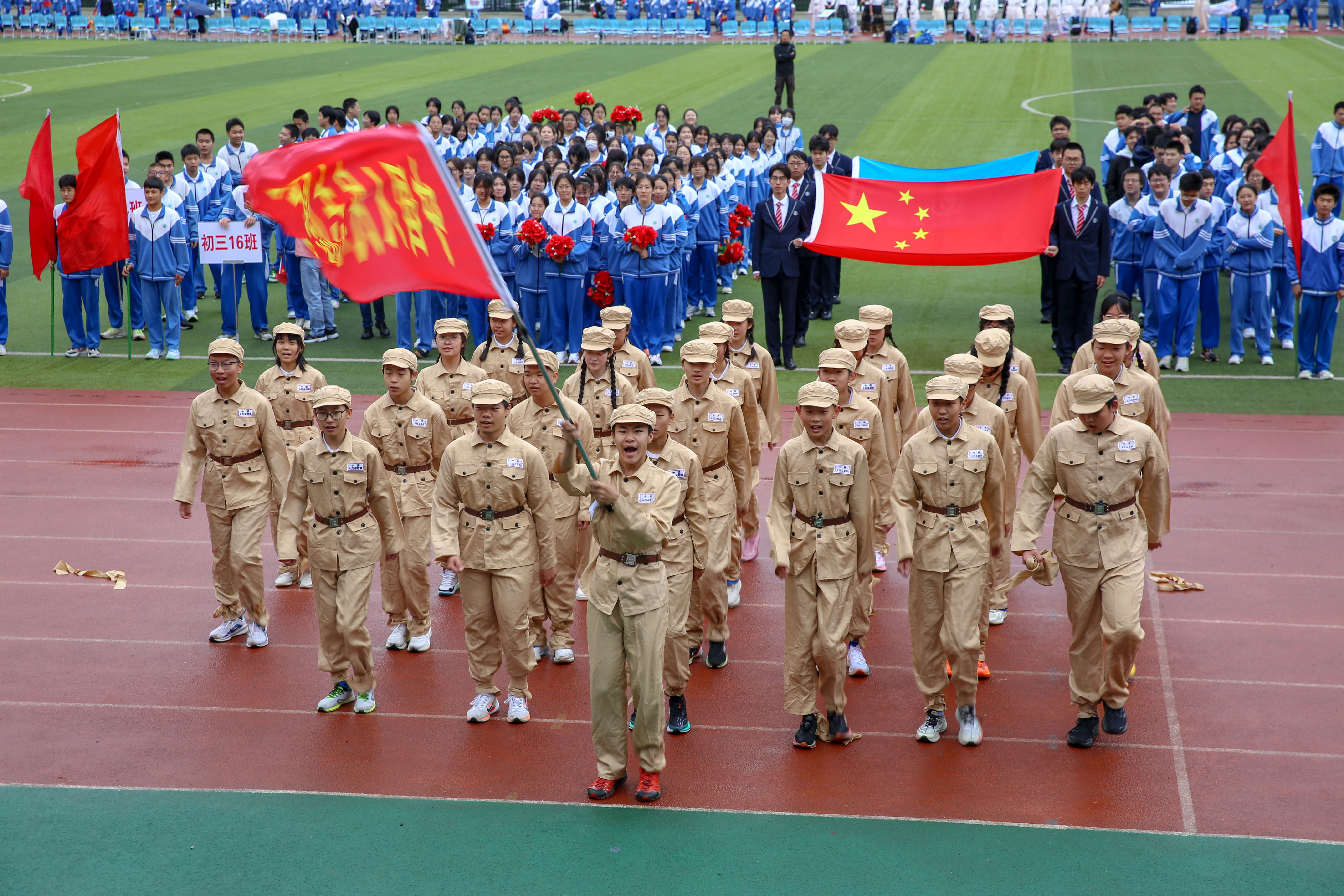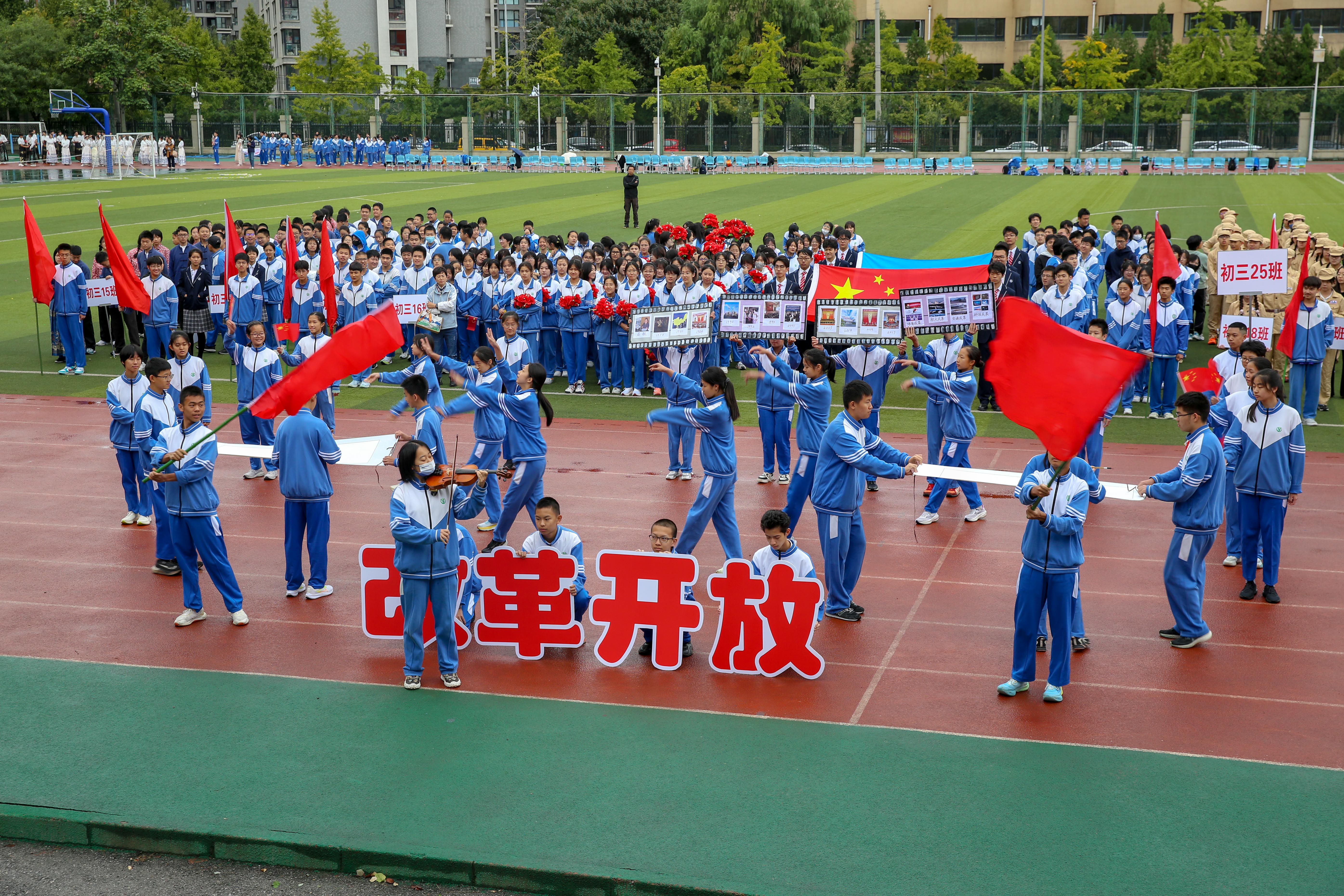 伴着激昂的《运动员进行曲》,国旗队、彩旗队、各班方阵依次从主席台前走过。各班通过精心设计的展示,回顾了新中国成立七十五周年来在各领域取得的重大成就,特别是新时代的伟大变革和成功案例,以此弘扬爱国主义精神,激发师生的奋斗情怀与拼搏热情。响亮的口号、多变的队形以及武术、舞蹈等精彩纷呈的表演,赢得了现场观众的阵阵掌声与喝彩。