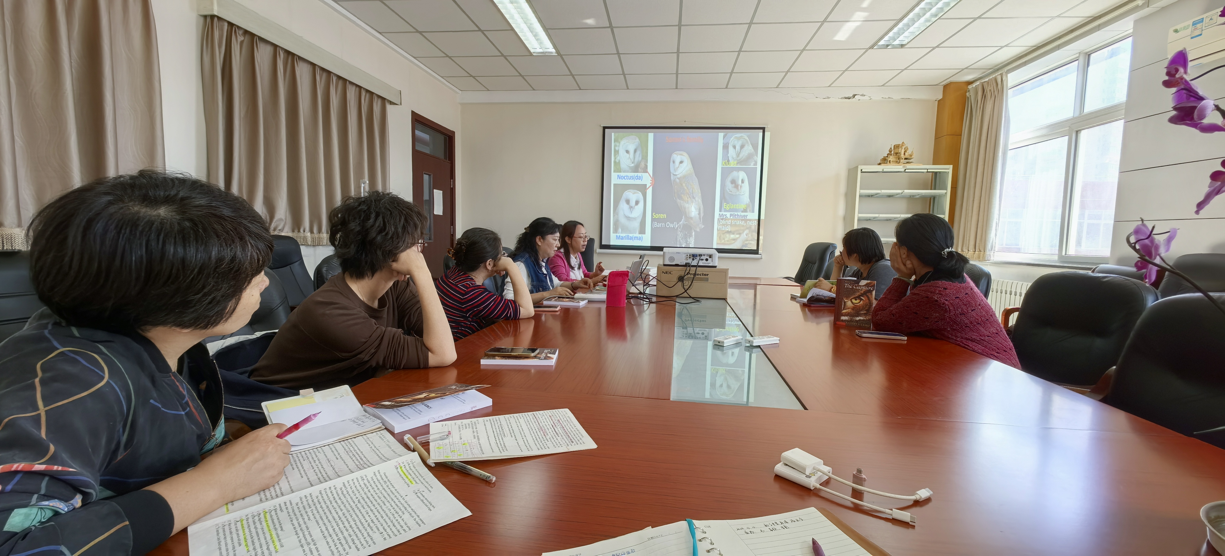 会上,陶老师就此活动的设计思路和实施方案进行了介绍。实践活动主题为:跨学段英语经典共读。从书籍的选取到内容的介绍,从课程推进思路到教师们的具体分工,陶老师为大家做了详细的解释和说明,并提出了导读实施方案的初步设想。