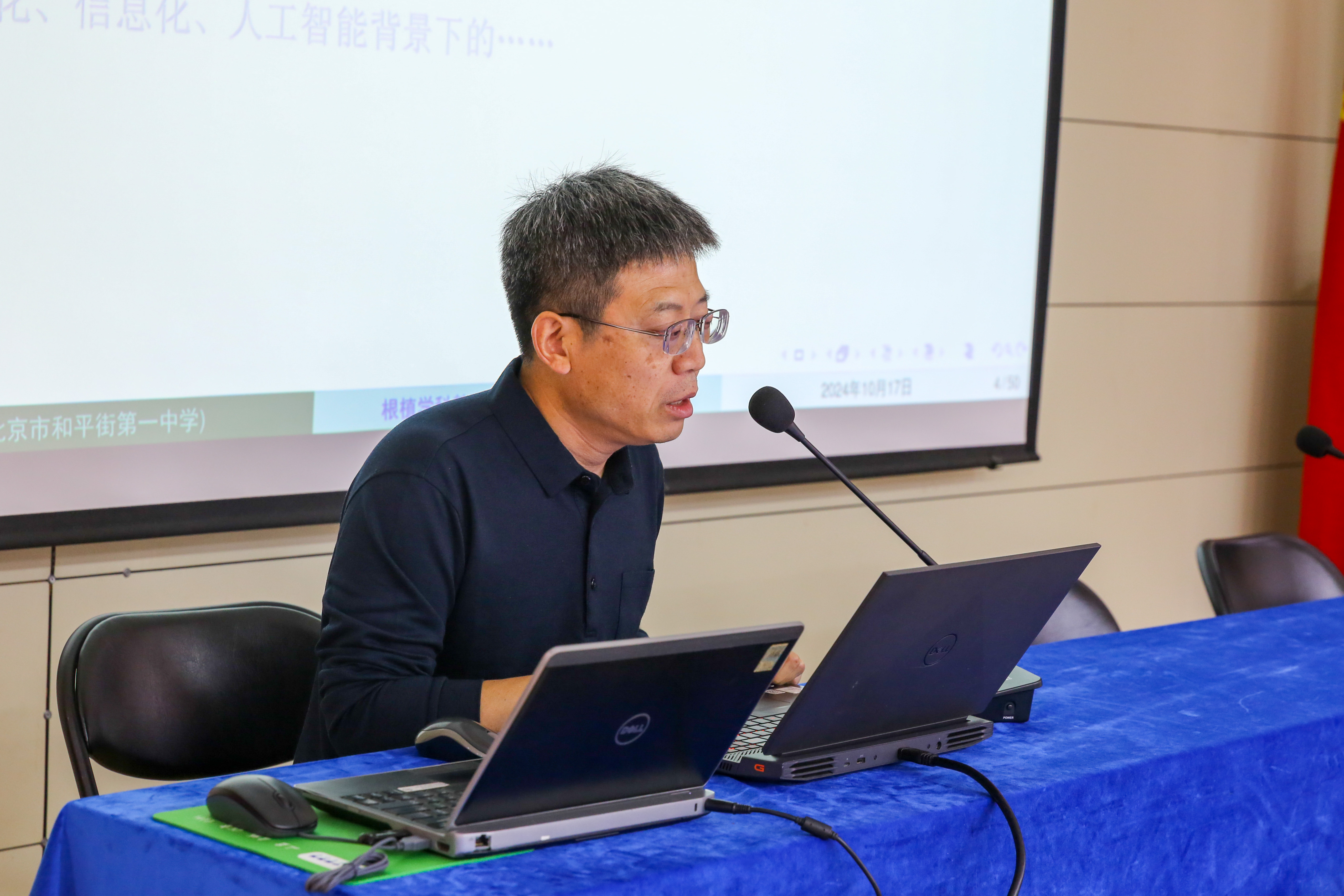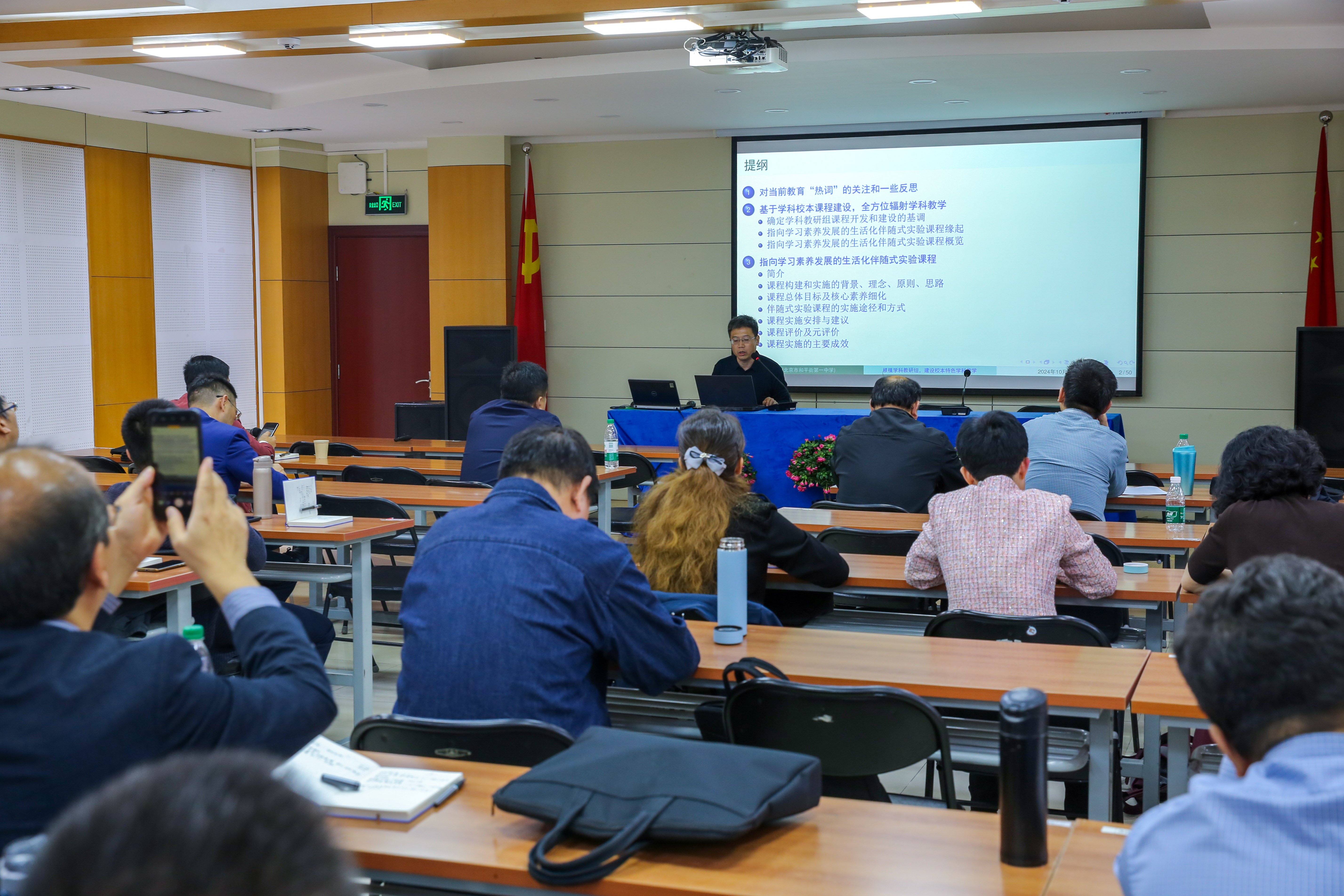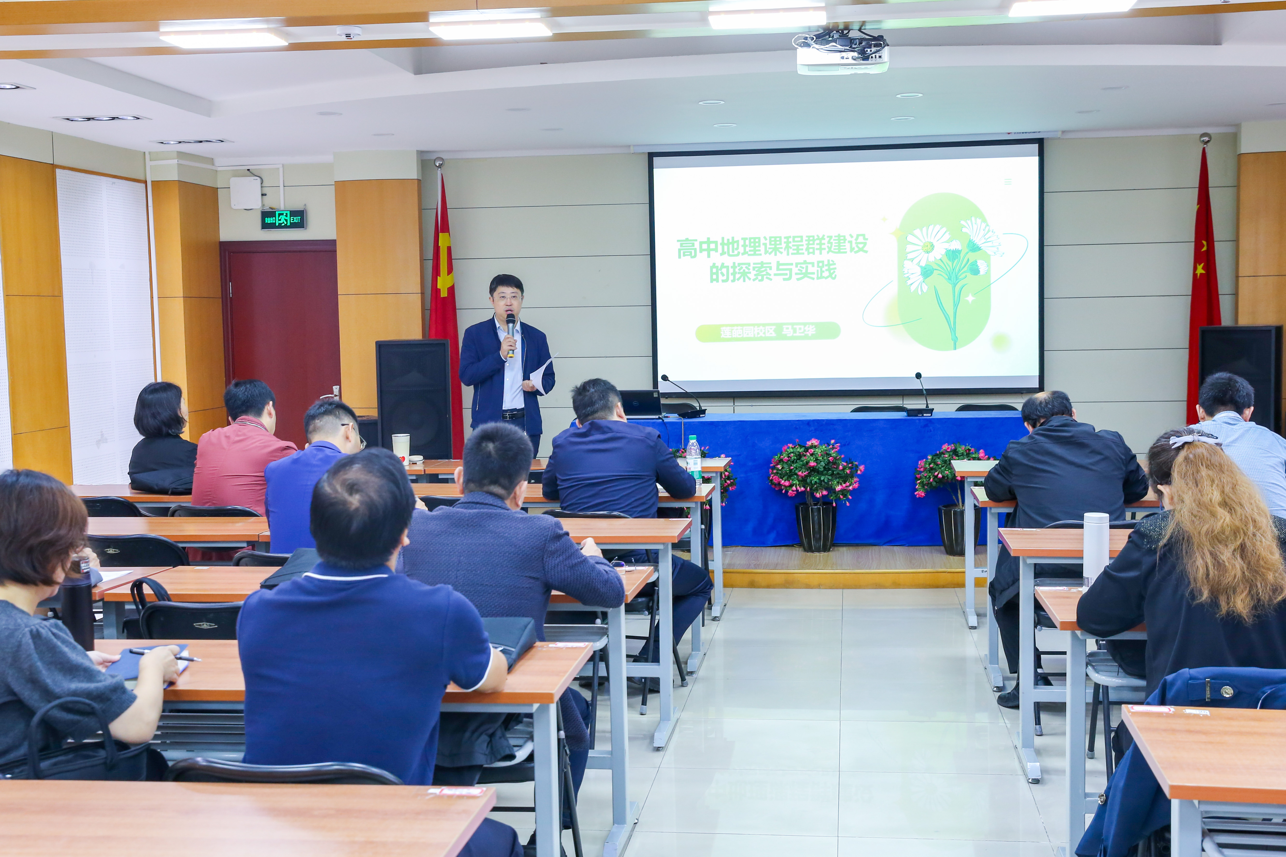 随后,我校三位集团大教研组长围绕集团校一体化办学的教学教研工作进行了专题交流。地理特级教师马卫华老师以《高中地理课程群建设的探索与实践》为题,从课程群建设的必要性到具体构建方法,进行了深入浅出的阐述。北京市骨干教师、物理学科正高级教师梅晓璇老师带来了《根植学科教研组,建设校本特色学科教学》的主题分享,他以幽默风趣的语言,结合真实案例,重点探讨了学科教研组课程开发、实验课程及项目化学习等内容,引发了在场老师的强烈共鸣。北京市政治学科带头人冯燕玲老师则以《增强价值认同 初高中思政课》为题,通过丰富的实施案例,阐述了“主题+活动”一体化课程实践与研究,展现了思政教育一体化的新模式。