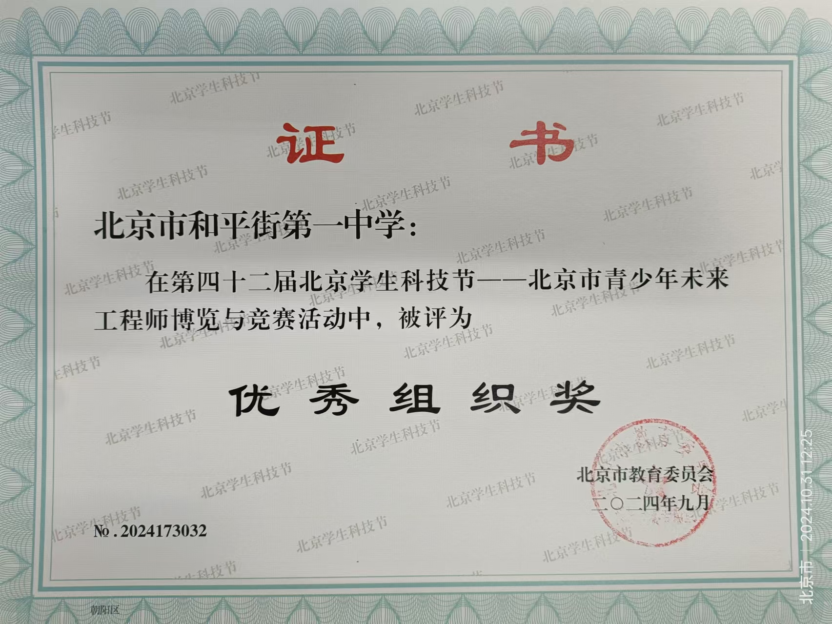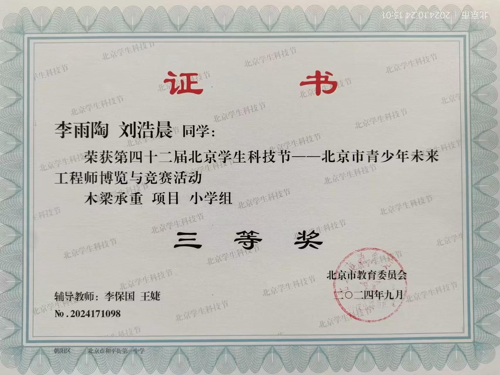 2024年北京市青少年未来工程师博览与竞赛于今年7月在大兴区举行,北京市和平街第一中学李保国、王婕老师带领清友园校区李雨陶、刘浩晨同学继6月2日在区级比赛中获得一等奖后,作为朝阳区的两支代表队之一,在本次市级竞赛木梁承重项目中获得三等奖的好成绩。