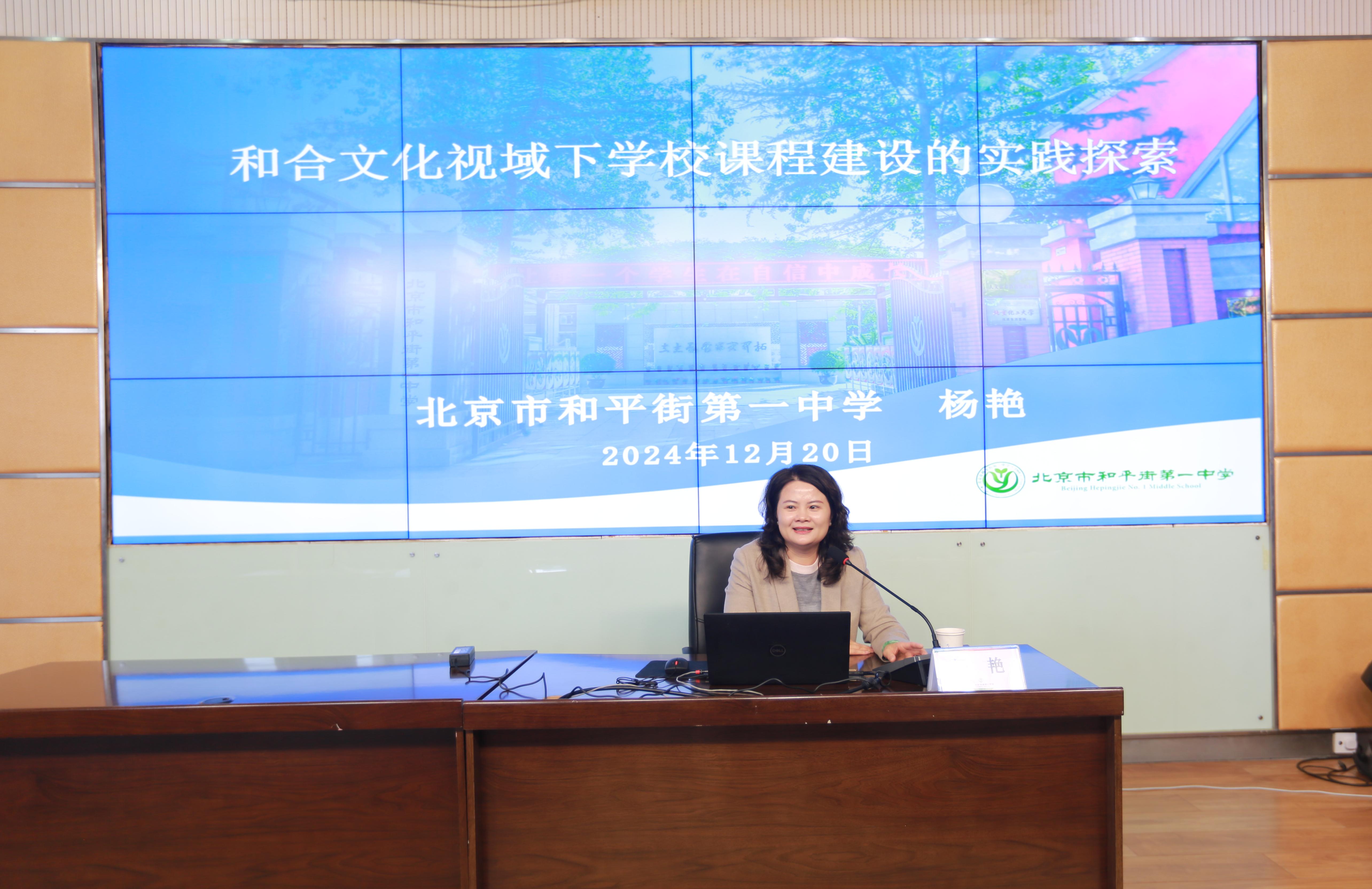 随后,学校校长杨艳做了主题为“和合文化视域下学校课程建设的实践探索”的专题讲座。杨校长从和合文化的内涵理解出发,深入剖析了学校课程建设的理念和创新实践,针对跨学科主题学习进行了案例解读,并结合实际教学内容给出了具体的操作建议,为教学实践提供了切实可行的指导。