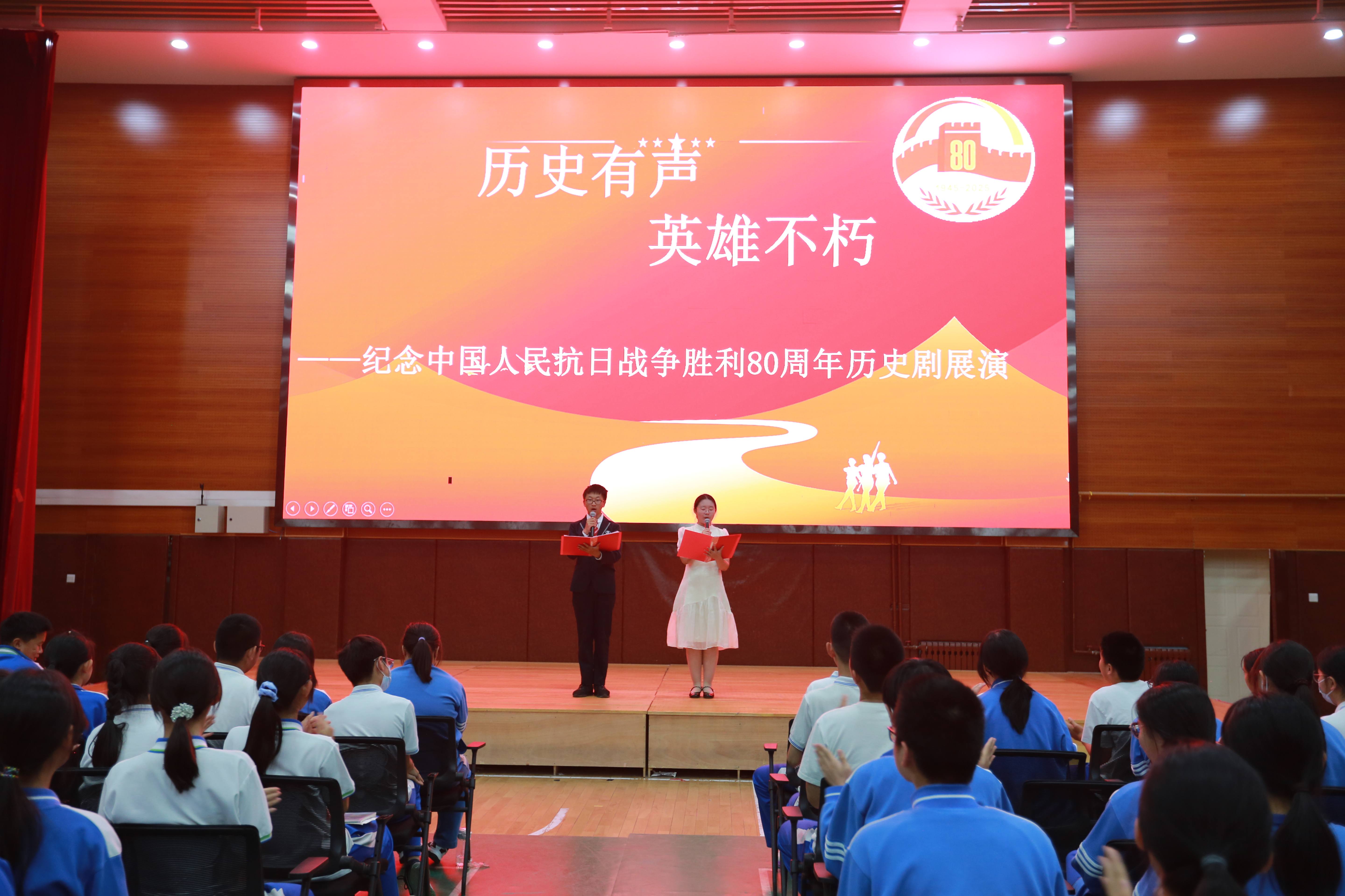 5月29日,朝来校区体育馆内气氛庄严而热烈,一场以“历史有声,英雄不朽”为主题的纪念抗日战争胜利80周年历史剧展演在此举行。从活动筹备到舞台呈现,初二年级师生经过两个多月的精心打磨,通过七幕震撼人心的历史情景演绎致敬英雄先辈,汲取奋进力量。
