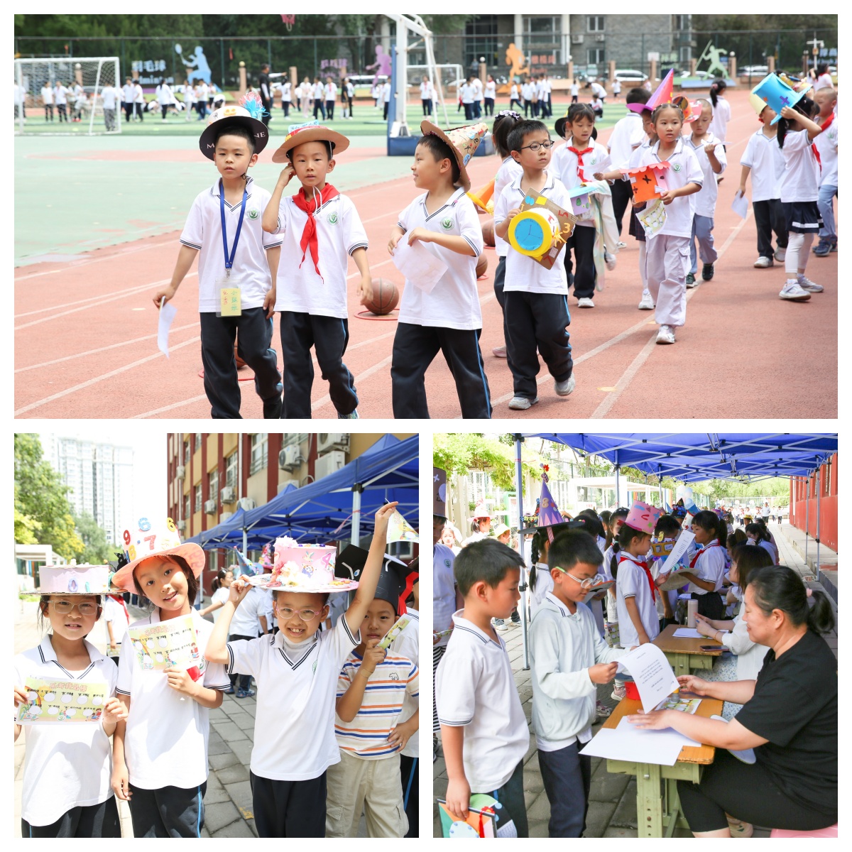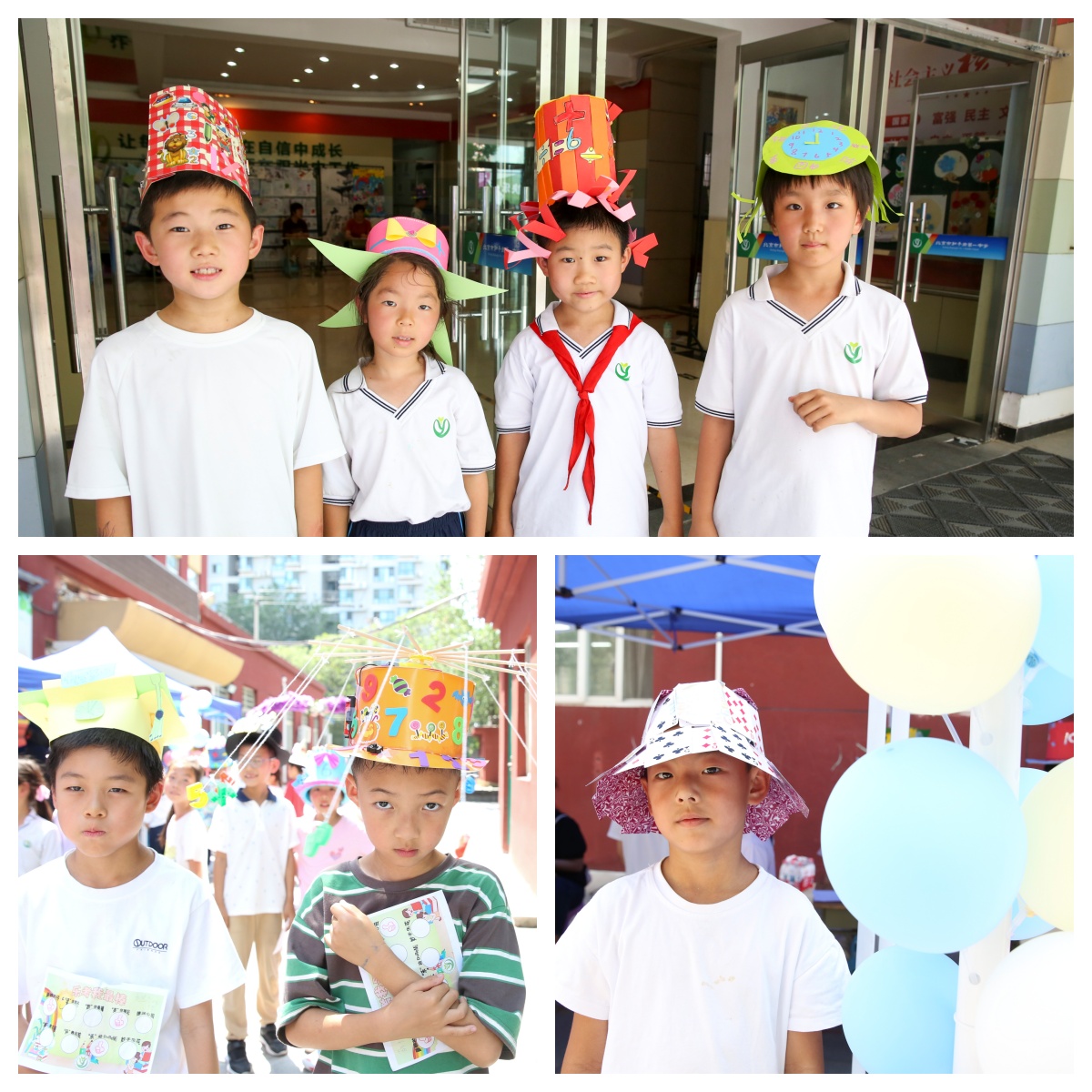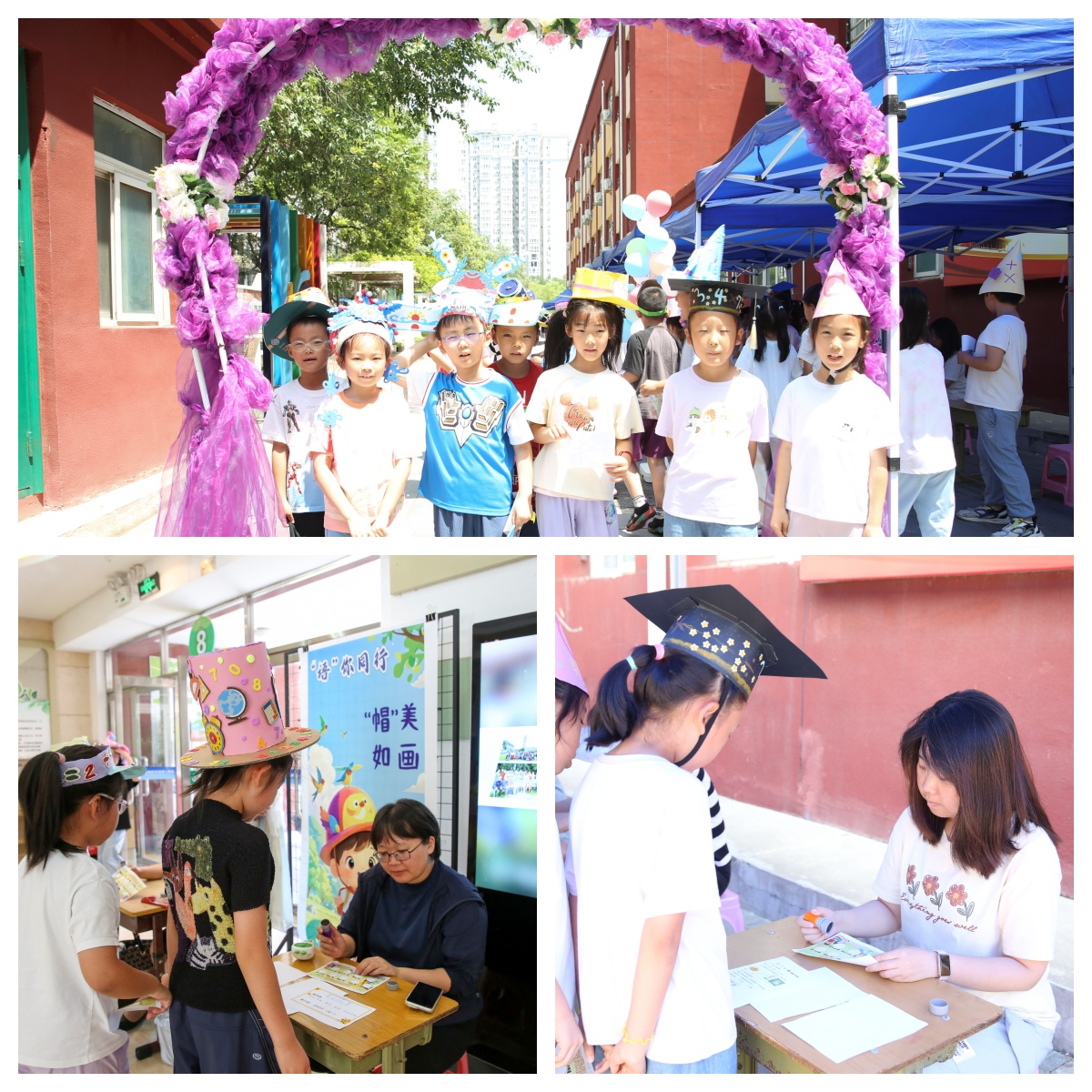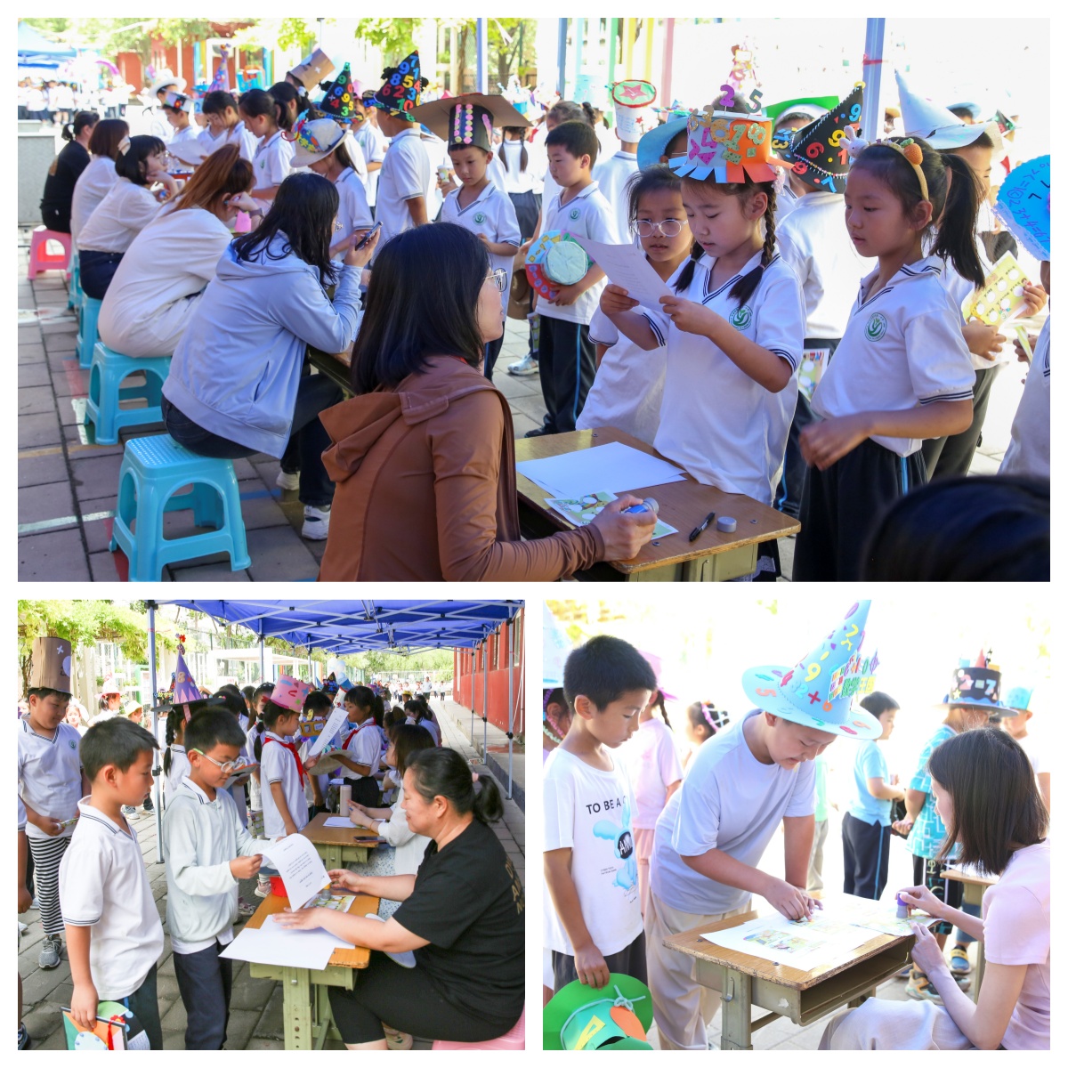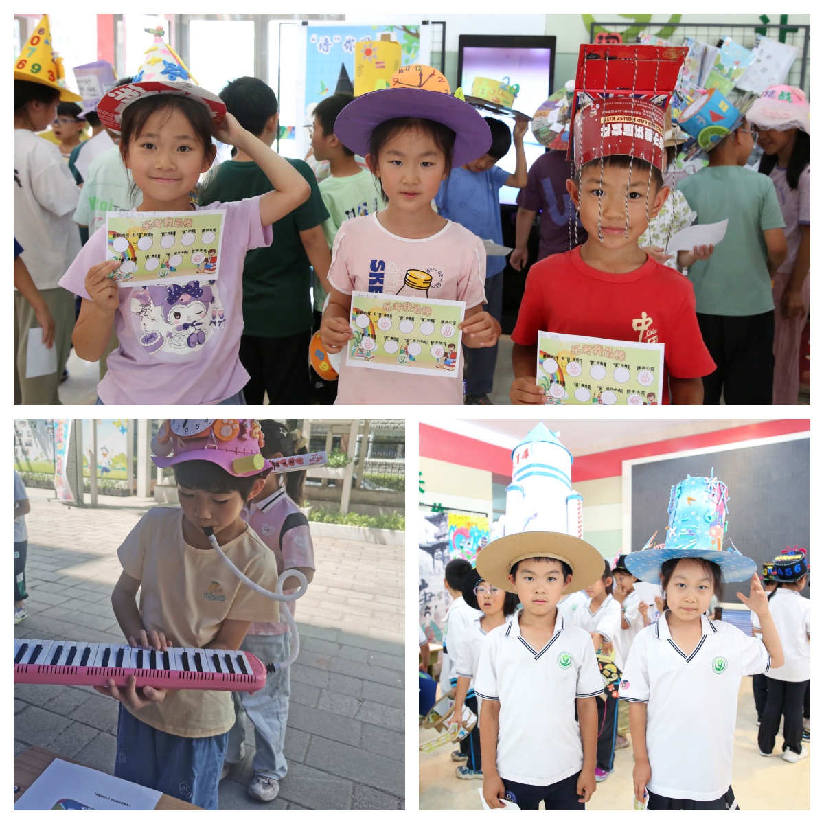 学生们头戴创意自制帽,如灵动的小魔法师穿梭在“‘语’你同行”“‘帽’美如画” “‘数’你最棒”“科趣启航”“‘英’你精彩”“乐动 Do Ri Mi”“最靓的仔”“妙手生花”“德润心田”这些关卡中,孩子们或专注聆听、或兴奋展示,挥舞着“乐考我最棒” 评价卡,阳光与笑靥交相辉映。