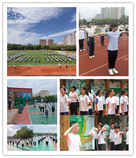 烈日下,同学们在体育老师的指导下投入队列训练。从“稍息立正”到“四面转法”,老师们细致纠正每一个动作细节,耐心示范指导。同学们的动作也从生涩走向整齐划一。训练内容还包含了课间操练习。同学们在老师的指导下,认真学习广播体操,动作从最初的凌乱无序到逐渐协调一致。汗水浸透衣衫,少年们的目光却愈发坚毅。