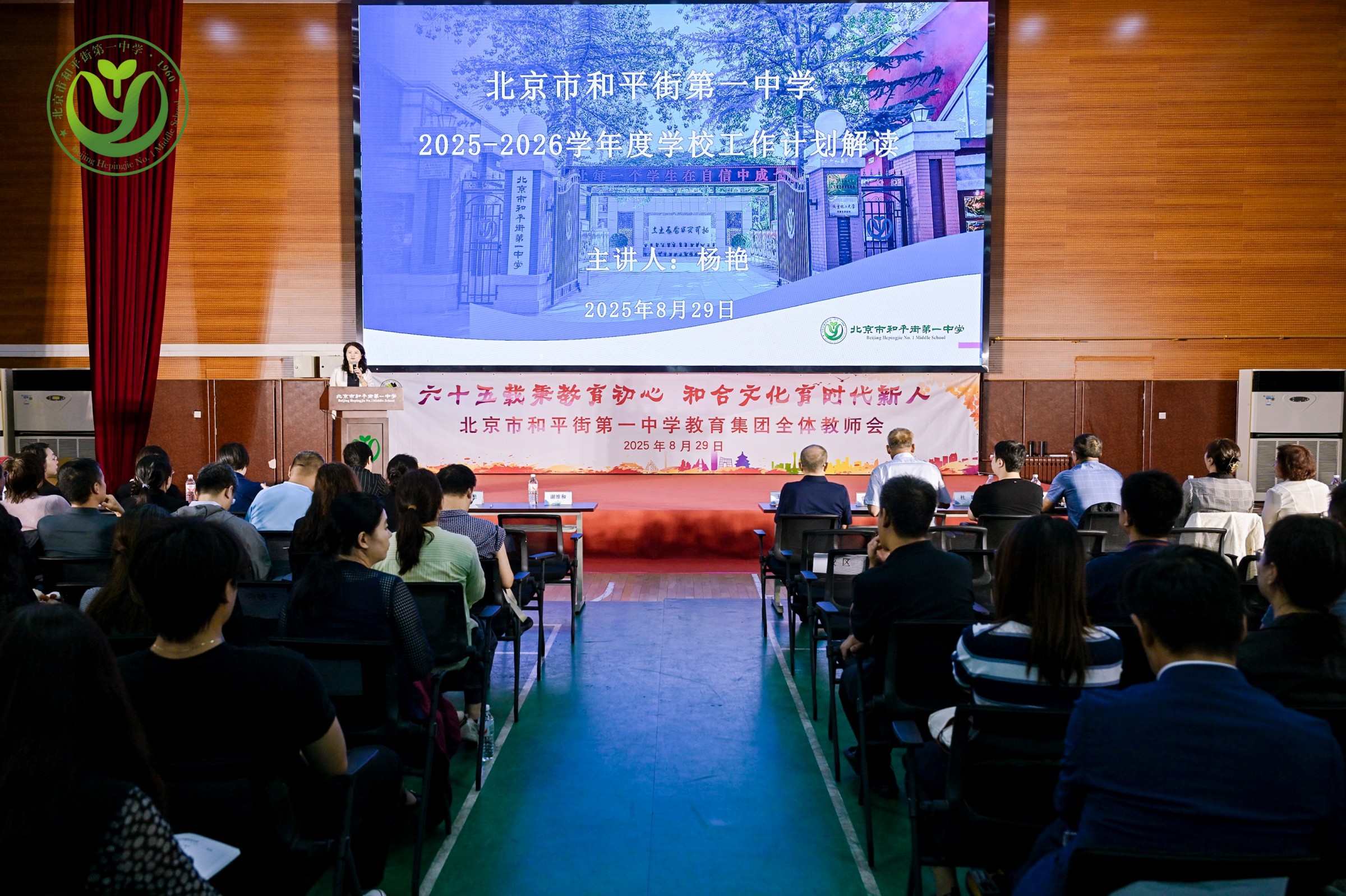 会上,杨艳校长立足学校高质量发展目标,对《北京市和平街第一中学 2025-2026 学年度工作计划》进行了全面的解读,提出和合教育核心理念,明确了学校未来一年的目标要求、重点任务以及创新工作30件“十事实办”等工作内容,并结合上一学年度工作总结,承前启后,以深化“三大体系、五大工程”建设,围绕“课程建设年”主题,为全体教师清晰地勾勒出学校新学年建设路径。