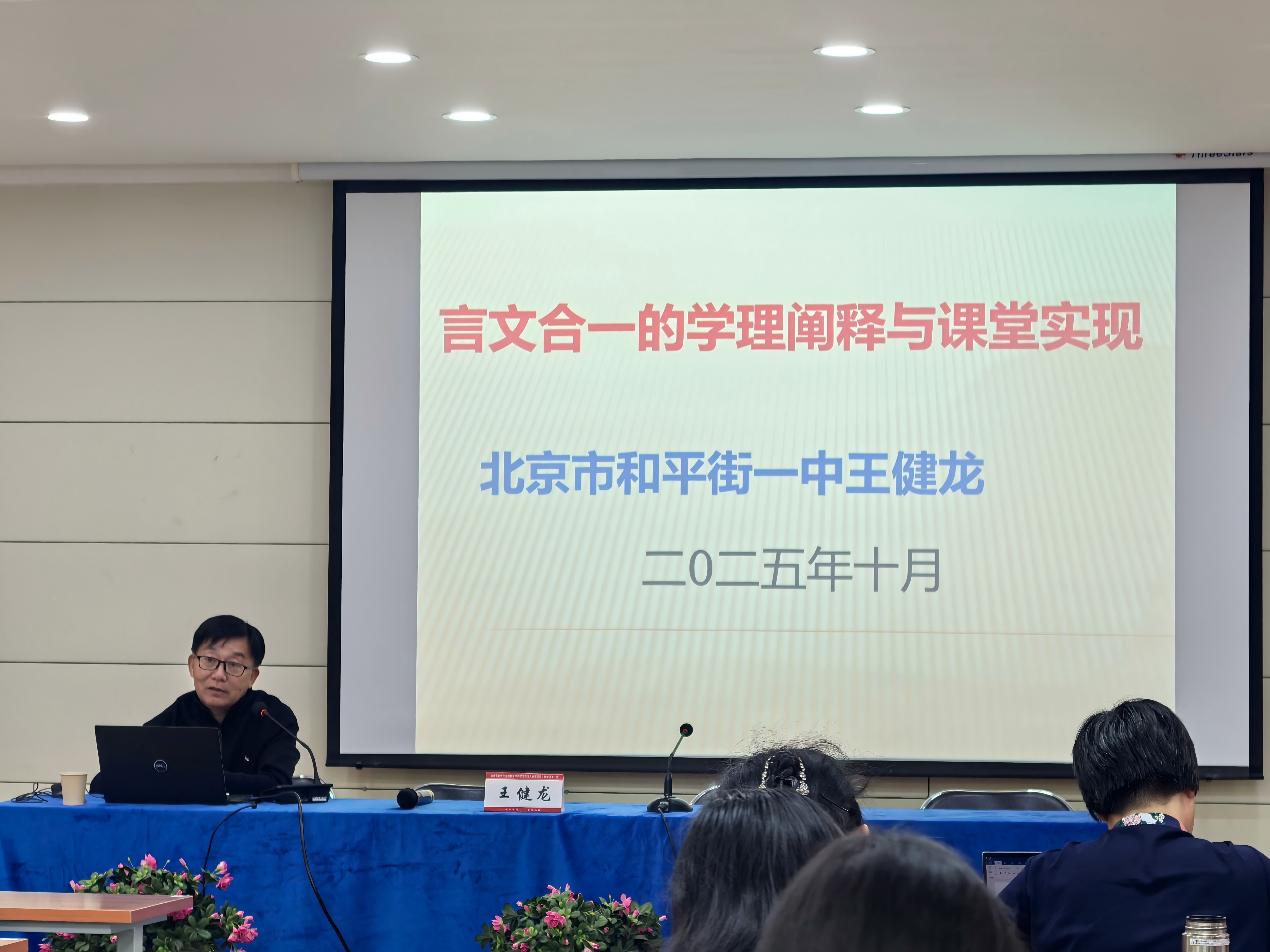 随后,众人移步讲堂,正高级教师、特级教师王健龙以“言文合一”为题,奉上一场思想与学术的盛宴。王老师虽年届花甲,仍躬耕于初三讲台,日日与少年相伴。他以毕生力作《言文合一研究与开放教学案例》为经纬,从理念溯源到学理探析,从课例实践到策略微探,层层展开,抽丝剥茧。
