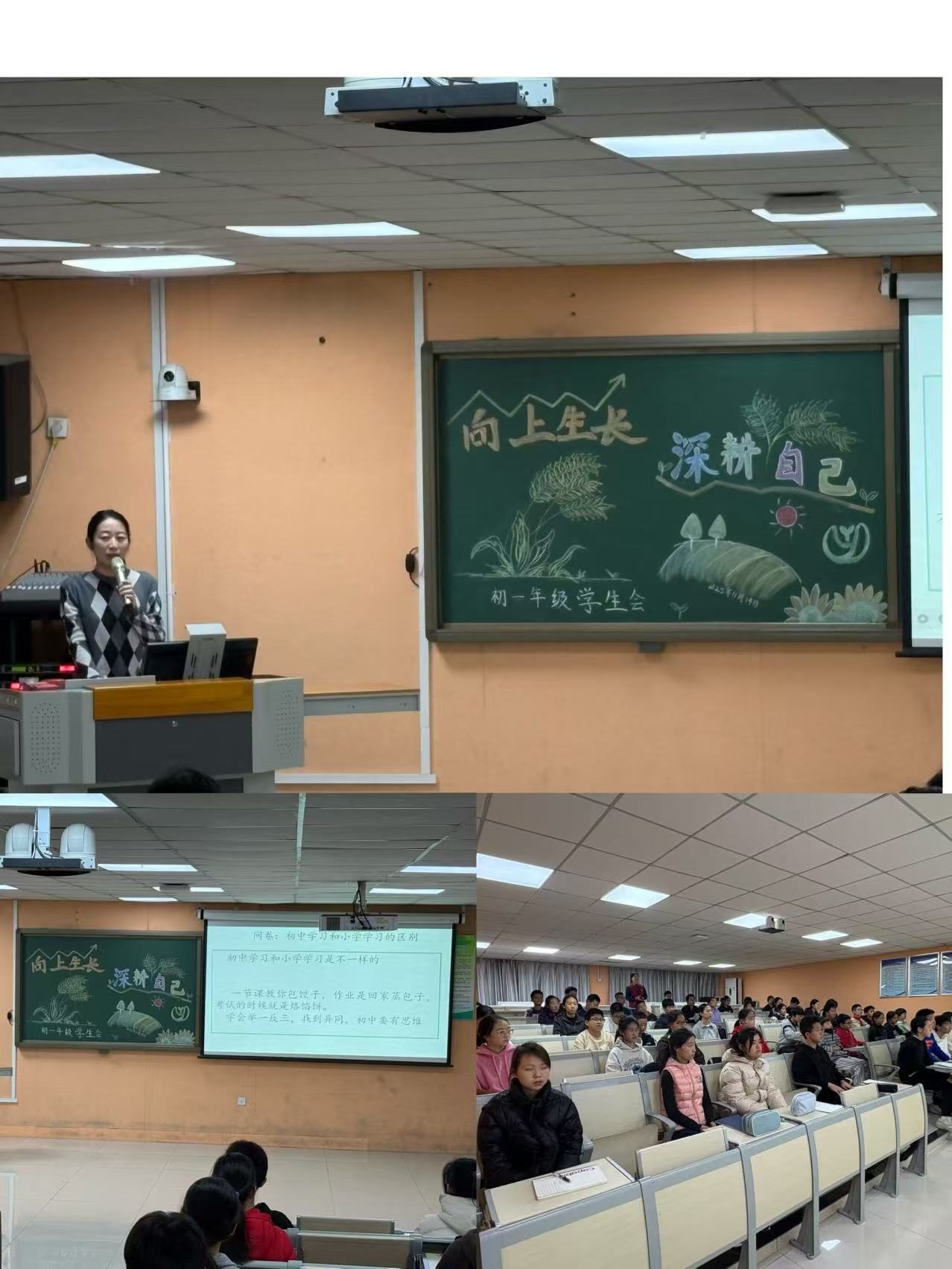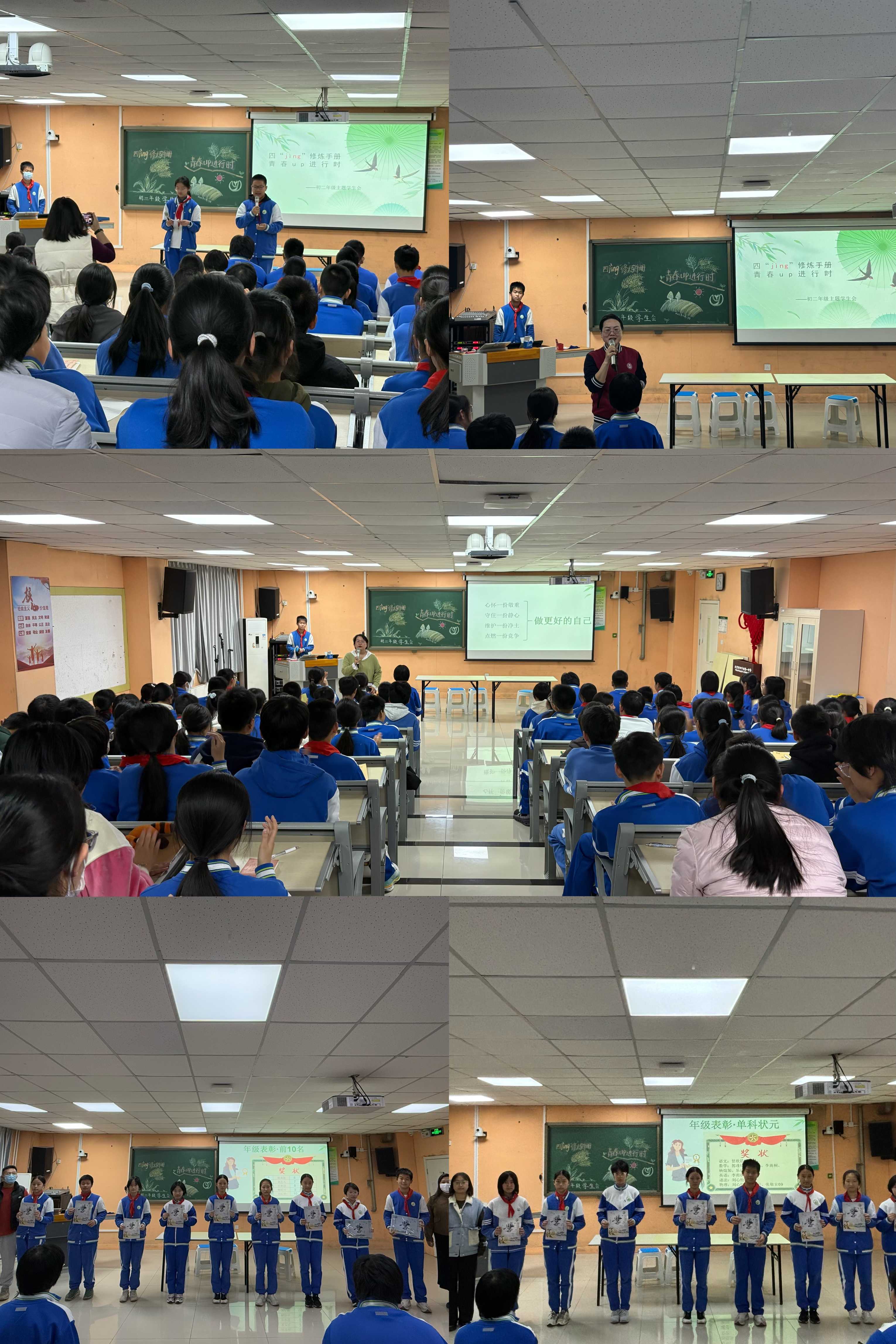 初一年级学生会的主题是“好习惯成就自己”。年级组长董佳琦老师带领同学们学习了《中小学教育惩戒规则》,明确了年级管理理念,培养规则意识,促进学生自我反思与成长。初二年级的主题为“四jing修炼手册,青春up进行时”,通过各班表演的情景剧,让学生们明确了“敬能生德,静能生慧,净能生美,竞能生优”的道理。两个年级的学生会上都进行了期中表彰,激励着孩子们做更好的自己。