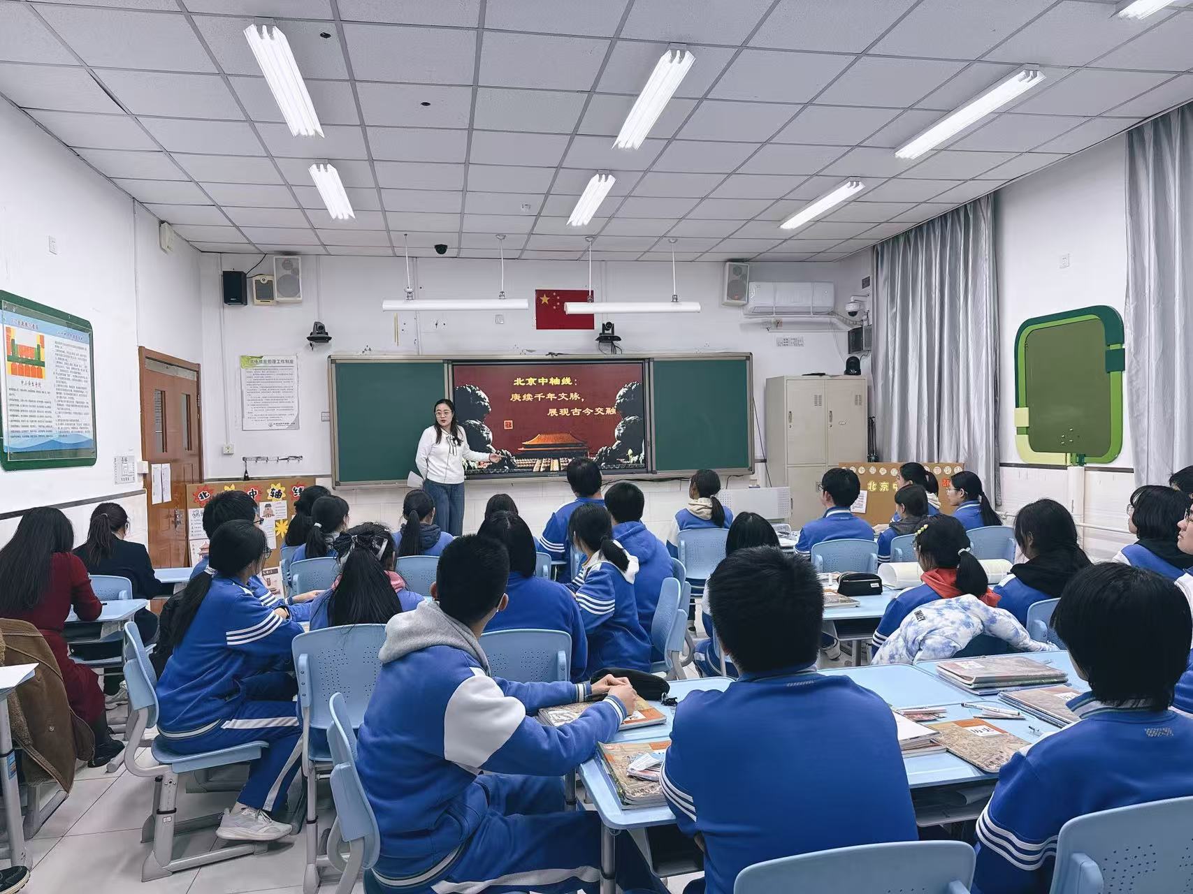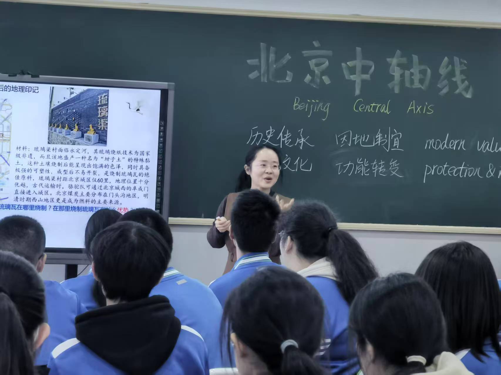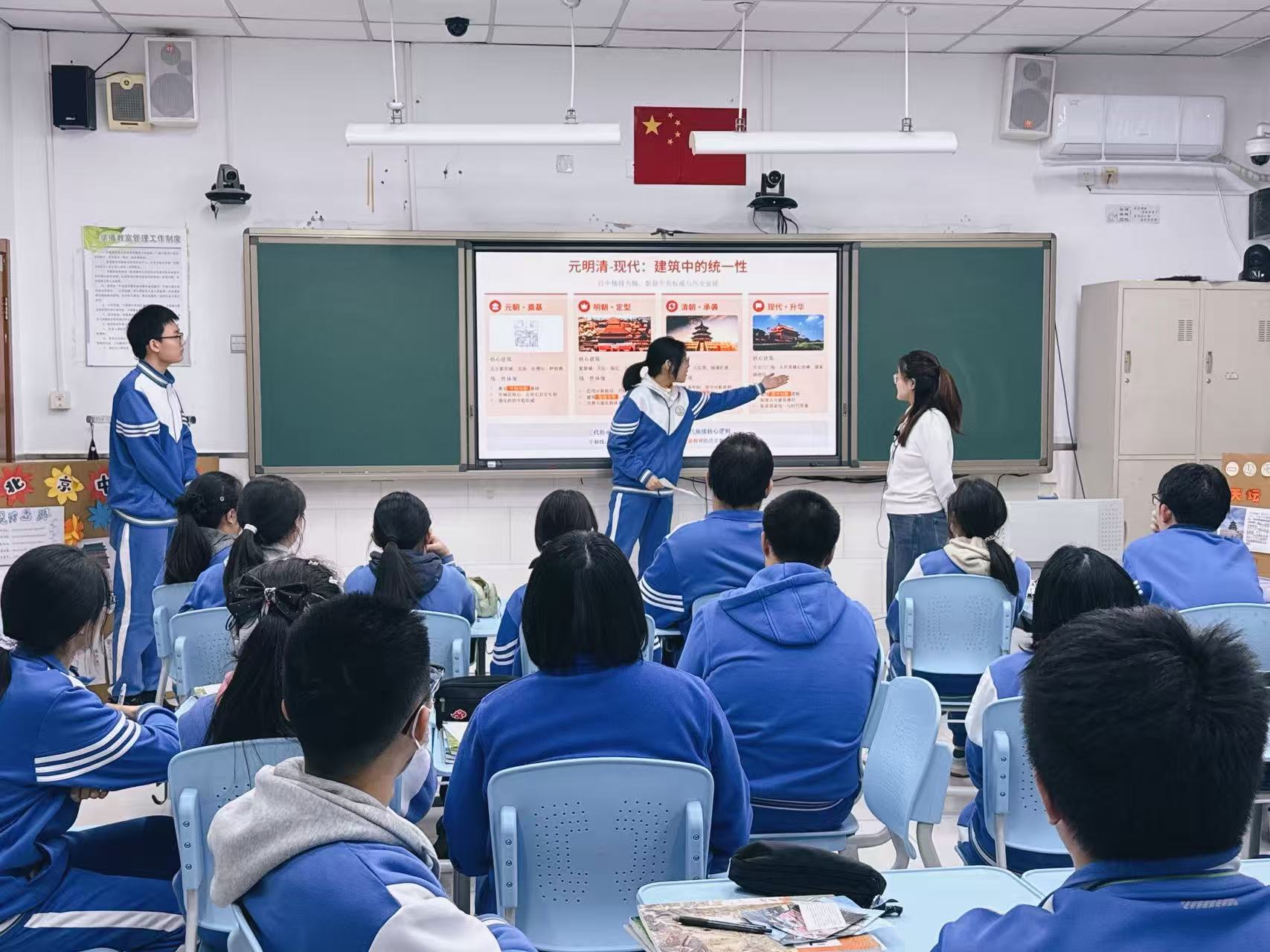 与此同时,莲葩园校区更侧重“解构轴线·联结当代”。课程从“中轴线上的一砖一瓦”讲起,地理教师陈瑶引导学生聚焦建筑材料如琉璃瓦、楠木的来源与运输路线,解读古代“因地制宜”的生态智慧;历史教师郑静舟通过对比元、明、清中轴线格局演变,剖析其承载的国家治理理念变迁;英语教师赵兴星组织学生就“中轴线的现代价值与保护”展开小组合作学习,建构思维框架,推动传统文化与现代生活的创造性联结。