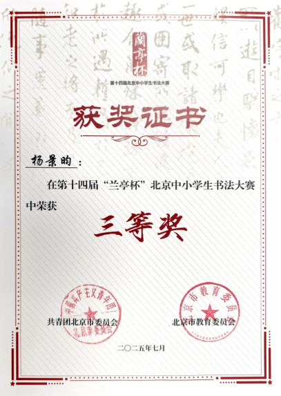 2025年7月,在第十四届“兰亭杯”北京市中小学生书画大赛中,美术社团学子严一漪、杨景昀潜心创作、精准落笔,凭借优质作品脱颖而出,双双荣获三等奖,以笔墨勾勒出文化韵味,彰显了汉字书画的传统魅力。