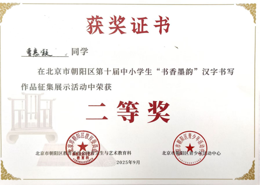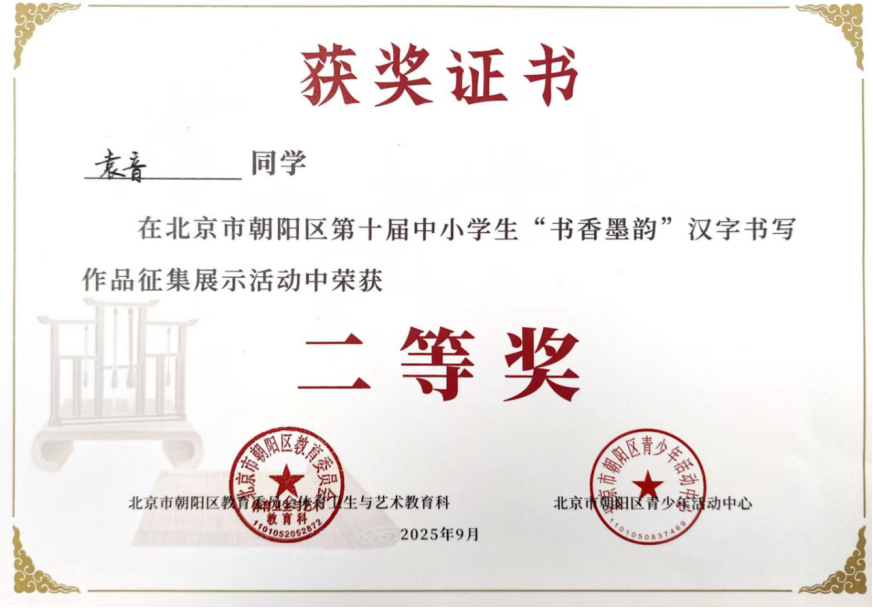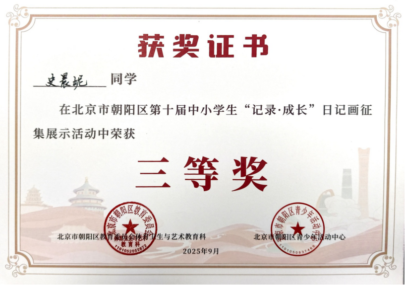 2025年9月,在北京市朝阳区第四届中小学生“光影少年”摄影作品征集活动中,朱一鸣聚焦生活光影,用镜头定格美好瞬间,作品兼具创意与感染力,斩获一等奖;贾睿添深耕摄影创作,精准捕捉场景细节,凭借出色作品荣获二等奖。同期开展的“书香墨韵”汉字书写大赛中,学子们挥毫泼墨,尽显扎实的书写功底:杨景昀字迹工整隽秀,力道匀称,荣获一等奖;严一漪、袁音、曹惠凝笔墨流畅、雅致,均荣获二等奖。在“成长·记录”日记画征集活动中,史晨妮用心记录成长轨迹,其作品细腻生动,荣获三等奖。