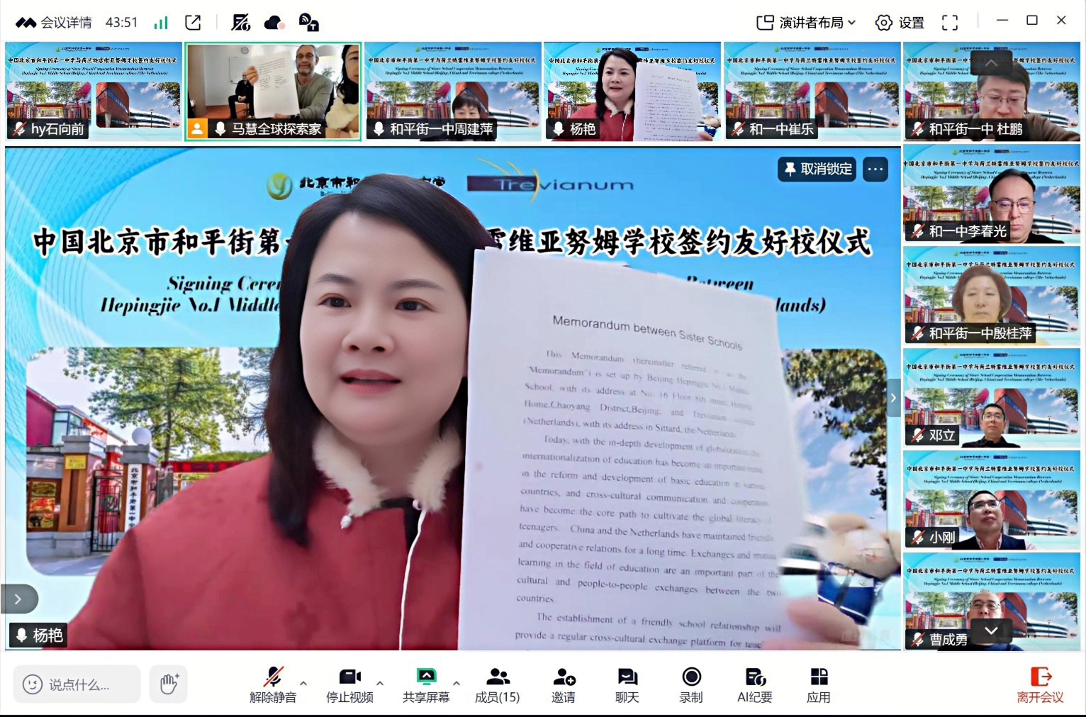 2025年12月9日,北京市和平街第一中学与荷兰Trevianum college特雷维亚努姆学校通过云端形式举行友好校签约仪式,双方学校领导、教师代表齐聚线上,共同见证这一深化国际教育合作的重要时刻。