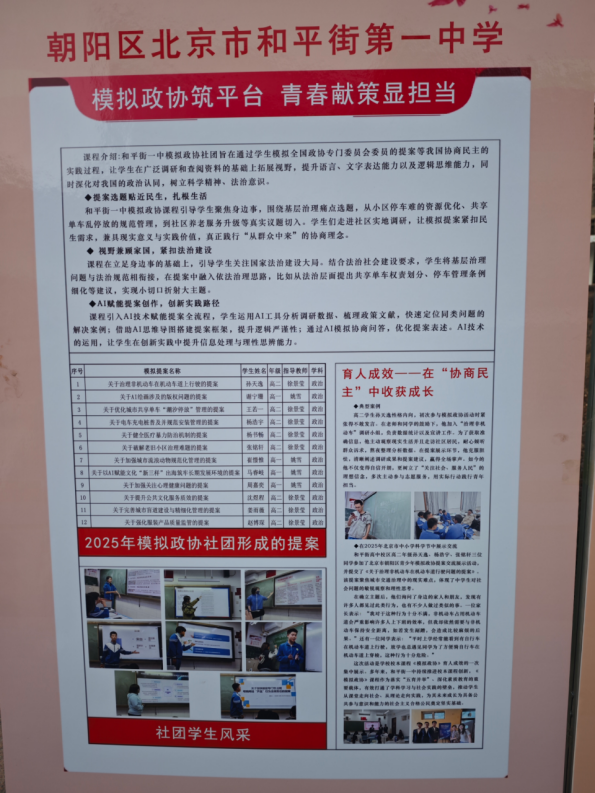 此次活动是和平街一中校本课程“模拟政协”育人成效的一次集中展示。本阶段课程以“小切口、大视野、新工具”为侧重点,引导学生在模拟政协实践中深化政治认同,树立科学精神,培养法治观念,践行公共参与。