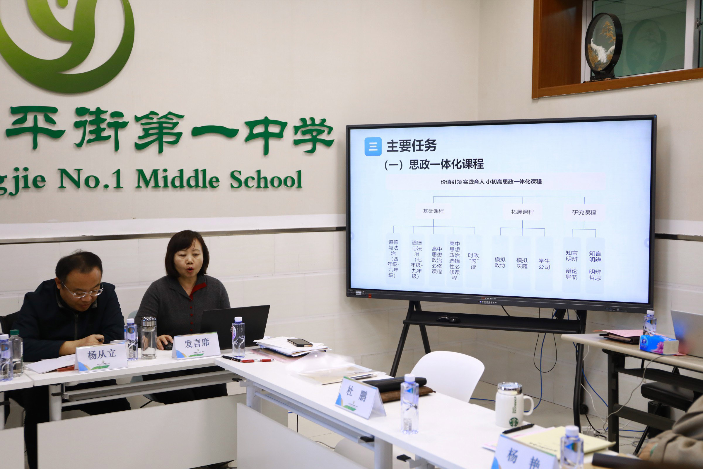 四个学科语文、英语、地理、思想政治教研组长王郁老师、李金花老师、马卫华老师、冯燕玲老师分别以《高中文言文进阶课程的实施路径研究》、《大单元视域下英语文化教学研究与示范基地建设》、《基于核心素养培养的地理学科育人基地校建设》、《价值引领 实践育人——小初高思课一体化建构与实施》为题,聚焦学科教研基地建设目标、任务、工作进展、效果等进行了系统汇报。