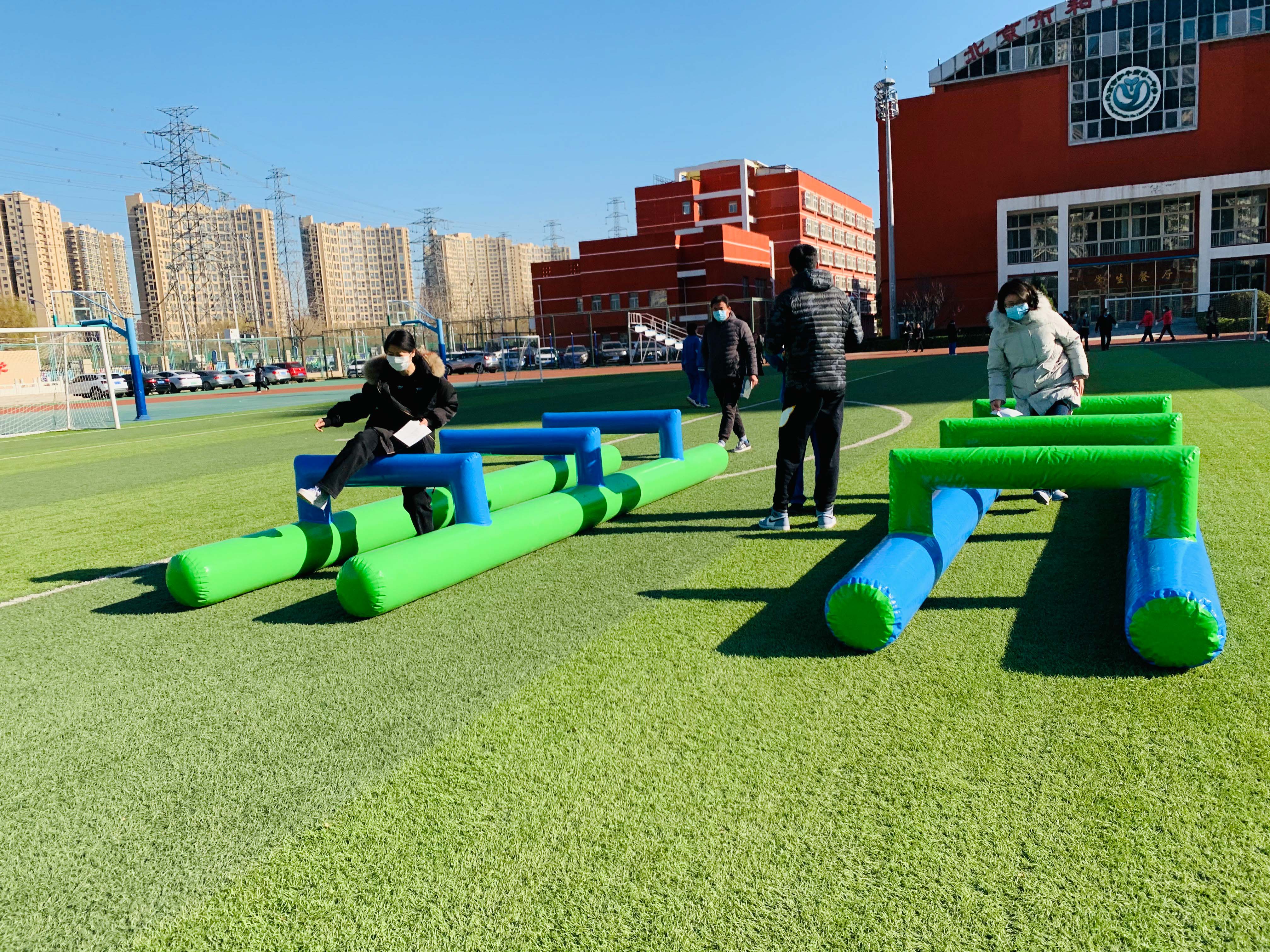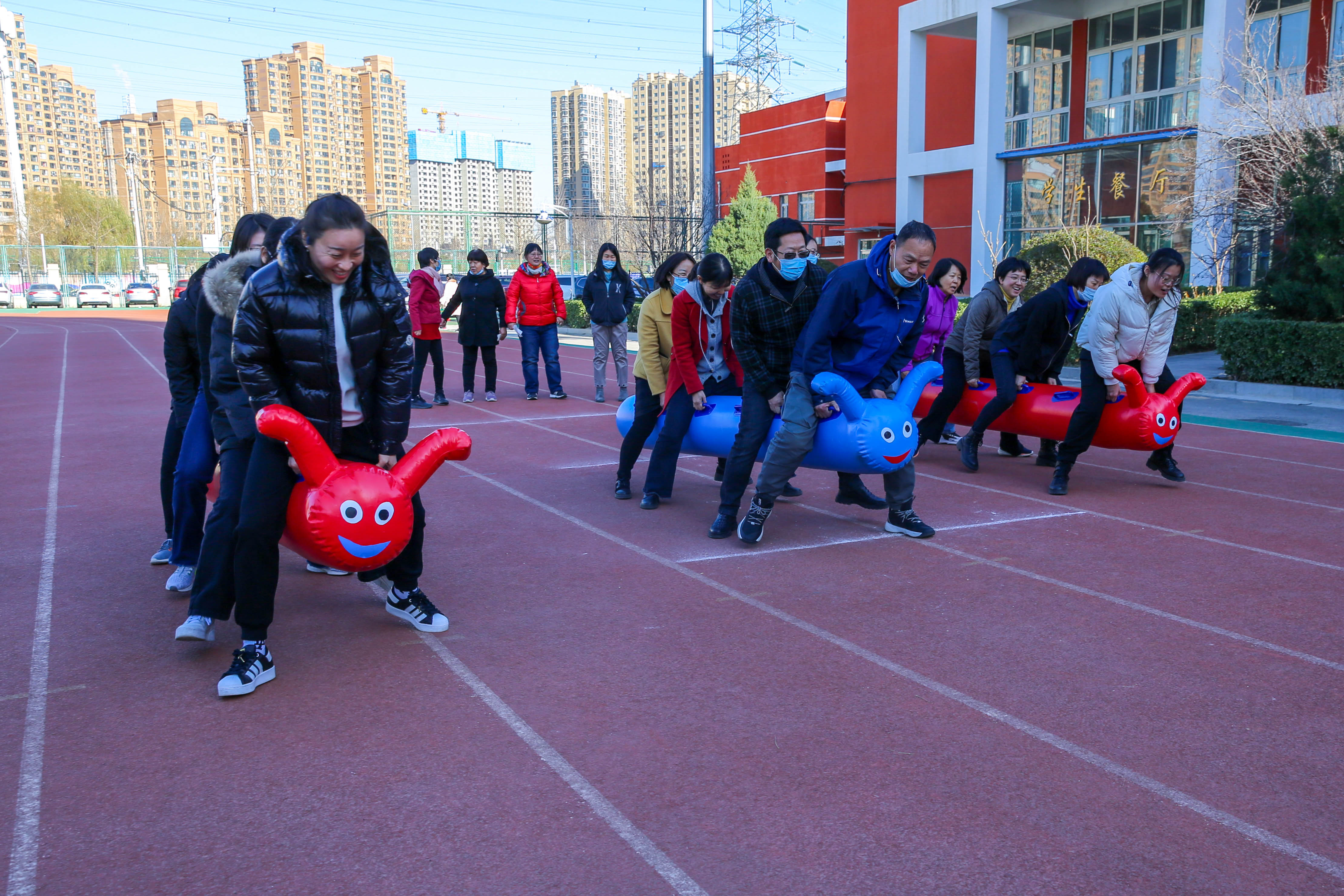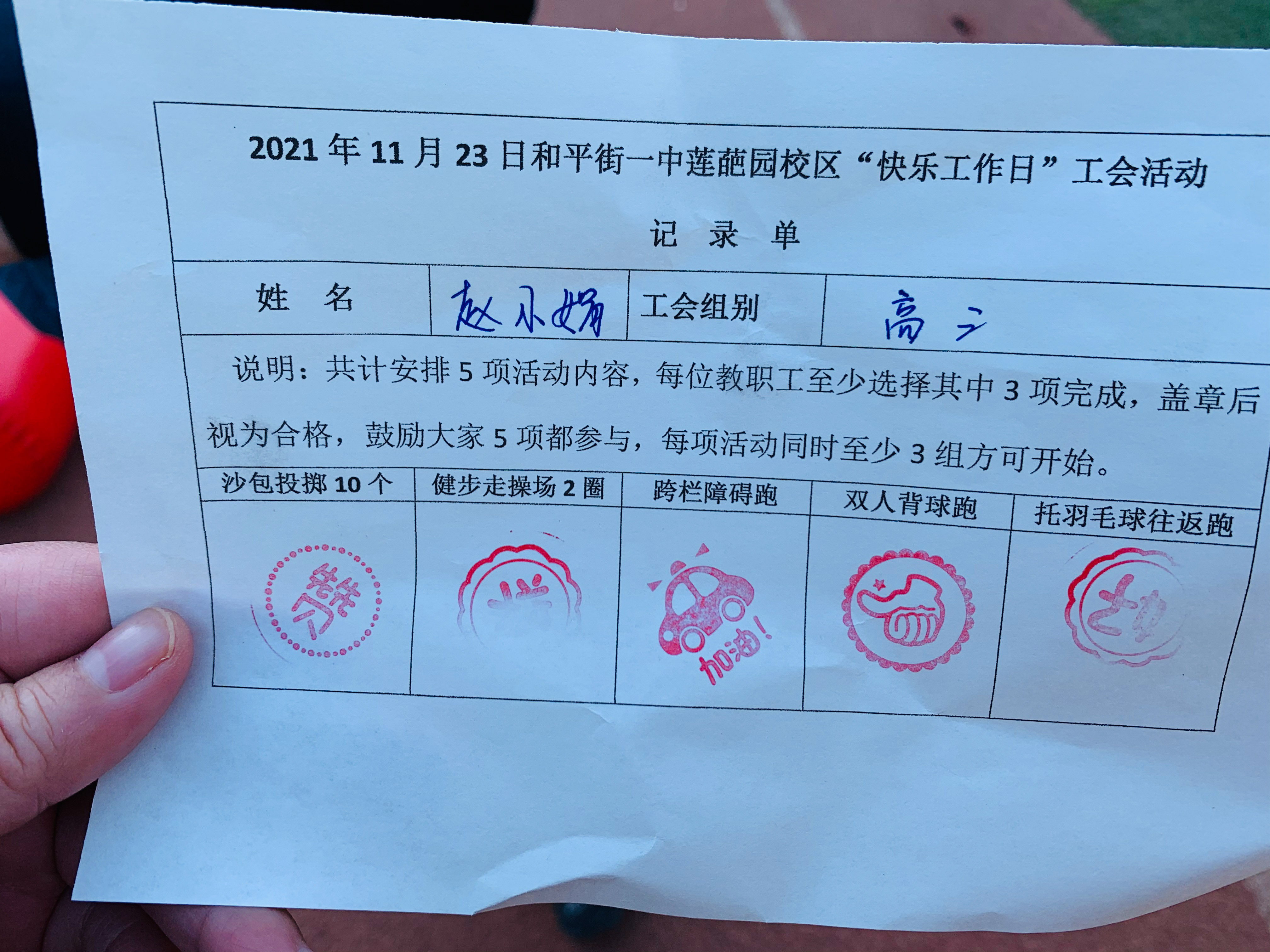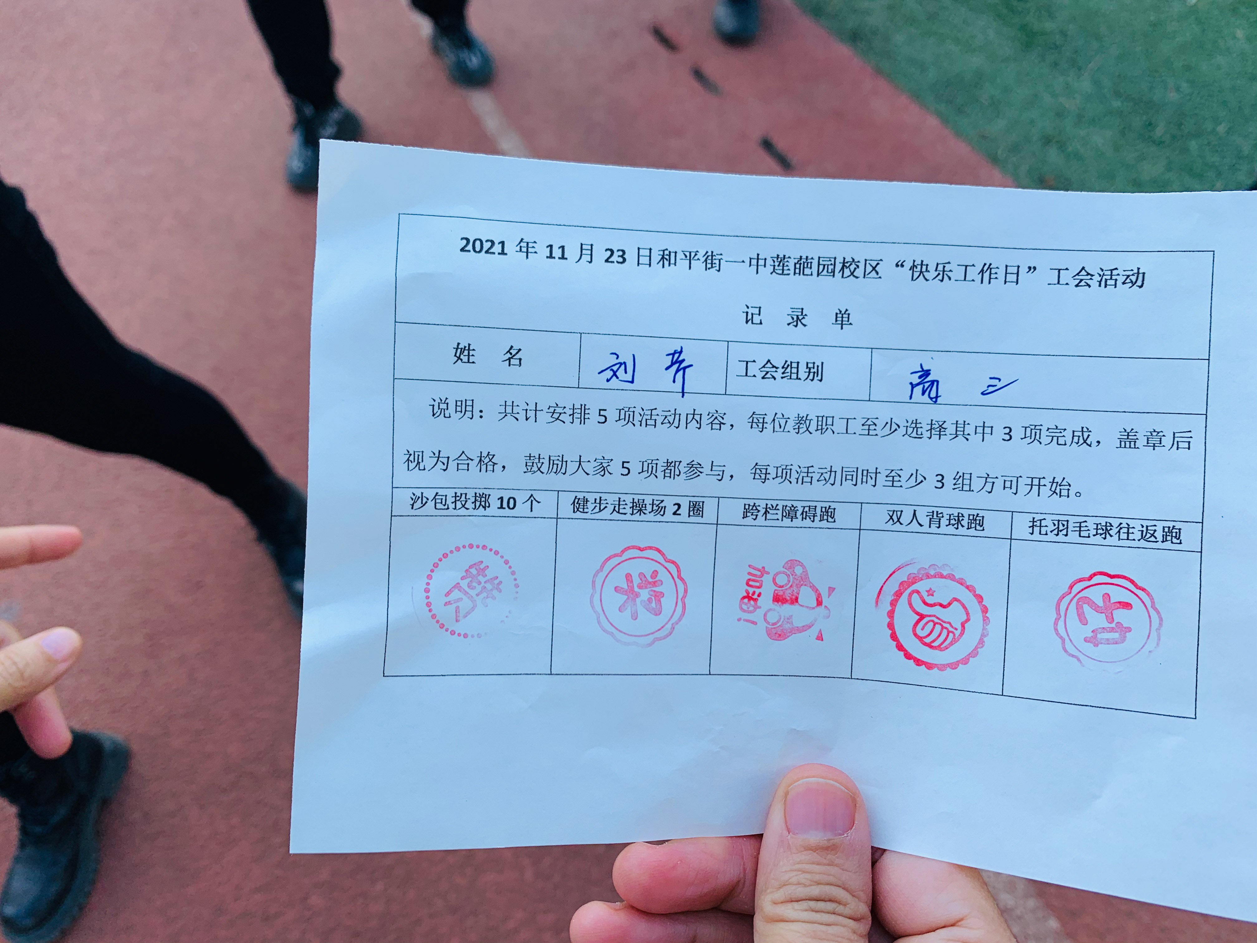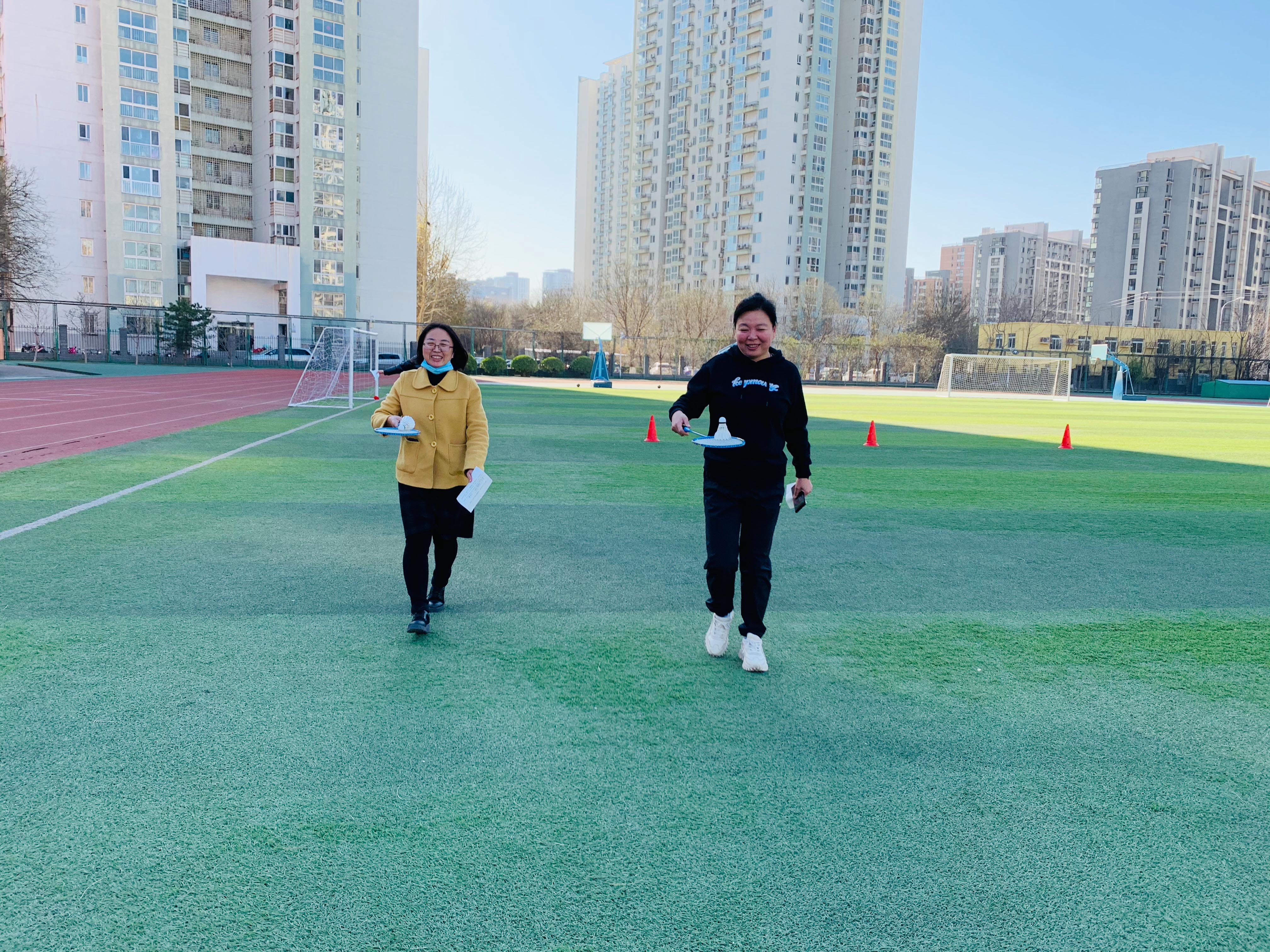 活动伊始,由校办主任向志愿者裁判讲解活动规则,并下发记录单,比赛在轻松愉悦的氛围中拉开帷幕。本次活动共设置五项内容,分别是沙包投掷,健步走,跨栏障碍跑,双人背球,托羽毛球往返跑。教师们结合自身身体状况,至少选择其中三项完成才视为合格。各工会组在组长的带领下,以饱满的热情,昂扬的斗志积极参与,飞扬的沙包,矫健的步伐,都为和一校园平添了几许风景,操场上处处洋溢着老师们的欢声笑语。最后是集体项目——毛毛虫跑,步调一致,口号震天的毛毛虫骑行把整场的气氛推向了高潮,选手们以蓬勃的精神面貌去迎接胜利的喜悦。