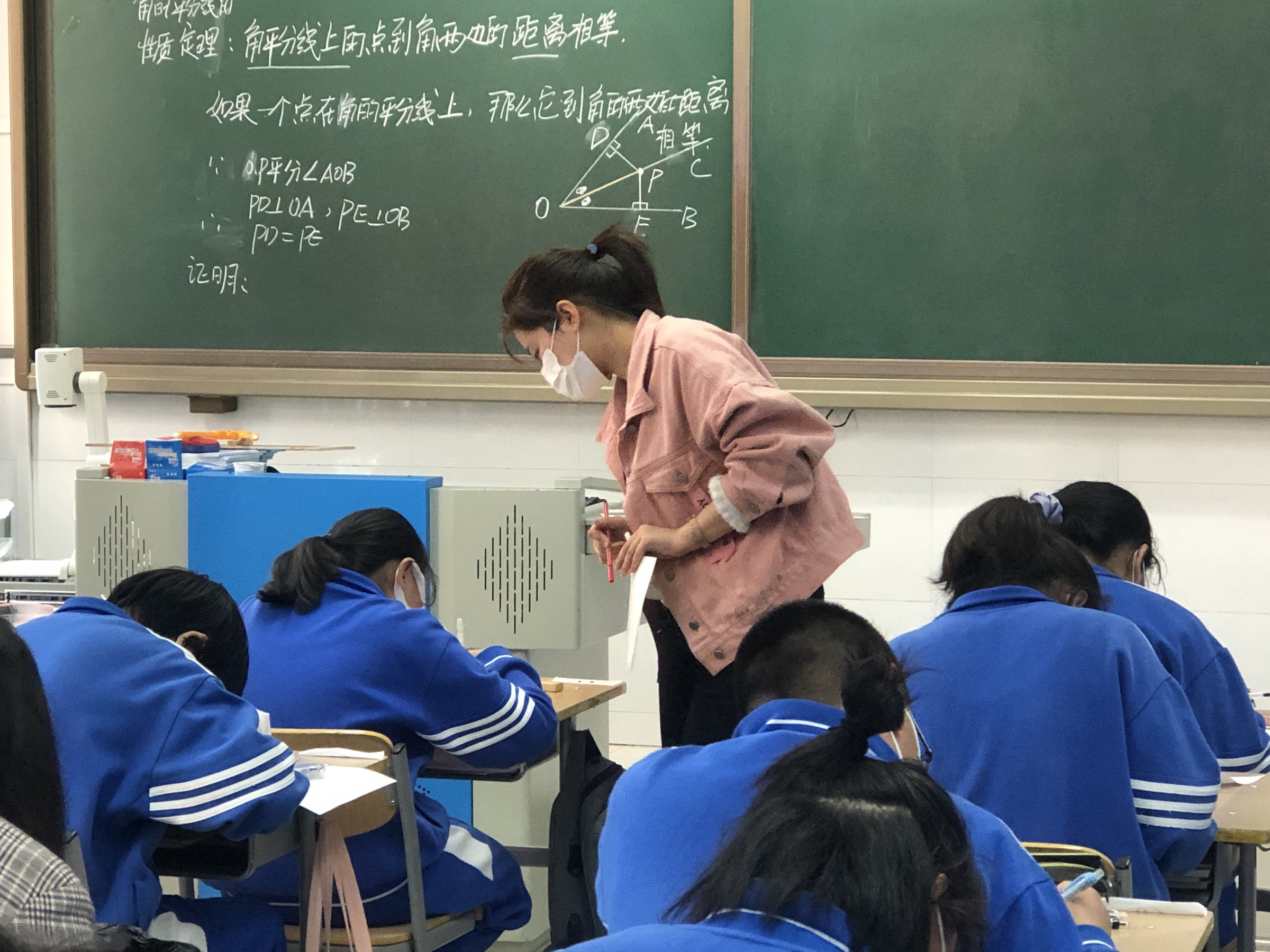 2020年10月15日下午第一节课,在数学组各位老师的指导和帮助下,青年教师赵媛媛带领初二5班的学生进行《角的平分线的性质》研究课的学习。课程内容主要采用动手操作、直观模型的观察以及讨论交流等教学方法,依托折纸带领学生亲身经历角的平分线的性质定理的生成,有效增强学生对角以及角的平分线的感性认识,提高学生对新知识的理解和感悟。整个过程充分发挥学生的主体作用,在折纸中让学生知道角平分线的性质“是什么”,通过折纸和严格的数学证明知道它 “从哪儿来”,通过课后练习以及后面的课程,让学生知道它又要“到哪里去”,让学生完整经历角平分线性质的探究过程:观察→猜想结论→实验验证→推理论证。赵老师精心备课,积极向经验丰富的教师请教,反复打磨;在课堂上有效组织学生开展探究活动,总结收获,很好地完成了教学内容,积极提升自身的教学水平。
