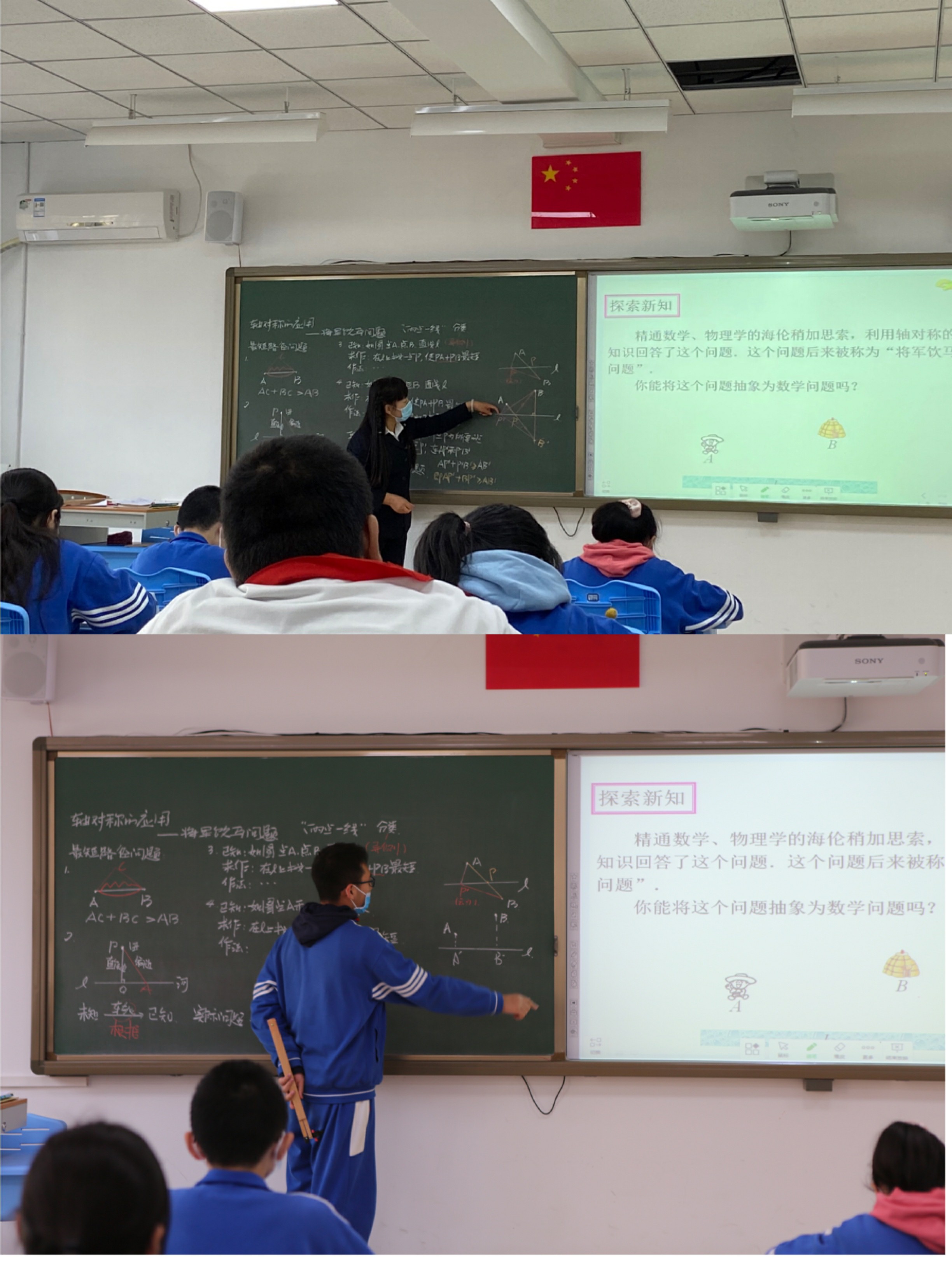 第二节课由特级教师贾海荣老师执教,内容是《轴对称的应用——将军饮马问题》,立足单元整体教学,搭建“将军饮马问题”的最短路径的思维模型,突破了教学难点。