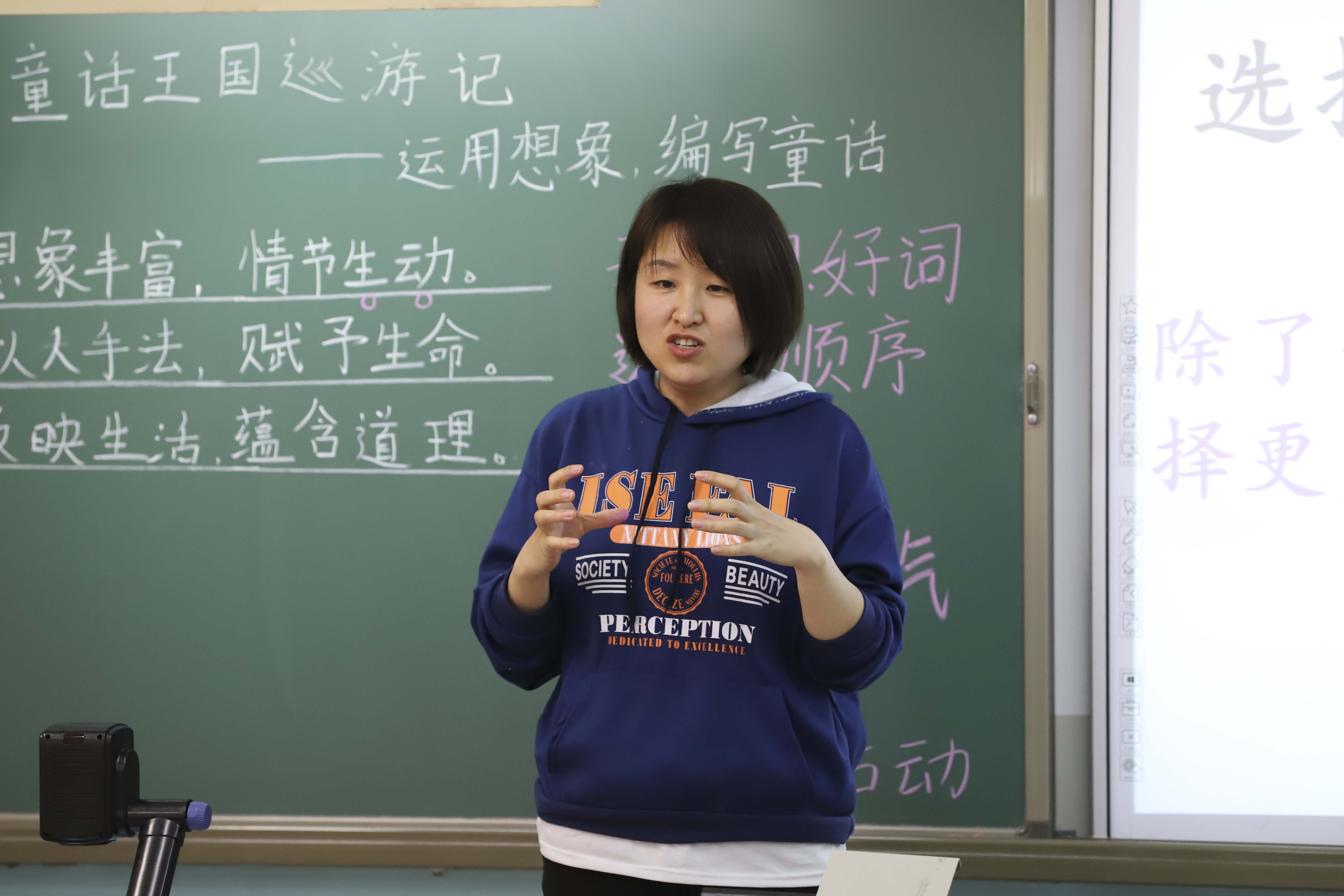 第二课时,赵迎楠老师引导孩子们对自己创作的童话进行品评修改。赵老师首先带领孩子们回顾了生动表达的方法:运用生动的形容词;表达要按照一定的逻辑顺序;综合运用语言、动作、神态、心理等描写方法。赵老师采用小组积分的方式调动孩子们的学习热情。同学们小手如林,热情高涨。在赵老师的精心设计与引导下,同学们在情节创意和生动表达两方面都有了全新的思考和突破。在赵老师启发式的教学中同学们文思泉涌,再一次全情投入到童话创作之中。紧接着,赵老师依次请了三个小组的同学到前台向大家展示自己的童话作品。同学们兴味盎然的读着自己的作品,眼神中透着骄傲和自豪。下面的同学也听得津津有味,感受着童话的神奇魅力。