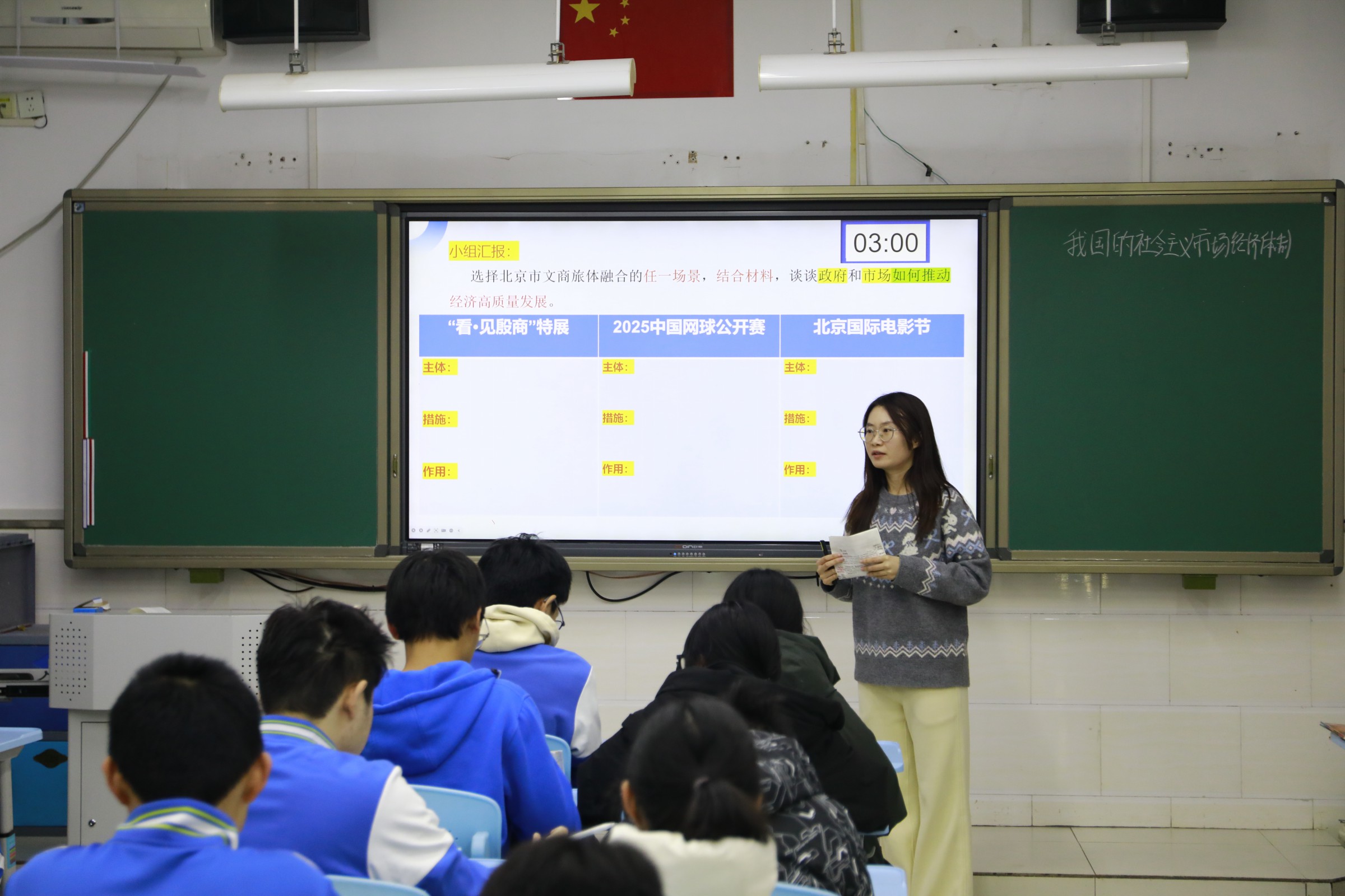 思想政治高瑞泽老师以《我国的社会主义市场经济体制》为题,以北京商旅体“融”出圈案例为时政切入点,通过时政深研、知识梳理、典例练习等环节,引导学生结合北京实际分析市场与政府作用,并在典型例题演练中进一步深化对我国社会主义市场经济体制的理解。