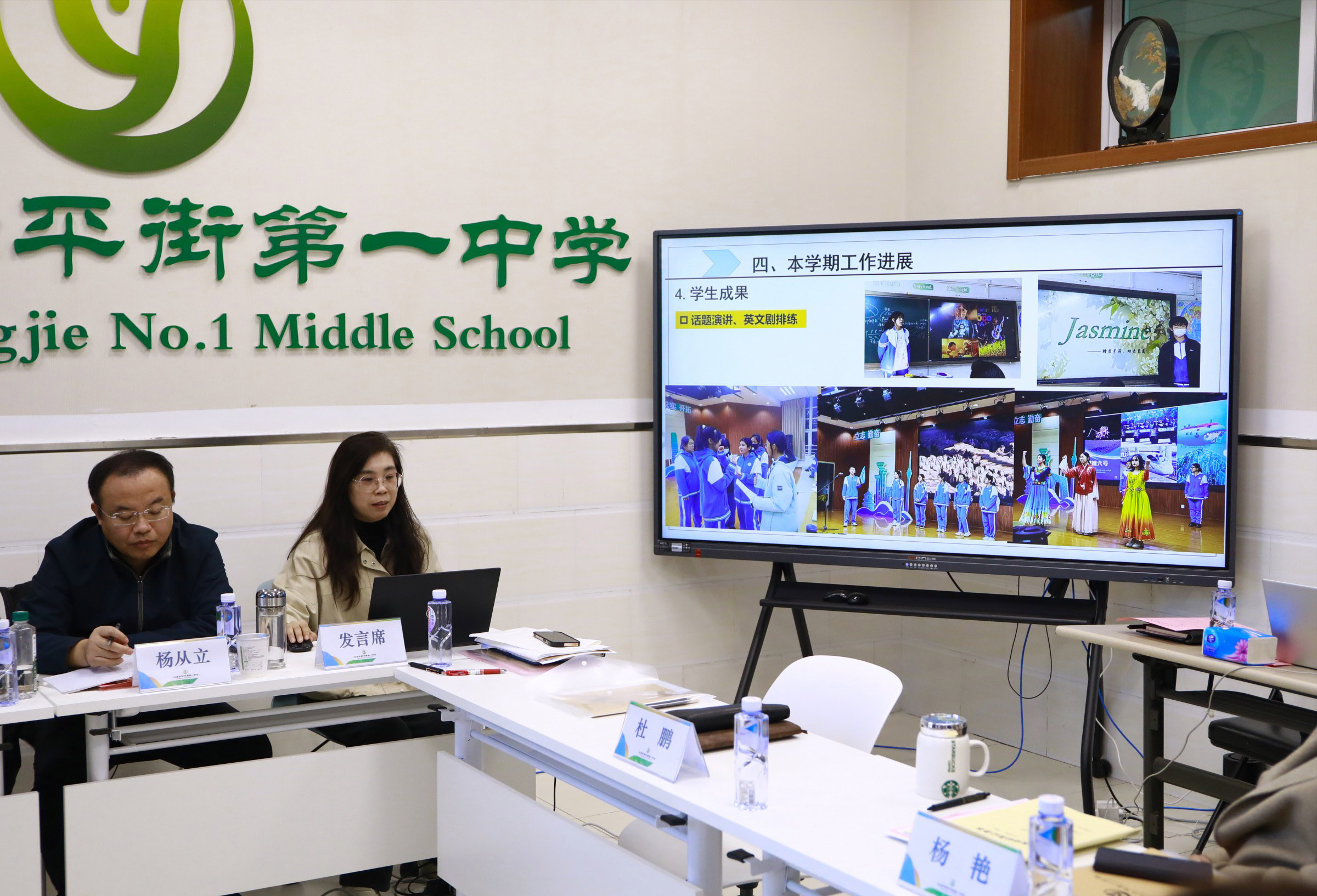 四个学科语文、英语、地理、思想政治教研组长王郁老师、李金花老师、马卫华老师、冯燕玲老师分别以《高中文言文进阶课程的实施路径研究》、《大单元视域下英语文化教学研究与示范基地建设》、《基于核心素养培养的地理学科育人基地校建设》、《价值引领 实践育人——小初高思课一体化建构与实施》为题,聚焦学科教研基地建设目标、任务、工作进展、效果等进行了系统汇报。