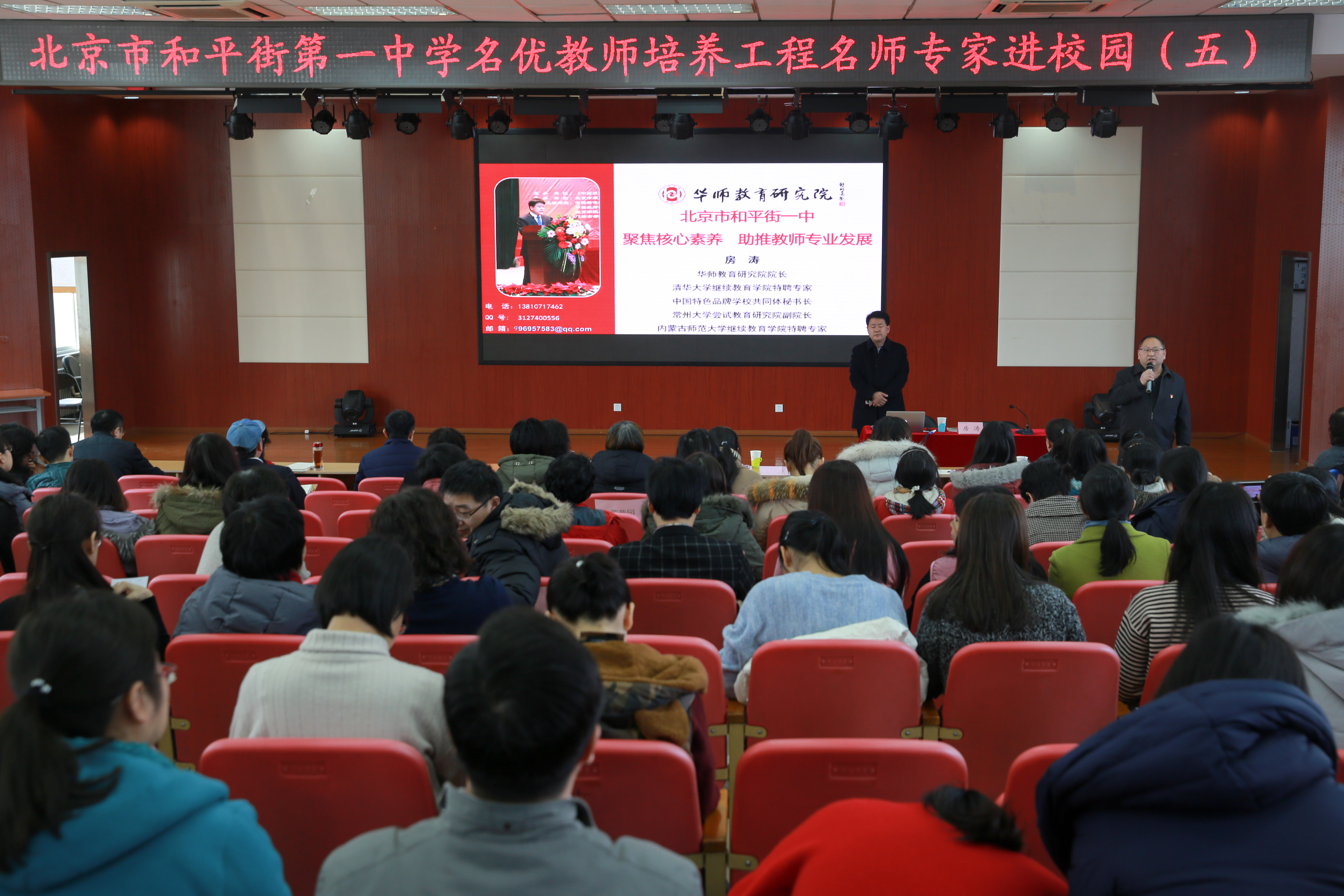 2018年2月25日,在新学期来临之际,和平街一中在北苑莲葩园校区举行了“名优教师培养工程”之“名师专家进校园”培训系列的第五次活动。华师教育研究院院长房涛应邀前来为全体教师做了一次题为“聚焦核心素养 助推教师专业发展”的讲座。学校党总支曹高仁书记主持了本次活动。