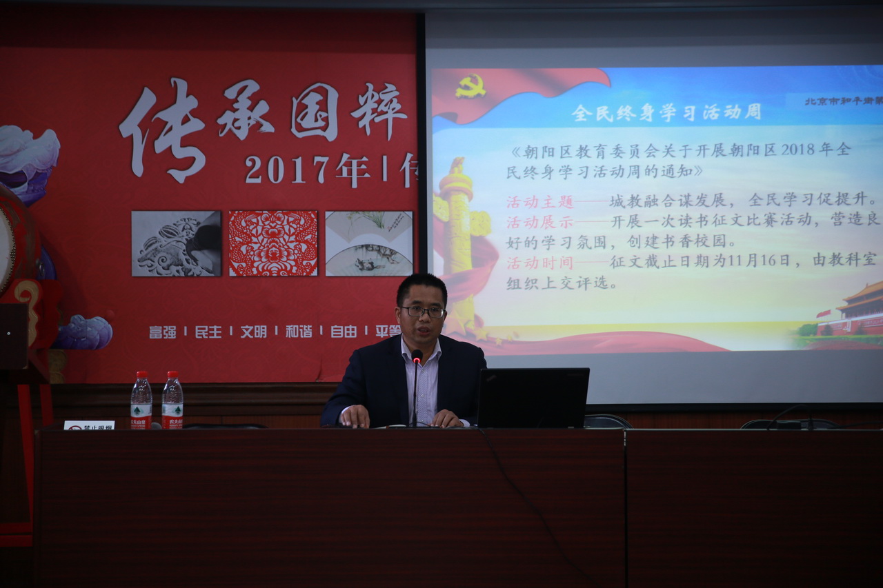启动仪式分别在和平街高中校区、和平街初中校区、北苑莲葩园校区、朝来校区、北苑清友园校区五个校区同步进行,分别由校长助理张习文、校区主管副校长邹小刚、德育副校长杜鹏、校区主管副校长张景鲜、校区主管副校长殷桂萍主持,五个校区全体教职工参加了大会。几位校领导分别在各校区解读了本年度全民终身学习活动周工作计划,对活动宗旨、活动主题、领导组织机构、活动时间与内容、活动要求进行了详细说明。