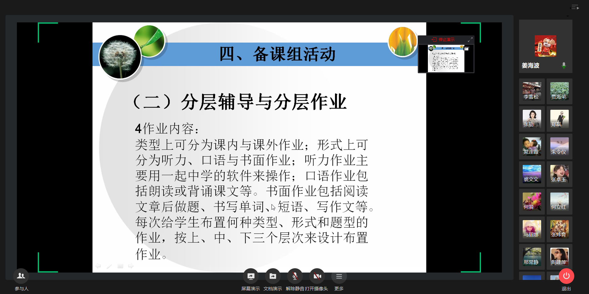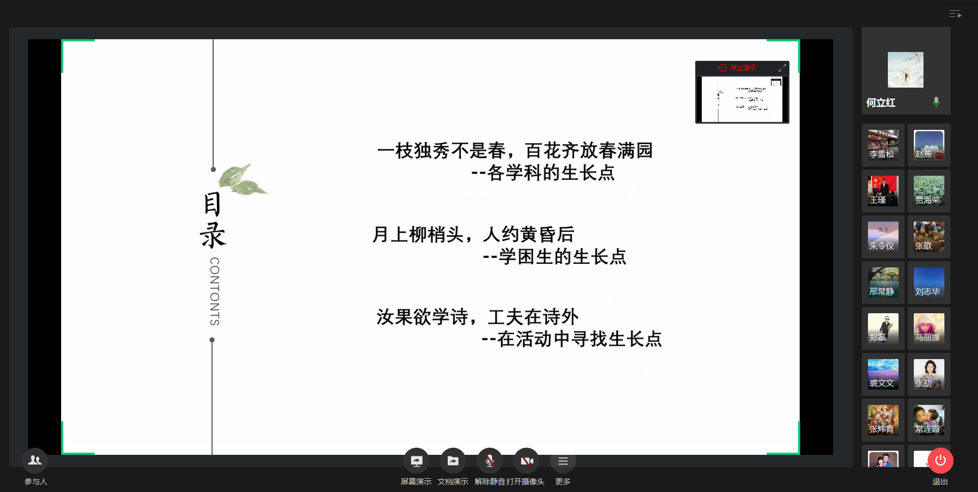 5月19日年级组长李雪松从年级层面整体分析了前一阶段线上教学的情况,提出任课教师要与班主任团结合作为即将到来的返校复课打好基础、做好衔接。任课教师们从学科教育教学的角度进行了详细的分析。语文备课组长张歌老师介绍了学生读书活动。数学备课组长贾海荣老师提出要激发学生内驱力。英语备课组长姜海波老师指出要着力提高学生阅读能力。生物备课组长赵燕老师认为下一阶段要以夯实基础为主。历史周烨老师提出逐步培养学生解读史料的能力。政治邢常静老师提出对时事动态的关注力度需再加大。