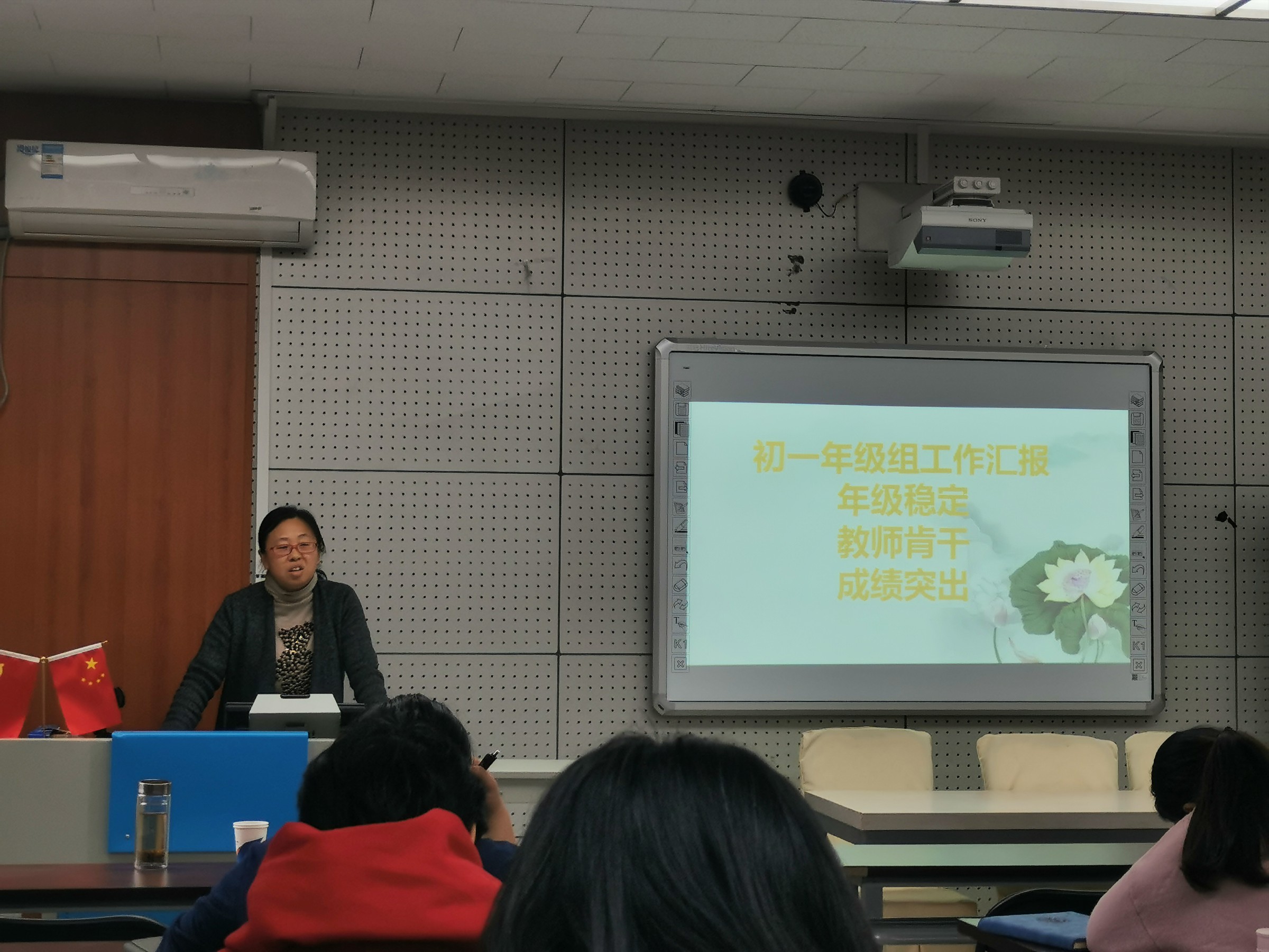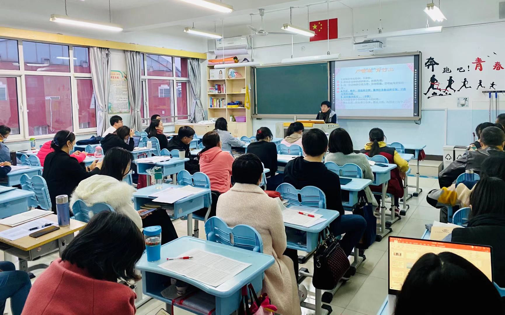会议开始,年级组长首先回顾了前半学期年级的整体情况,初一年级组长陈立娟老师分别从班主任和任课老师两个方面对年级的工作状态进行了总结:班主任用心、用力、各具特色,并梳理展现了各班管理特色;任课教师做到“初一学生初三教”,牺牲休息时间抓学生落实。肯定了各位教师工作的同时,陈老师提出了下一阶段的工作任务,由分析一个简单的多音字“看”的深刻内涵告诫各位老师如何在教育教学中做到心中有数,手中有法。最后陈老师针对年级存在的问题提出:狠抓常规,向课堂要效率;关注作业上交情况,利用一切可利用的时间抓个别生;通过“抓两头,促中间”实现整体的提升和进步,为更好迎接期末做好准备。